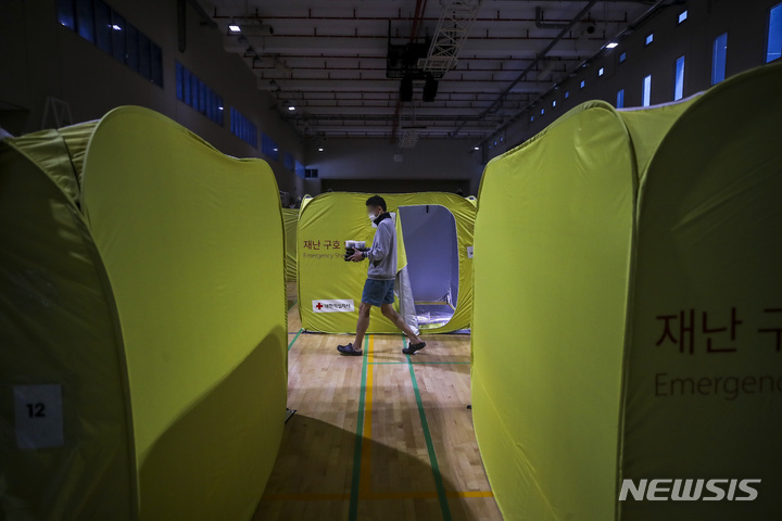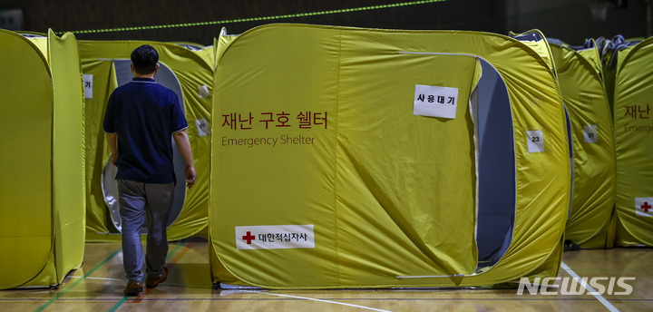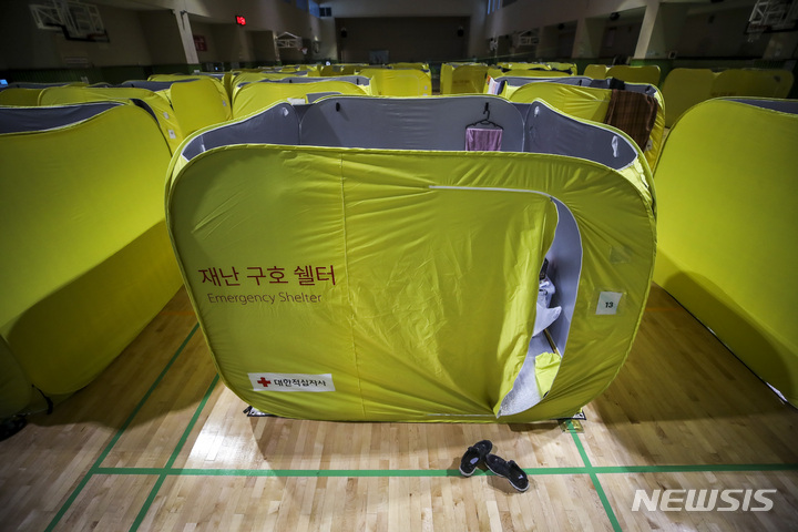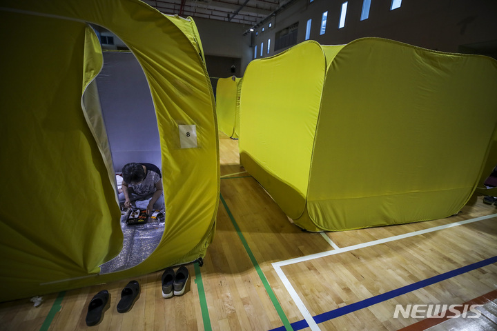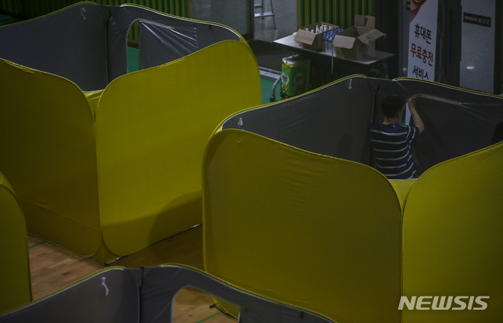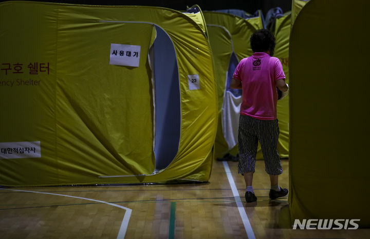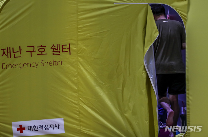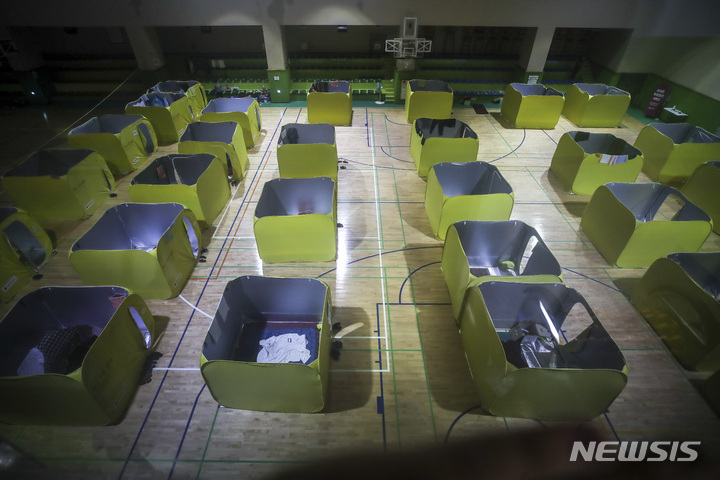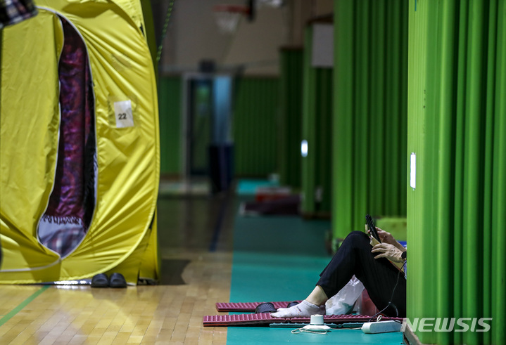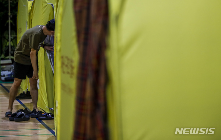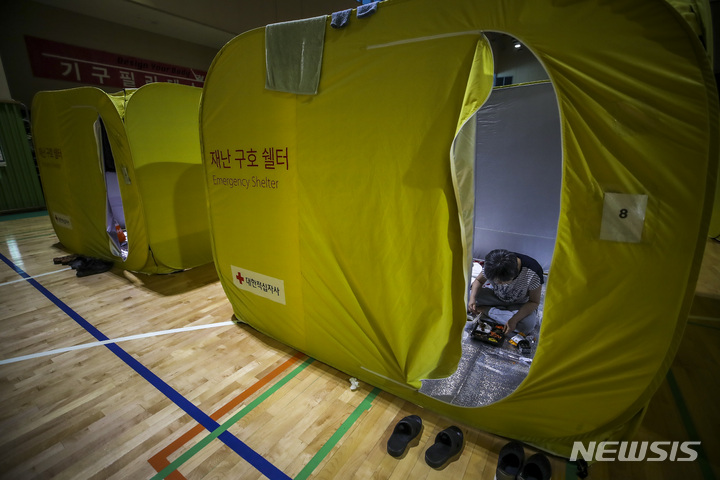 16日午前、ソウル市銅雀区の舍堂総合体育館に用意された被災者避難所で、水害の被災者が休みを取っている様子。