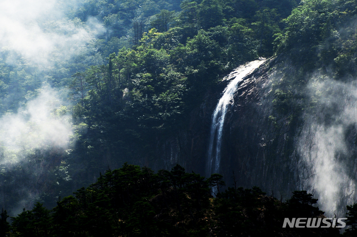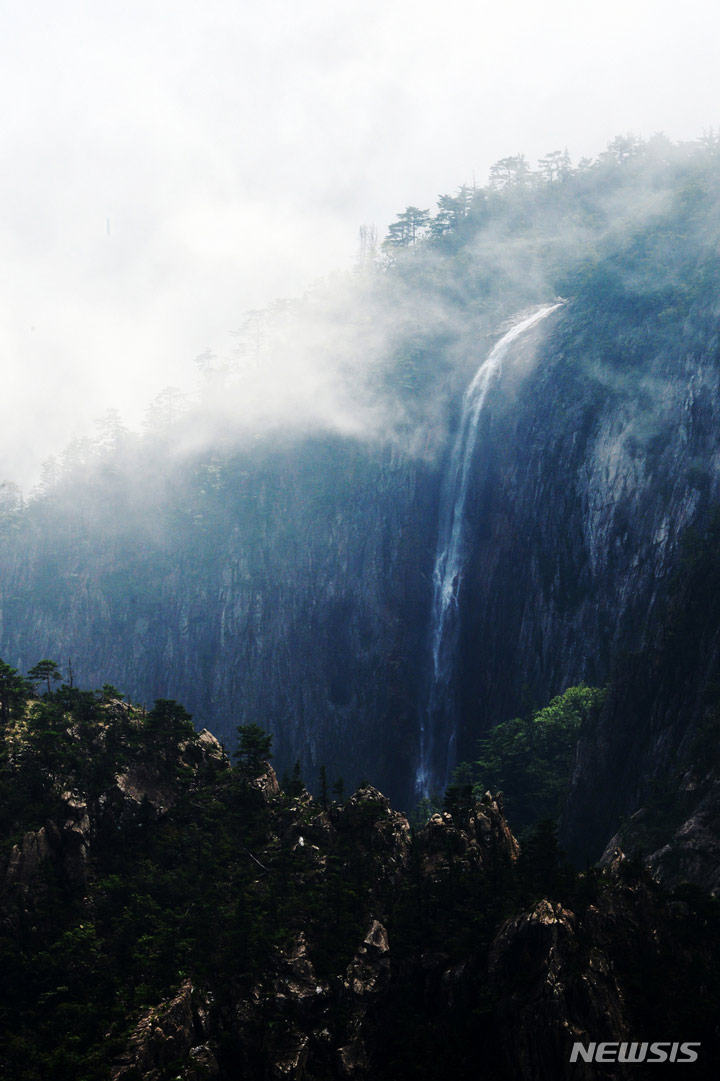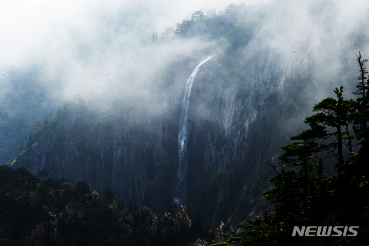 18日午前、雪岳山国立公園(江原道)権金城展望台に近い山すそで、雲の合間から姿を現した「土王城瀑布」から涼し気に水が流れ落ちている様子。