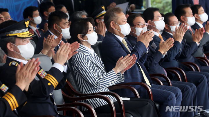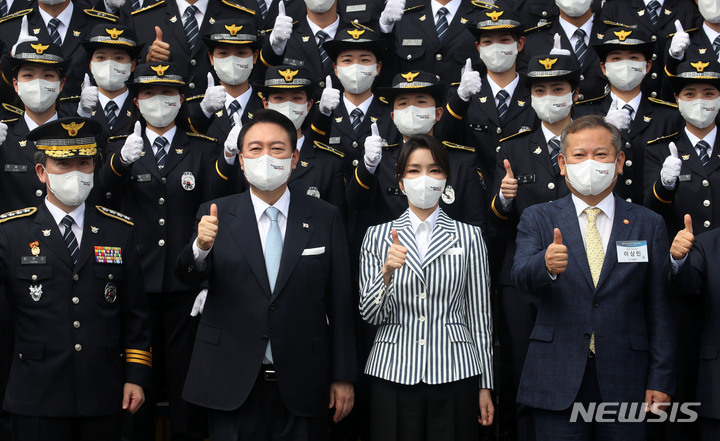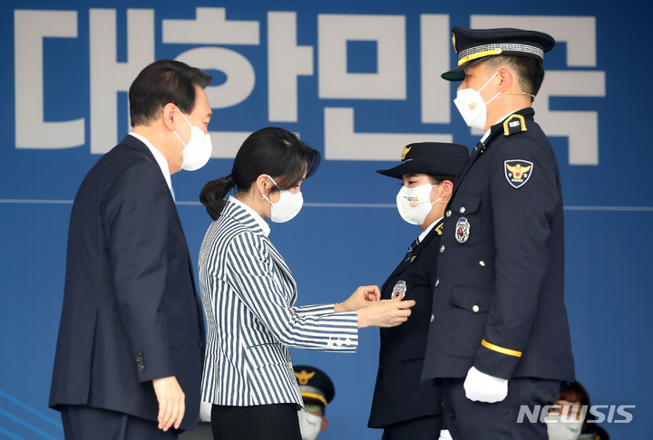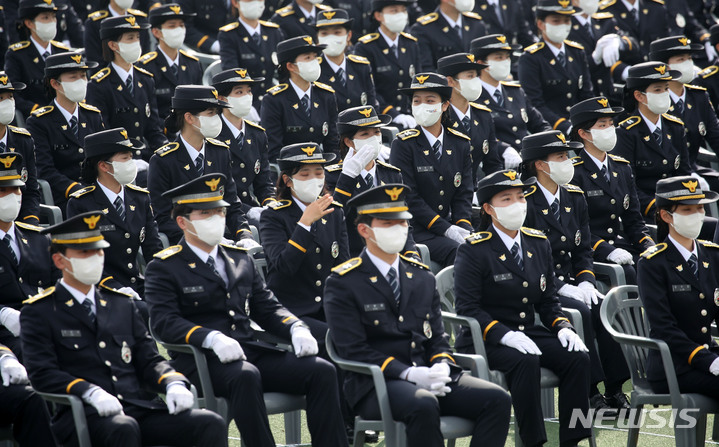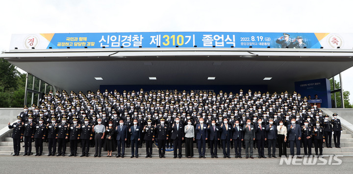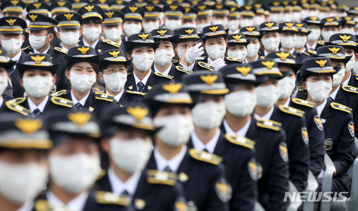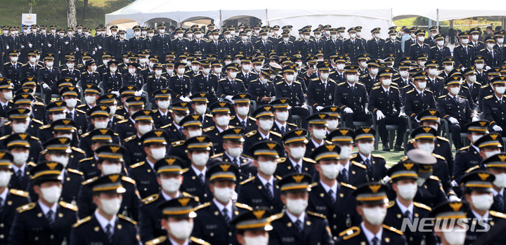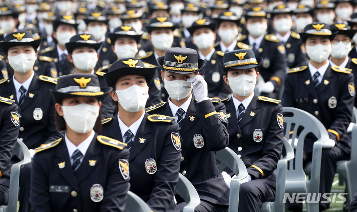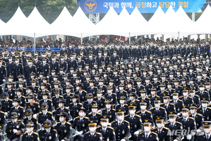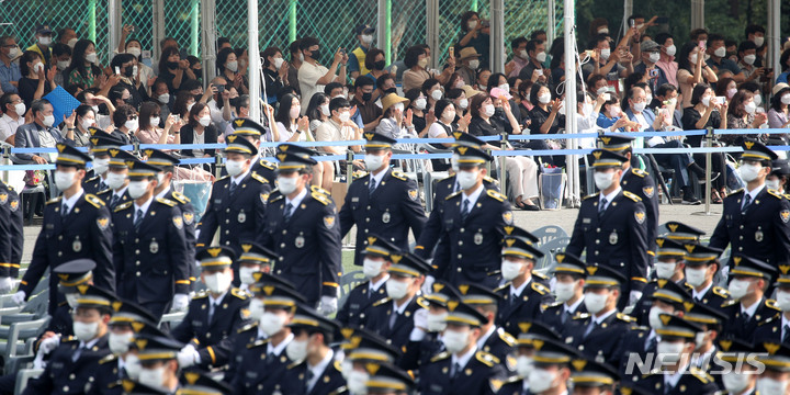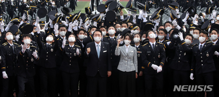 忠清北道忠州の中央警察学校大運動場で19日、同校の第310期卒業式が開かれ、卒業生らが尹錫悦(ユン・ソンニョル)大統領に向かって挙手の敬礼をしているところ。