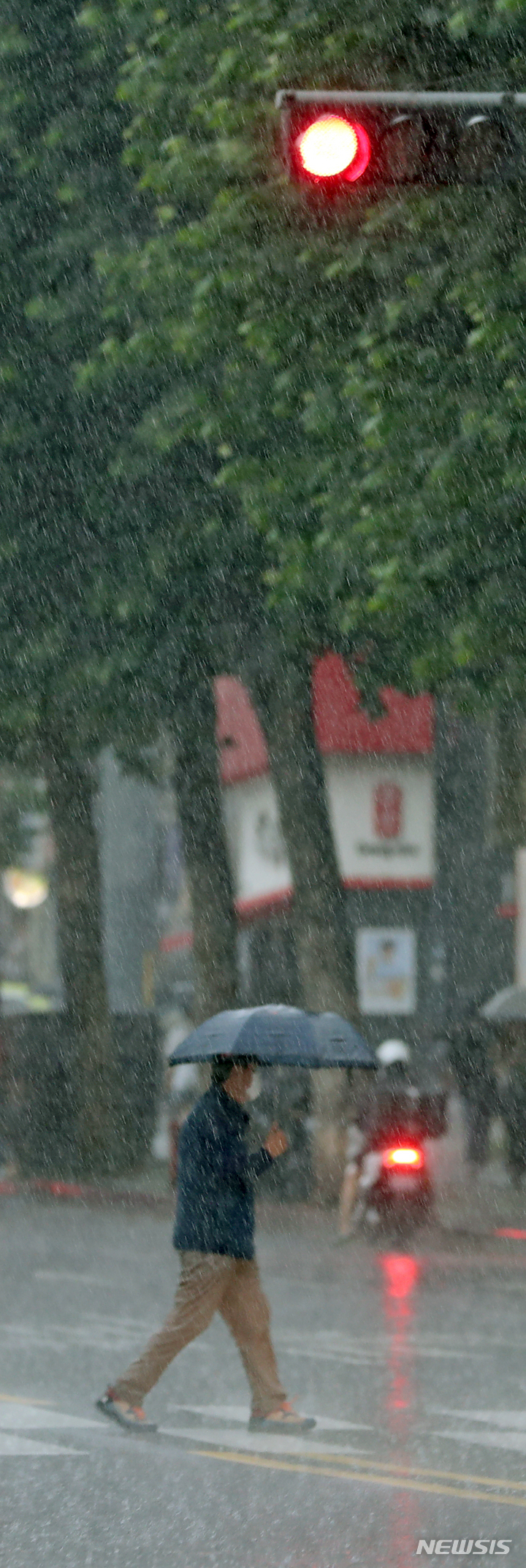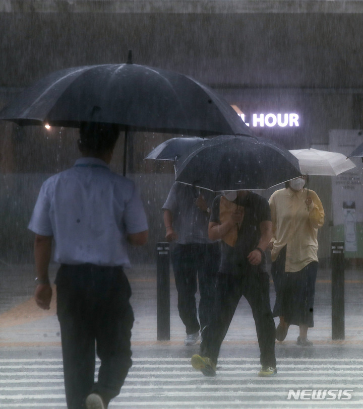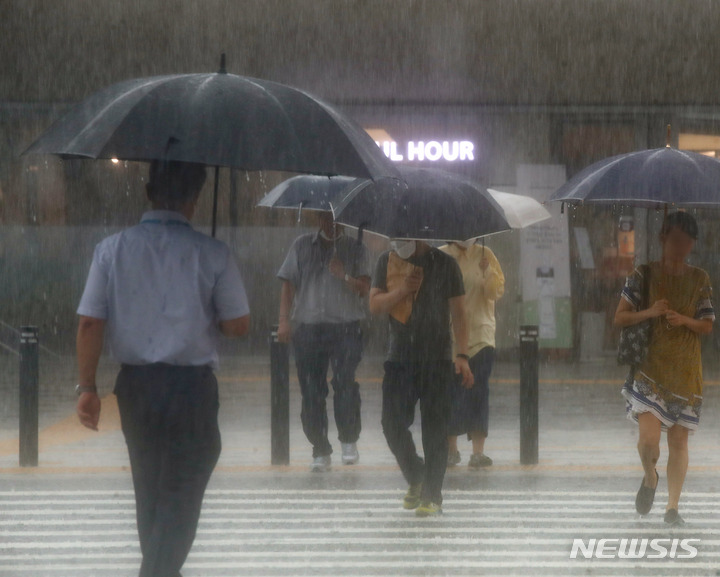 ゲリラ豪雨が降った19日午後、ソウル市内の街角にて、雨傘を差して横断歩道を渡る市民の様子。