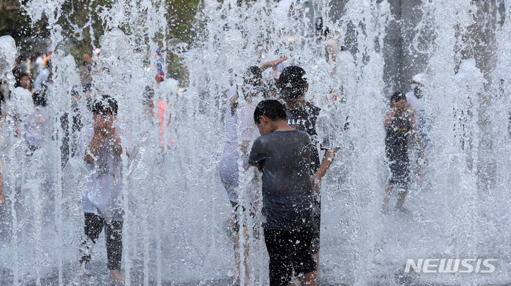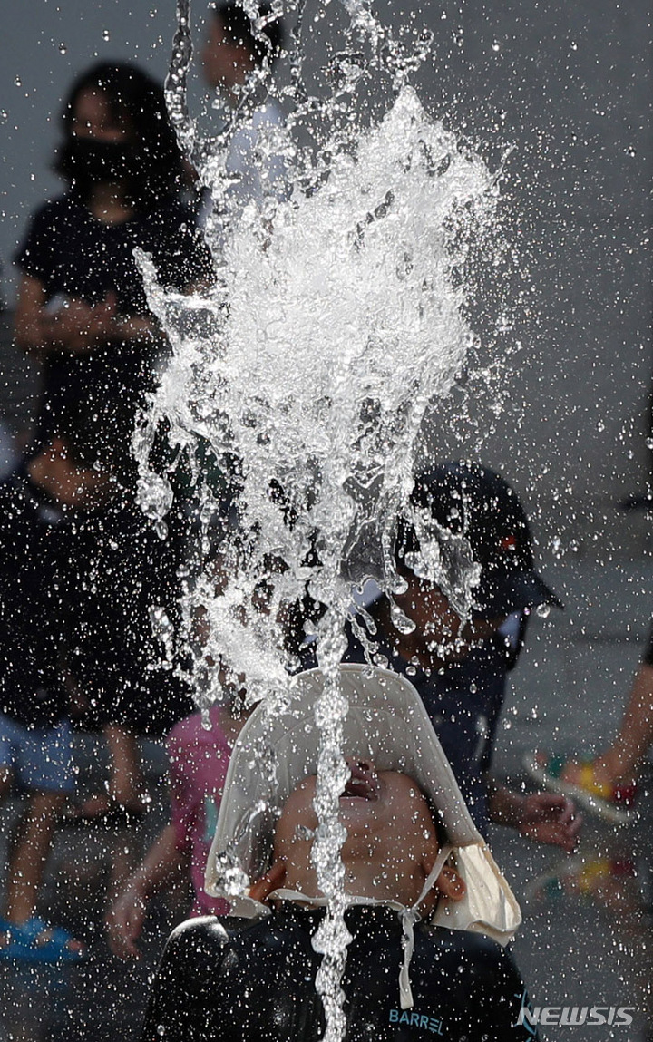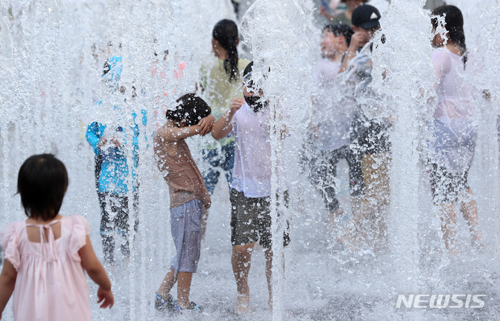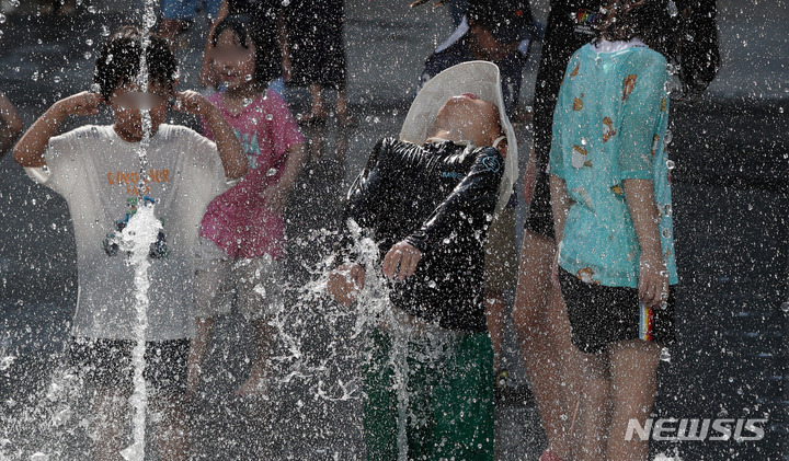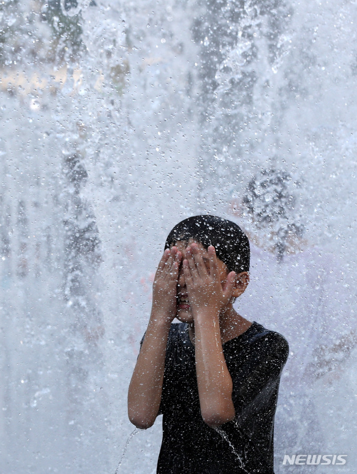 猛暑注意報が発令された20日午後、ソウル市鍾路区の光化門広場噴水台で、涼やかに噴き出す水を浴びて暑さを紛らわせる子どもたち。