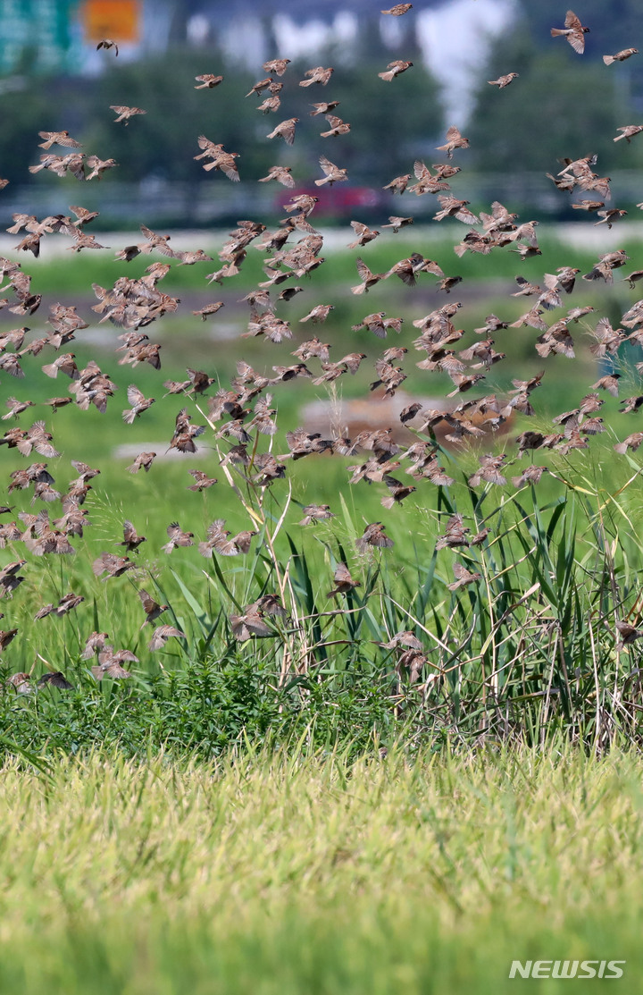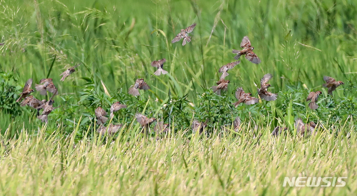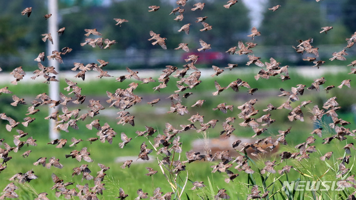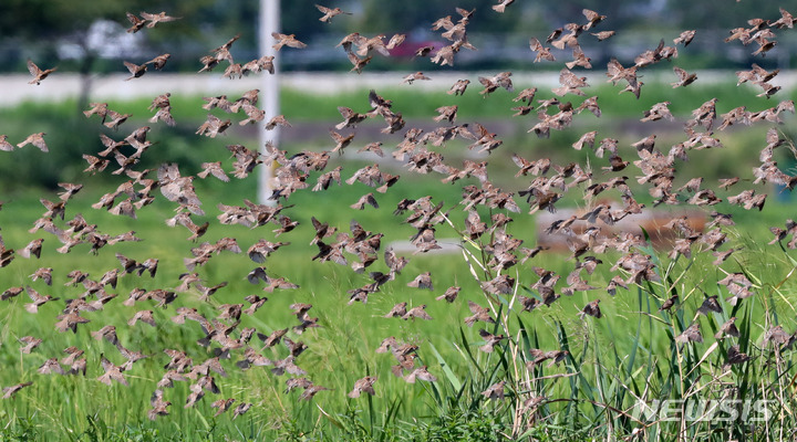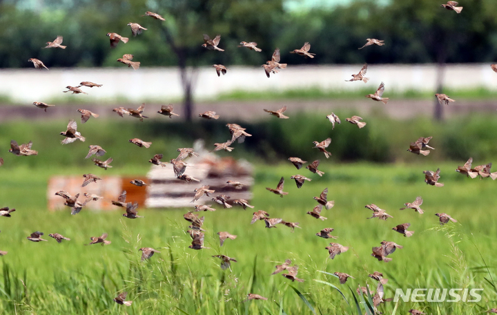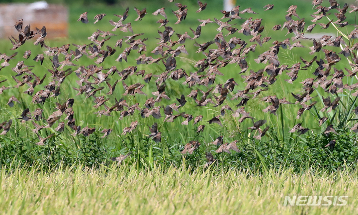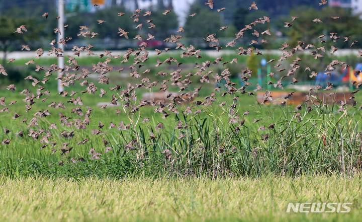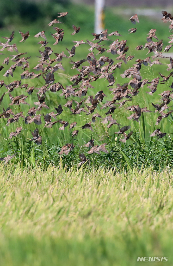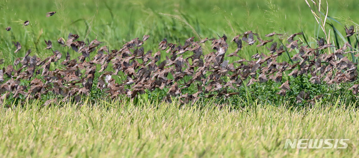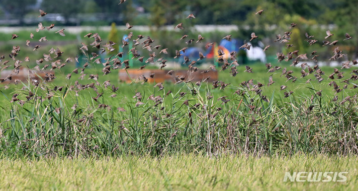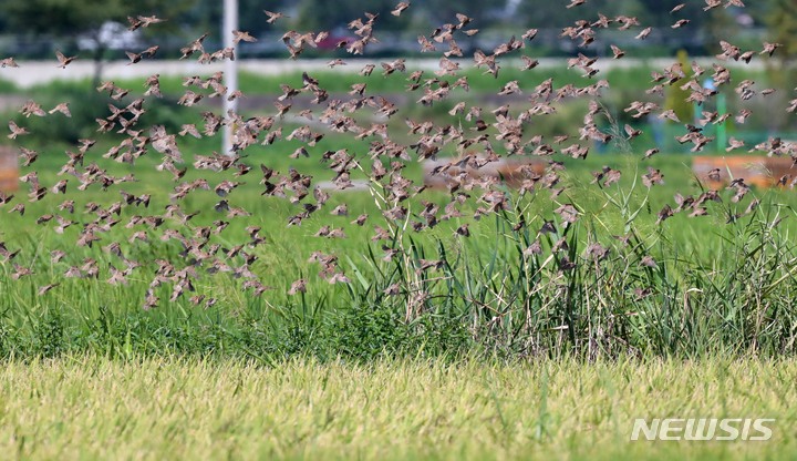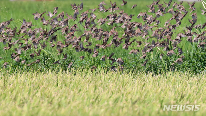 【NEWSIS】暑さが収まり始めるころとされている二十四節気の一つ「処暑」まであと二日となった21日、釜山市江西区内で、稲がよく実った田んぼと田んぼの間から飛び立つスズメの群れ。