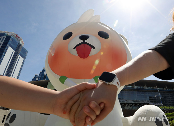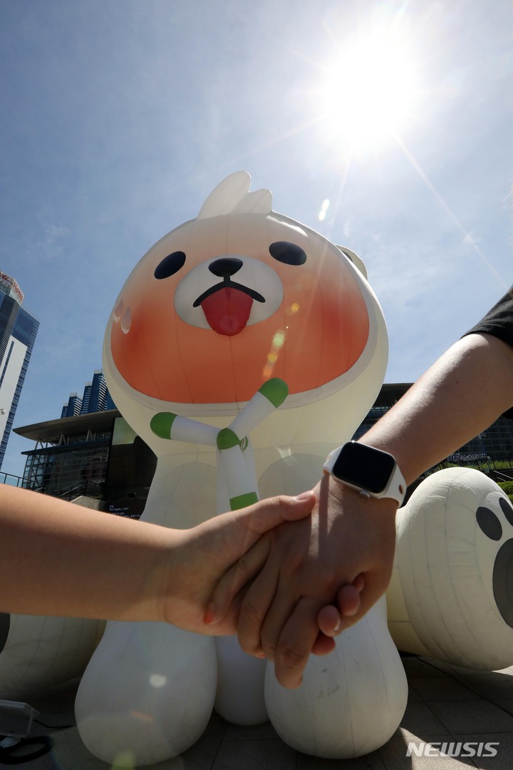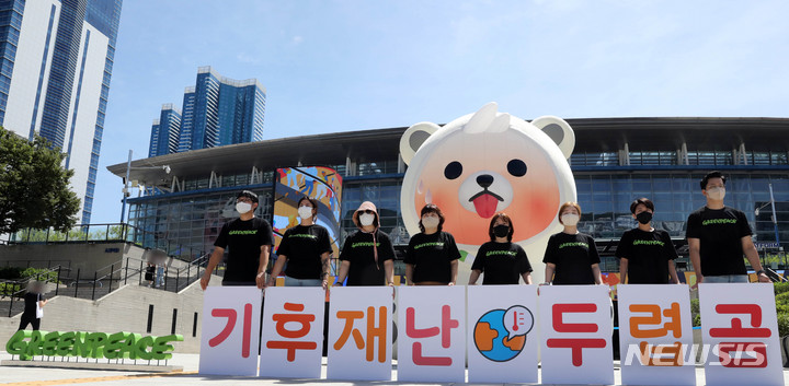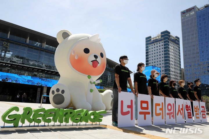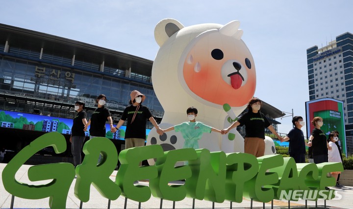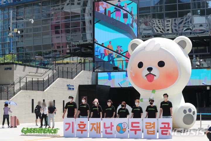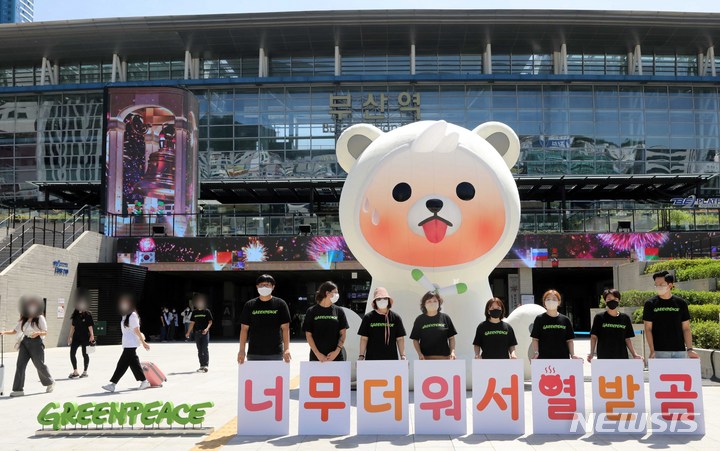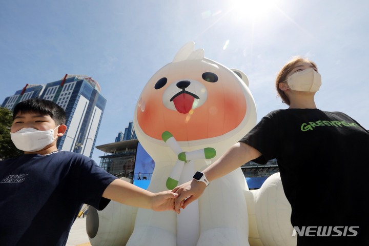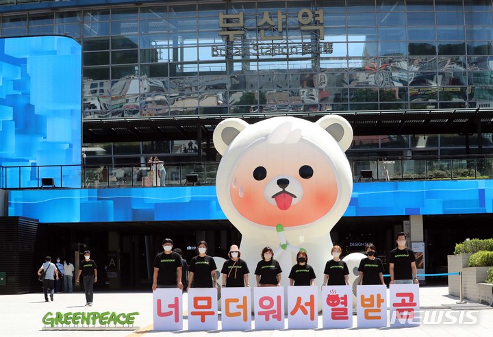 国際環境団体「グリーンピース」の活動家らが22日午前、釜山市東区の釜山駅広場に設置された「ヨルパッコム」像前で、気候危機の深刻さを訴えて再生可能エネルギーへの転換を求めるパフォーマンスを行っている。「ヨルパンネ」(熱を受ける、ムカつく)と「プッククコム」(ホッキョクグマ)を合わせた造語「ヨルパッコム」は、グリーンピースが市民を対象に気候危機の深刻さを訴えるため、特別制作した幅5メートル、高さ6メートルのホッキョクグマのキャラクターだ。