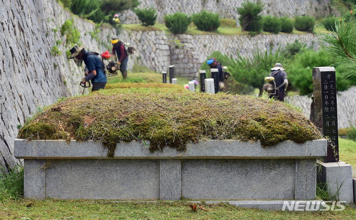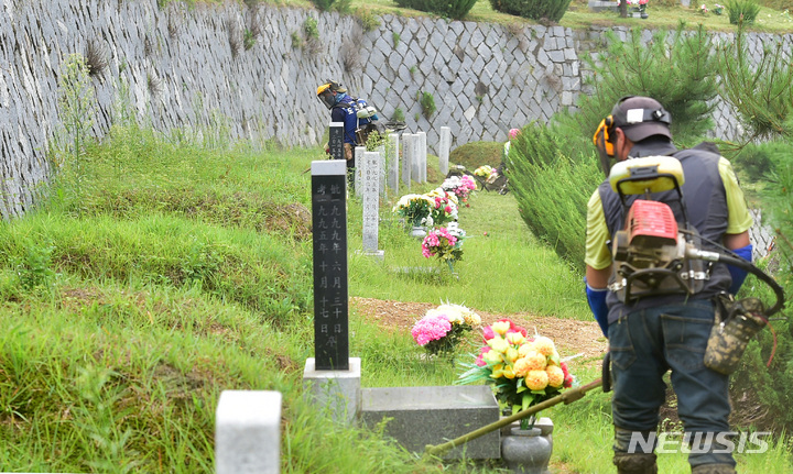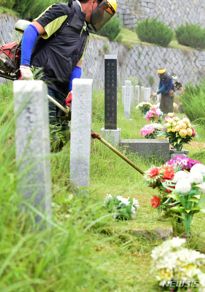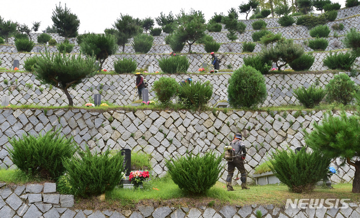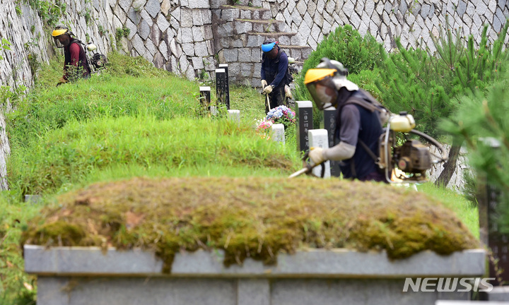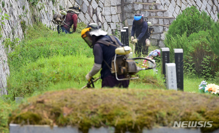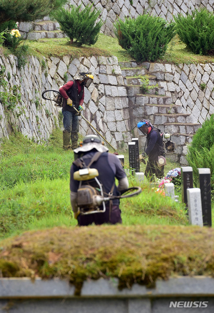 二十四節気の一つ「処暑」に当たる23日午前、慶尚北道漆谷郡の現代公園では、関係者がお墓の草刈りをしていた。