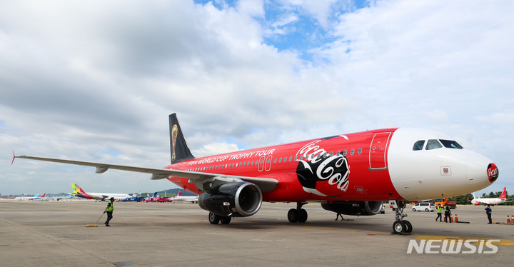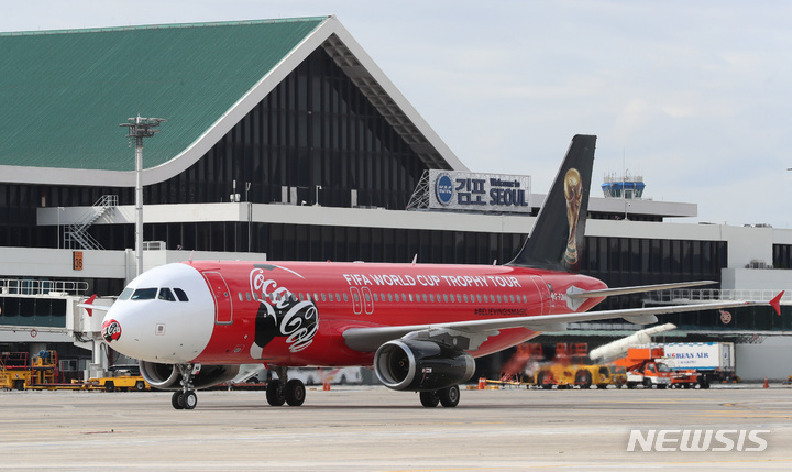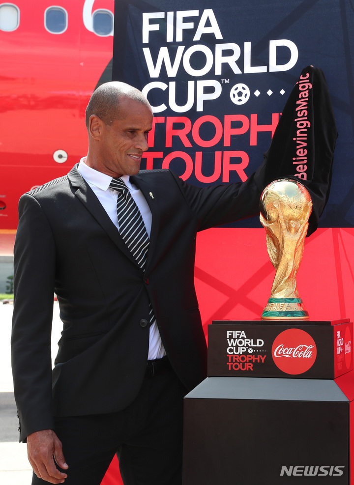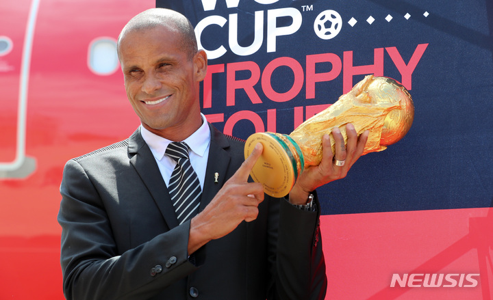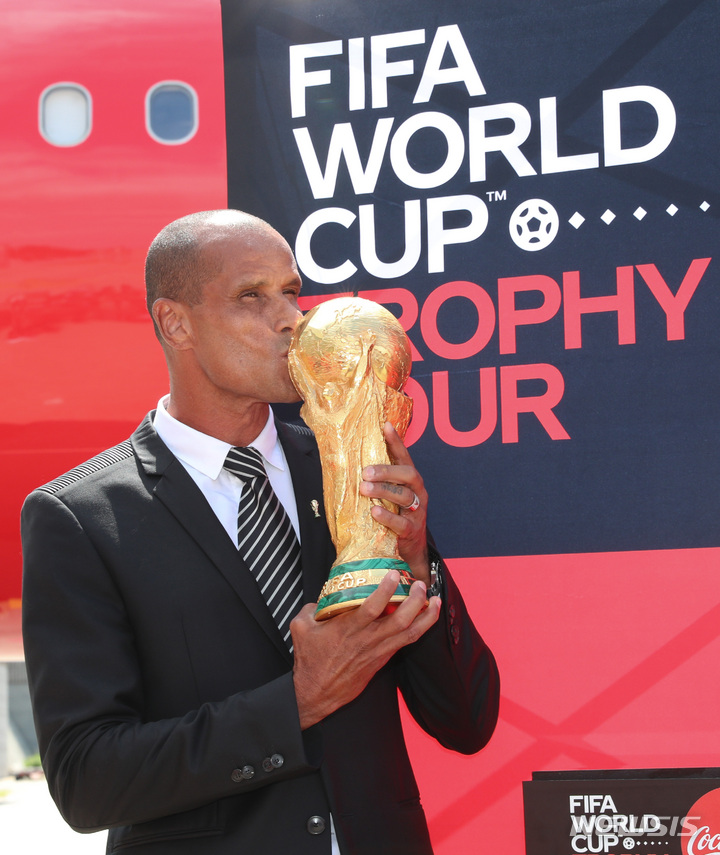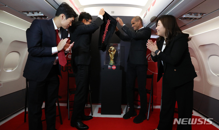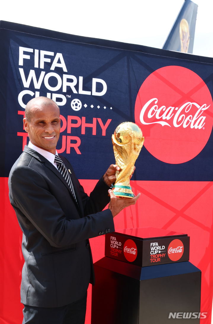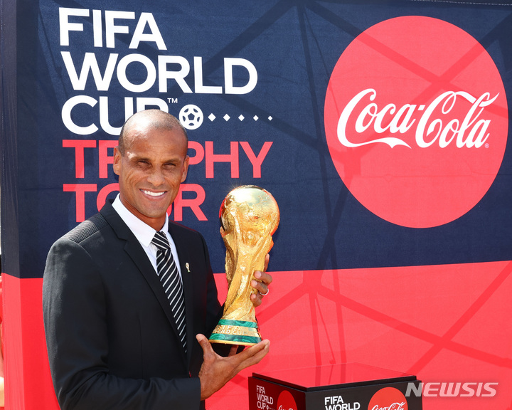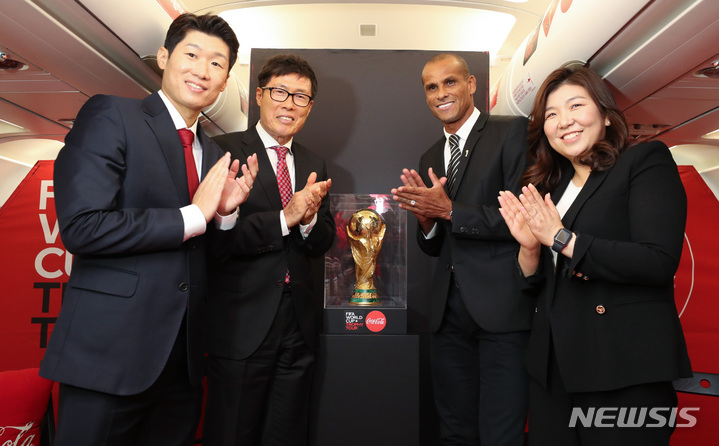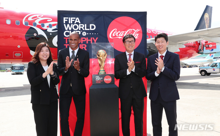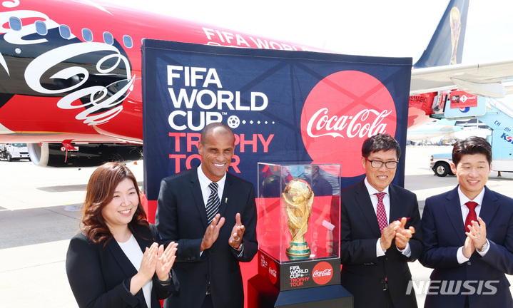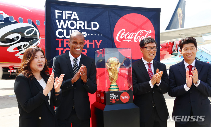 韓国コカ・コーラのチェ・スジョン代表、FIFAグローバル・アンバサダーのロナウド、車範根(チャ・ボムグン)元韓国代表監督、元サッカー選手の朴知晟(パク・チソン)=写真左から=が24日午前、ソウルの金浦国際空港でトロフィーを披露しているところ。