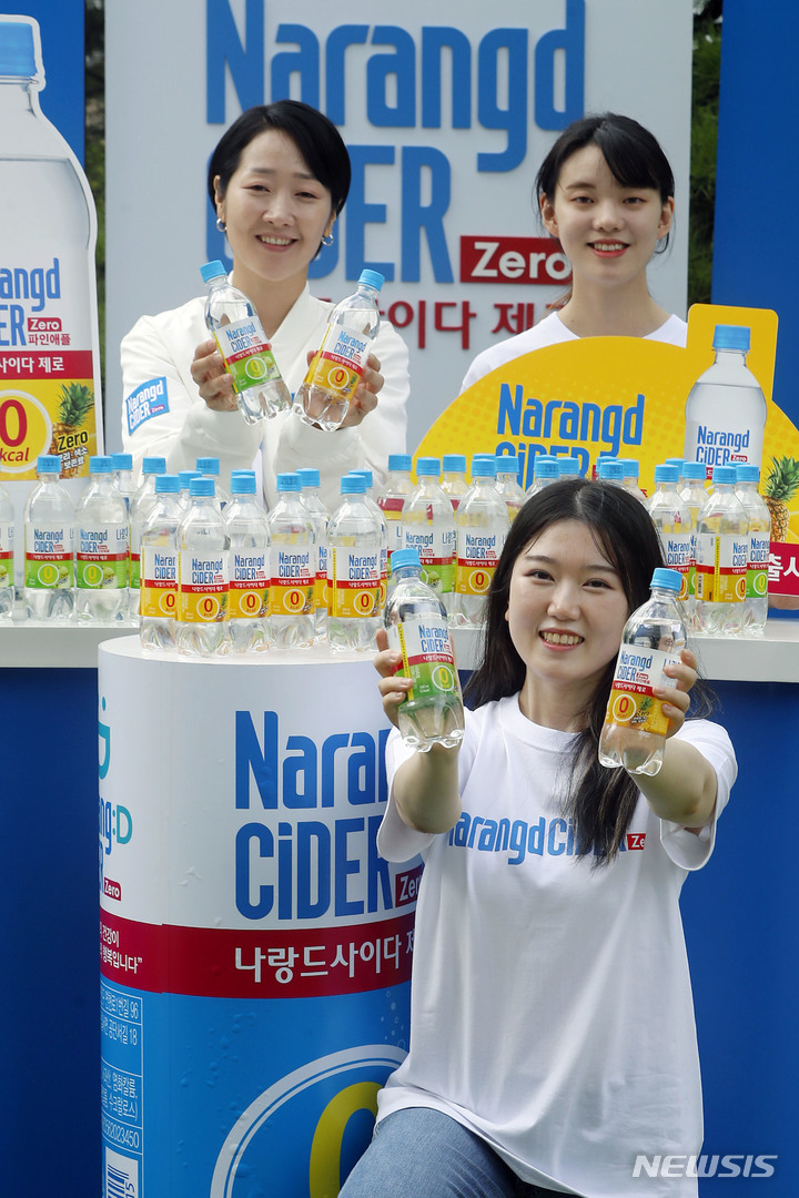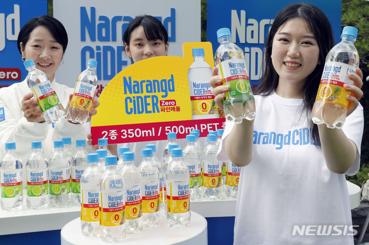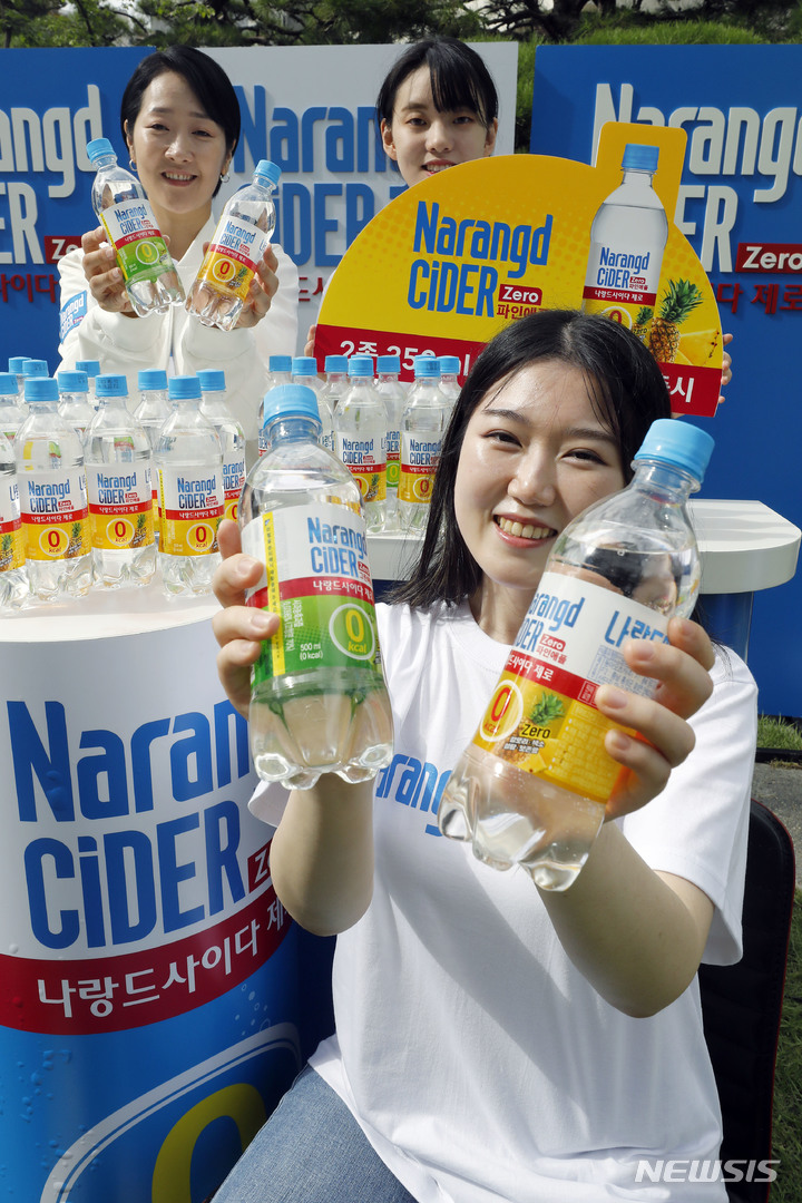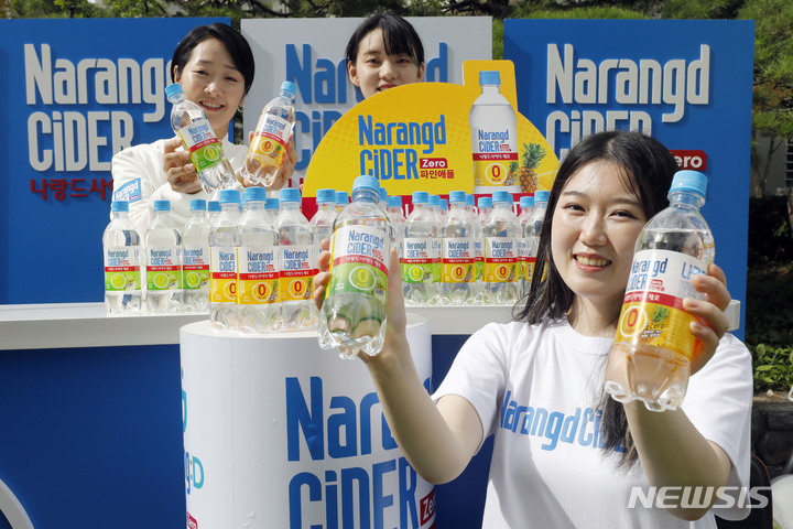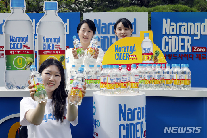 東亜大塚が24日、ソウル市東大門区の東亜大塚別館前で「ゼロカロリー ナランドサイダー パインアップル・グリーンアップル」の新製品PRを行っているところ。