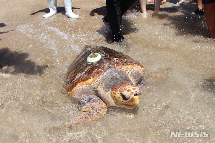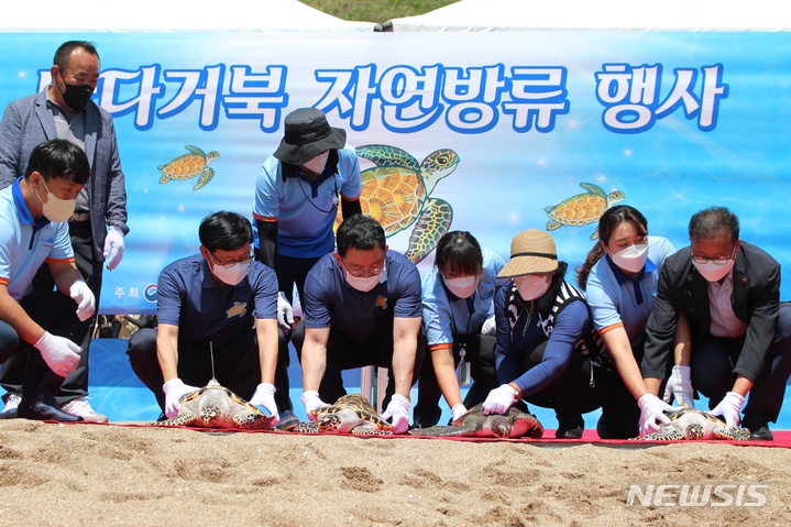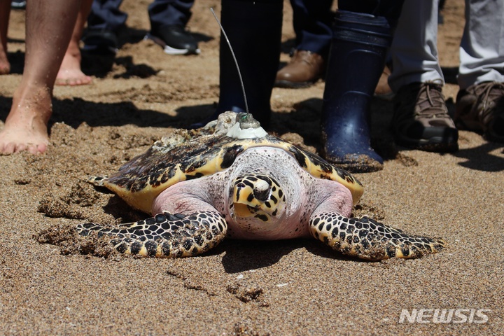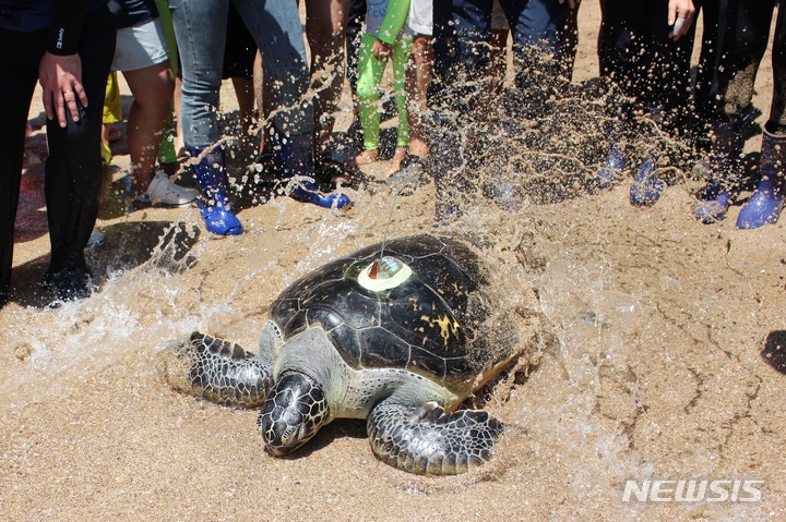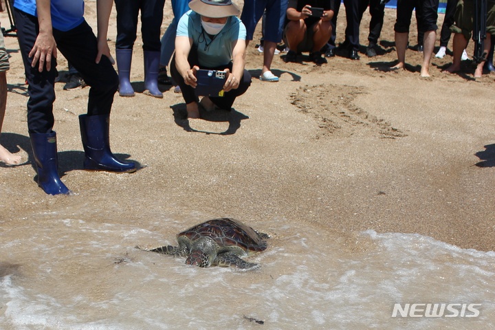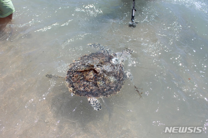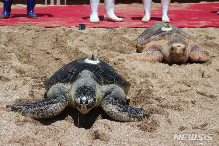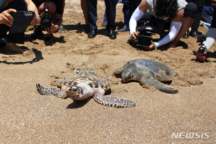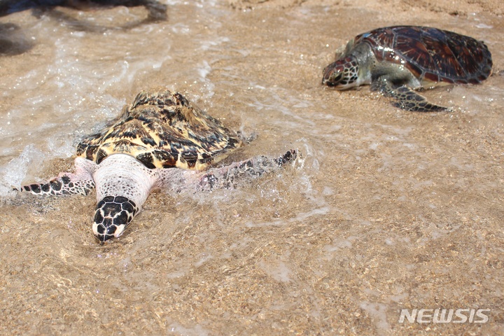 済州島西帰浦市の中文穡達海水浴場で25日午後、絶滅の危機に瀕しているウミガメが放流された。海洋水産部(省に相当)はこの日、人工孵化により水族館で増やした生後3年のタイマイ3頭と、けがをしたり陸に乗り上げたりして救助・治療を受けた野生のアオウミガメ2頭、アカウミガメ1頭を放流した。