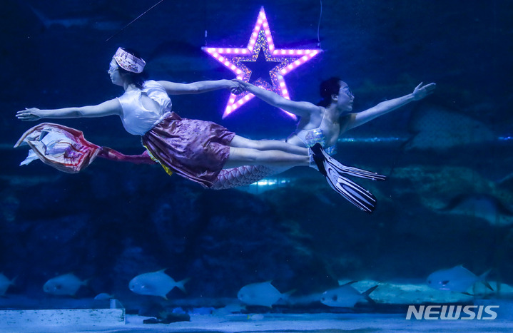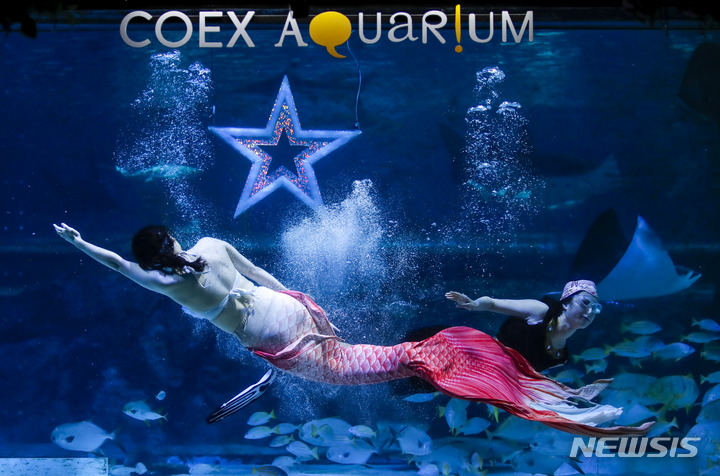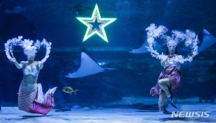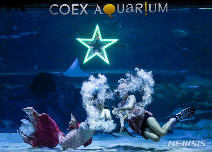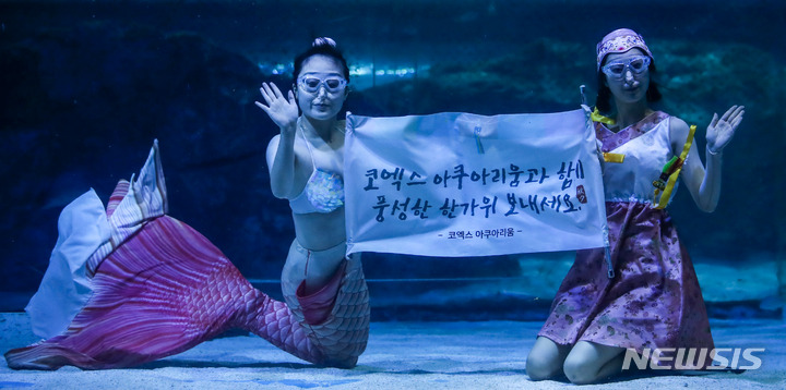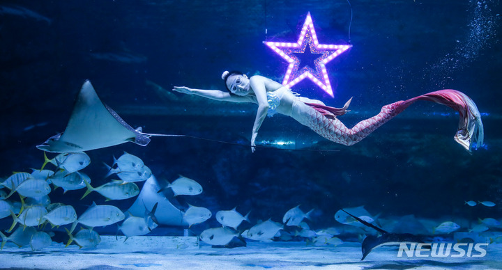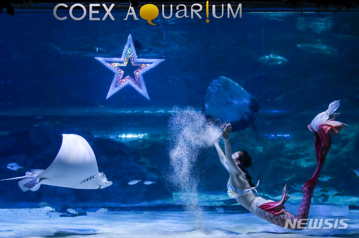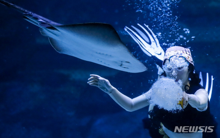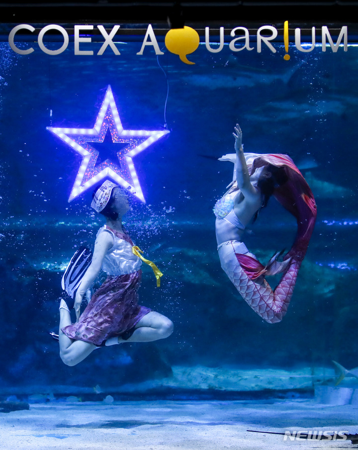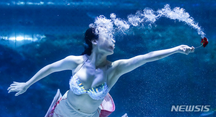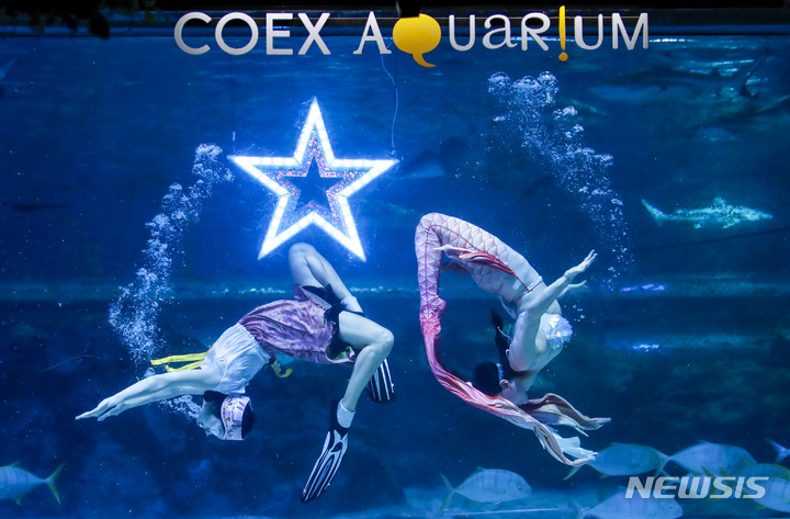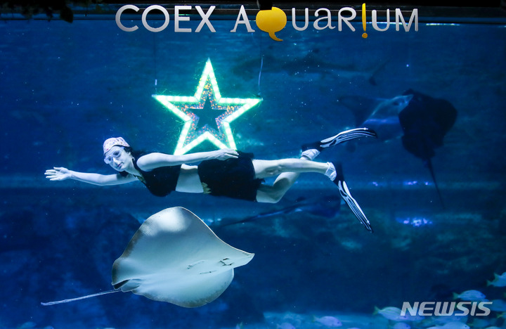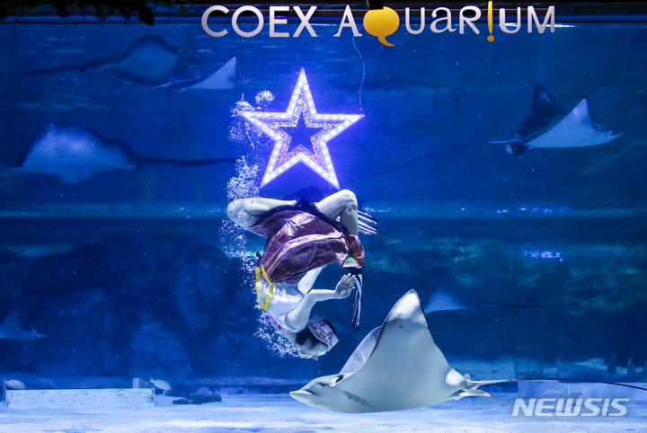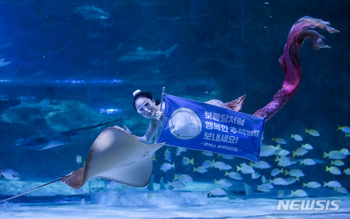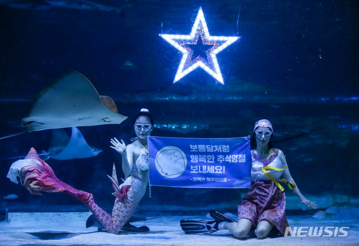 ソウル市江南区のCOEX AQUARIUMで26日、アクアリストが秋夕(中秋節。今年は9月10日)特集水中公演を行っているところ。