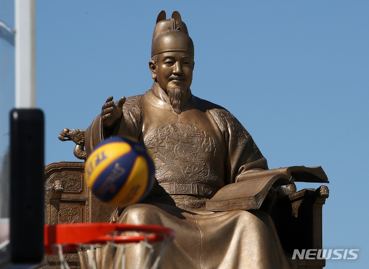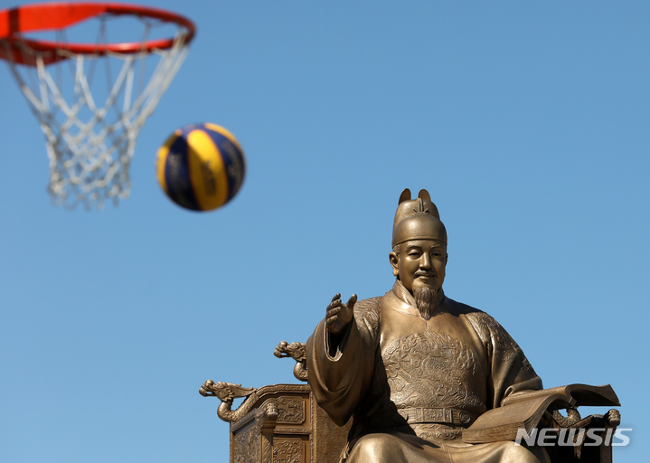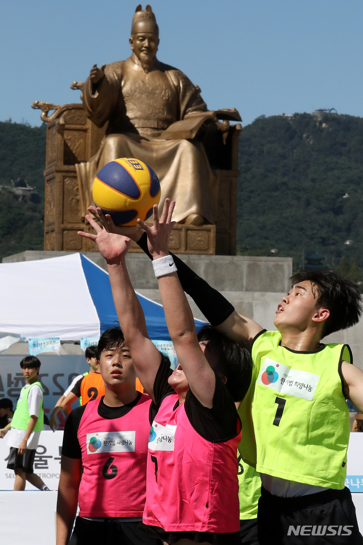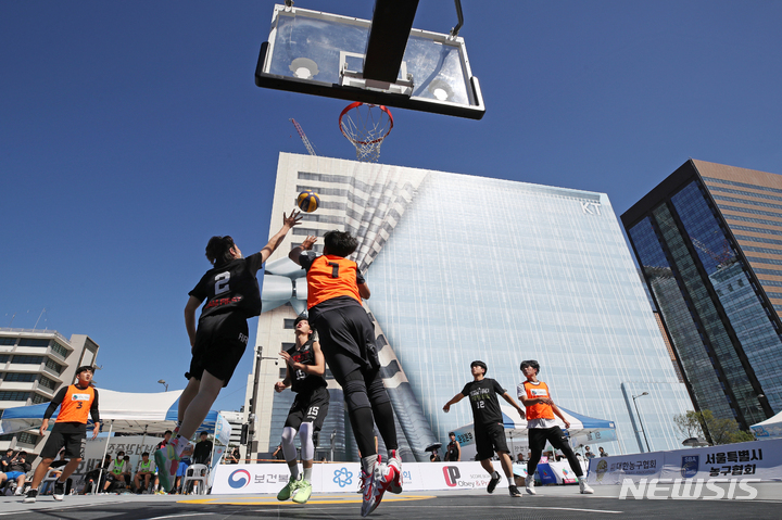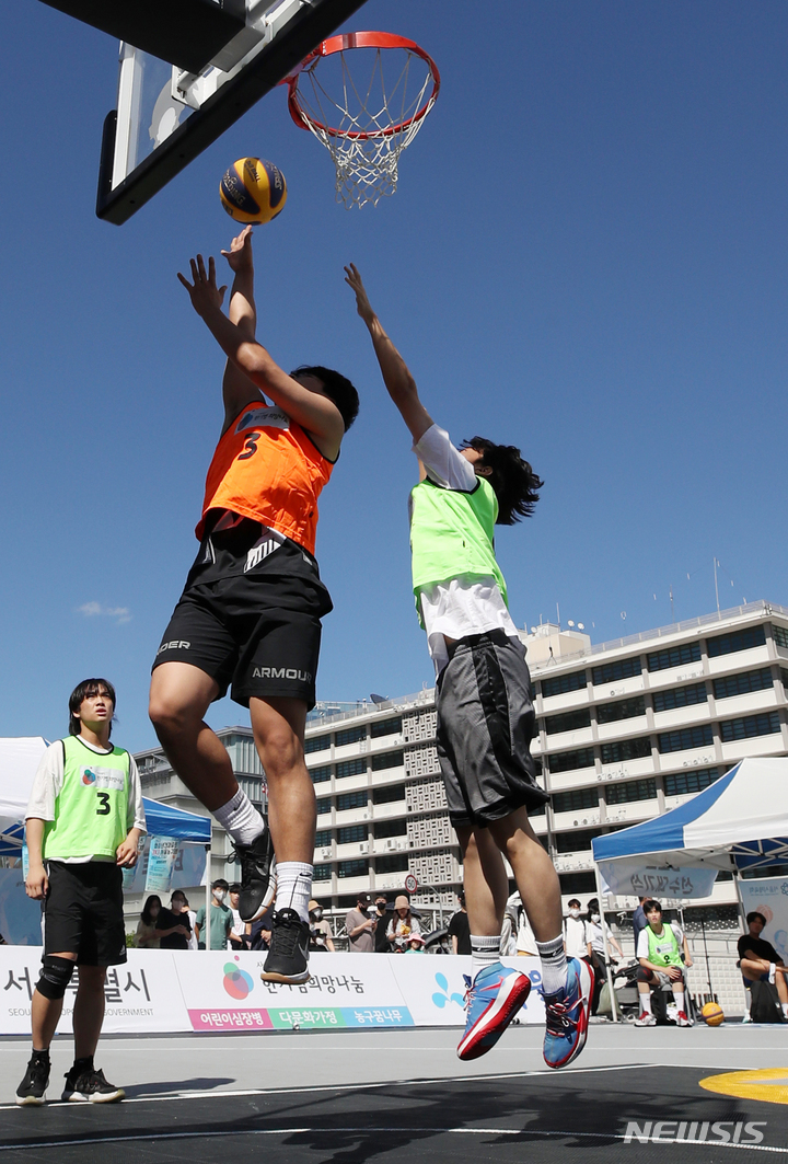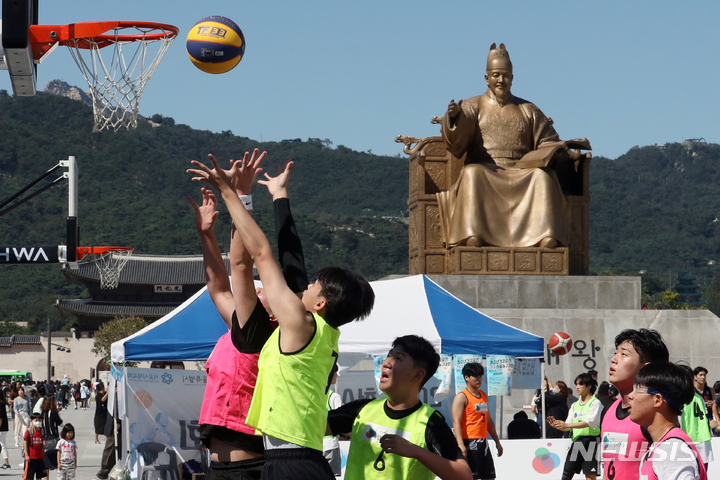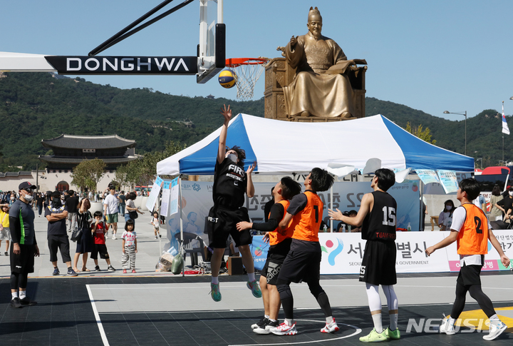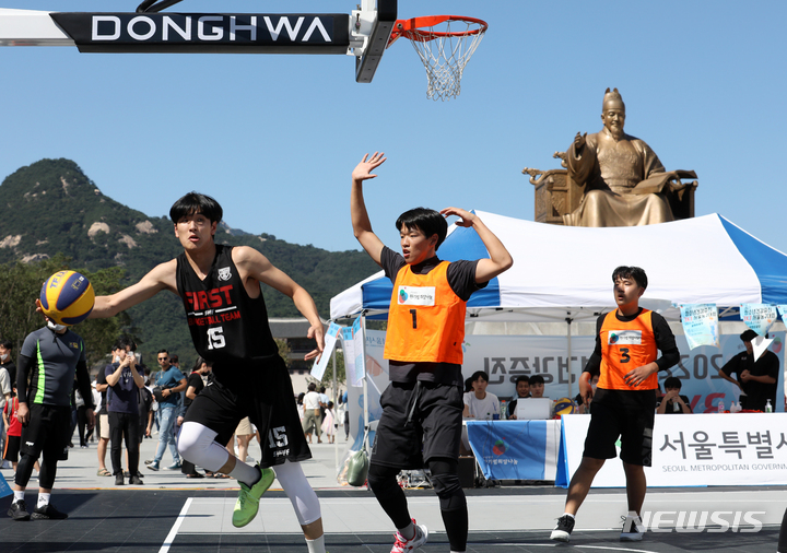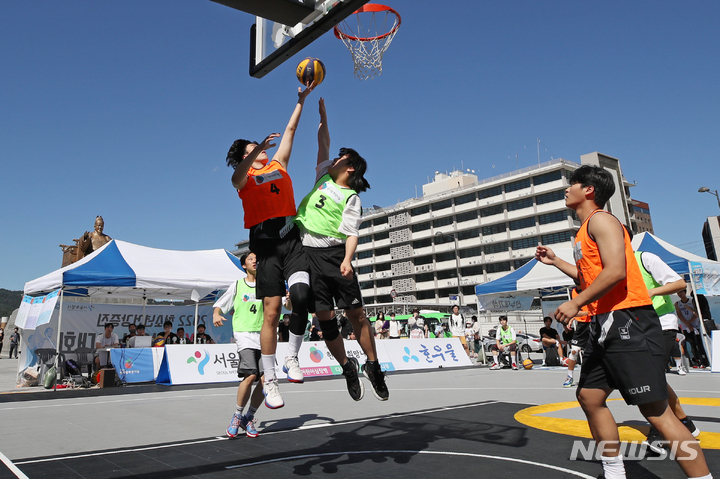 27日午後、ソウル市鍾路区光化門広場で開催された「2022青少年健康増進3×3ソウル篭球大会」にて、試合を繰り広げる参加選手たちの様子。