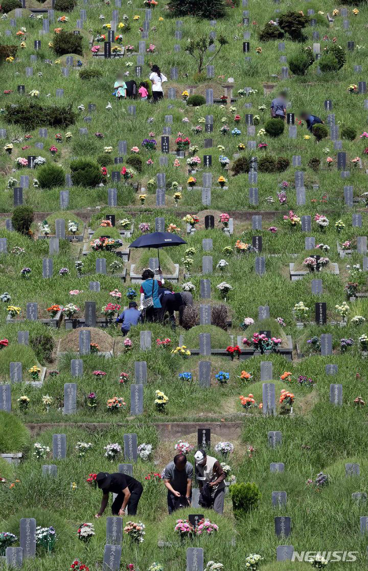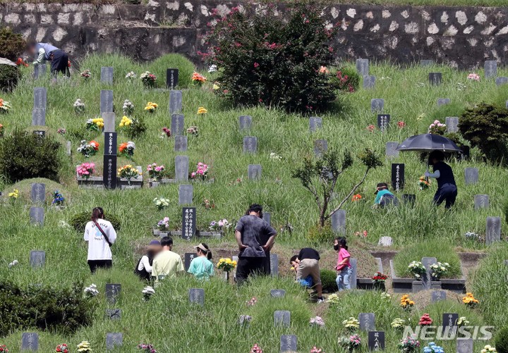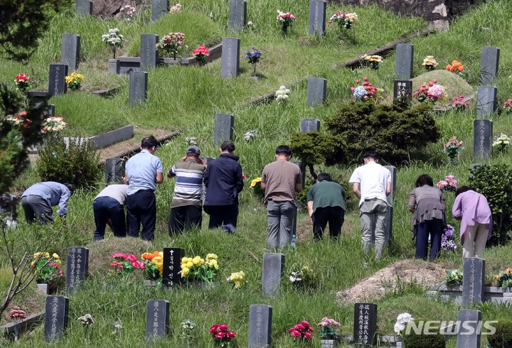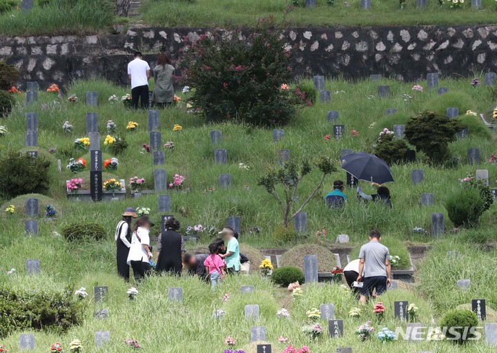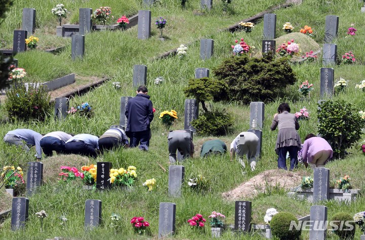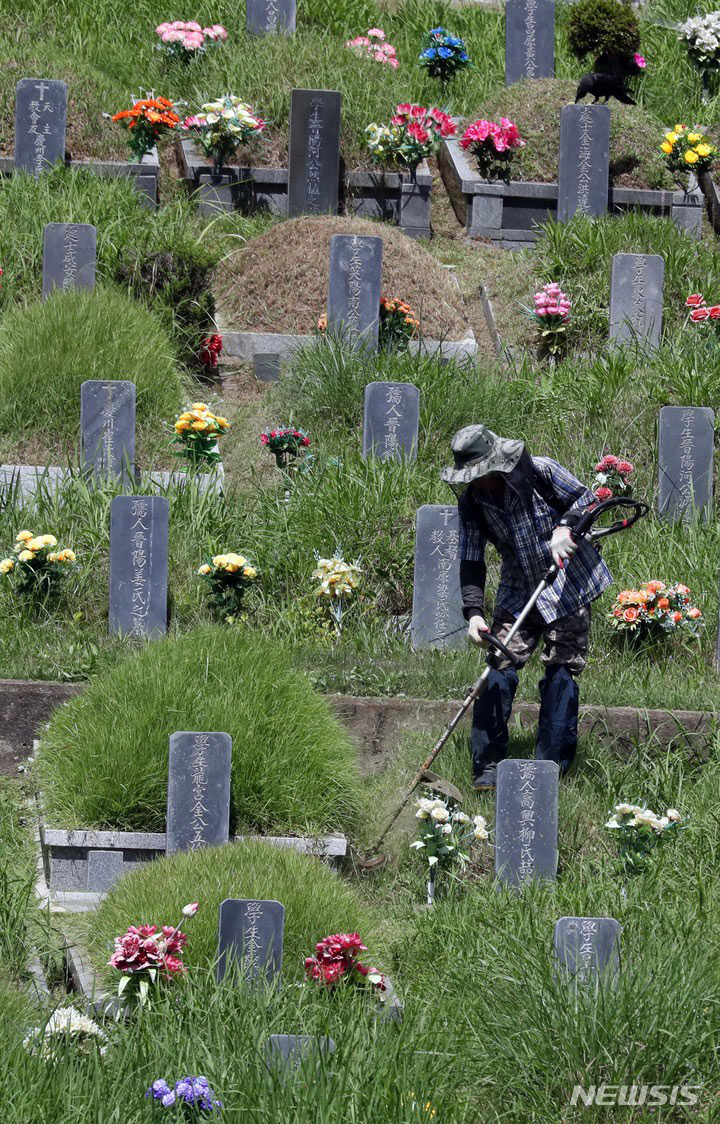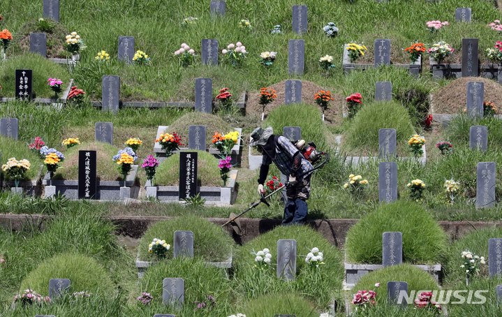 【NEWSIS】秋夕(チュソク=中秋節)連休(今年は9月9日-12日)まであと2週間となった28日、釜山市金井区の公園墓地・永楽公園を訪れ、草取りや墓参をする人々。