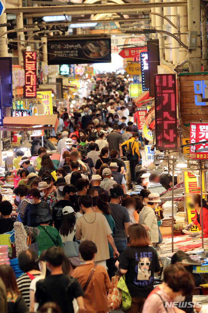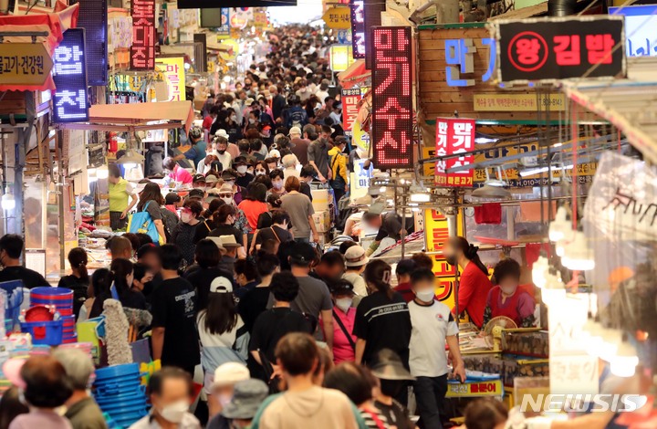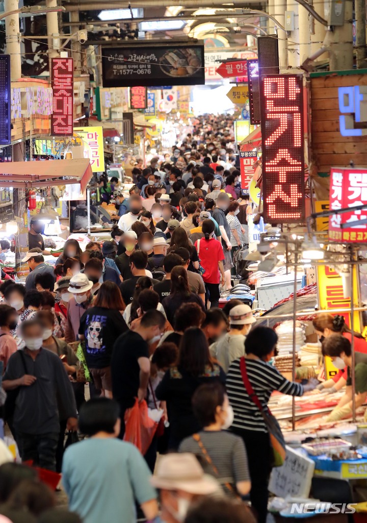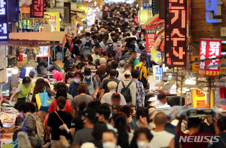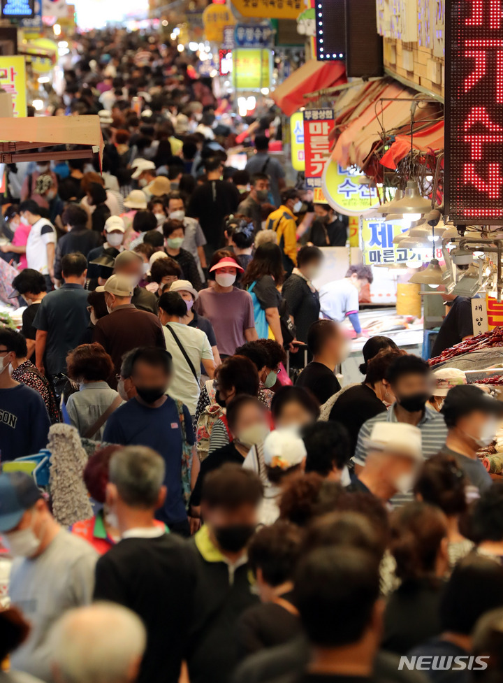 【NEWSIS】秋夕(チュソク=中秋節)連休(今年は9月9日-12日)まであと2週間となった28日、釜山市釜山鎮区の釜田市場は、お供え用品などを購入しに来た人々でにぎわっていた。