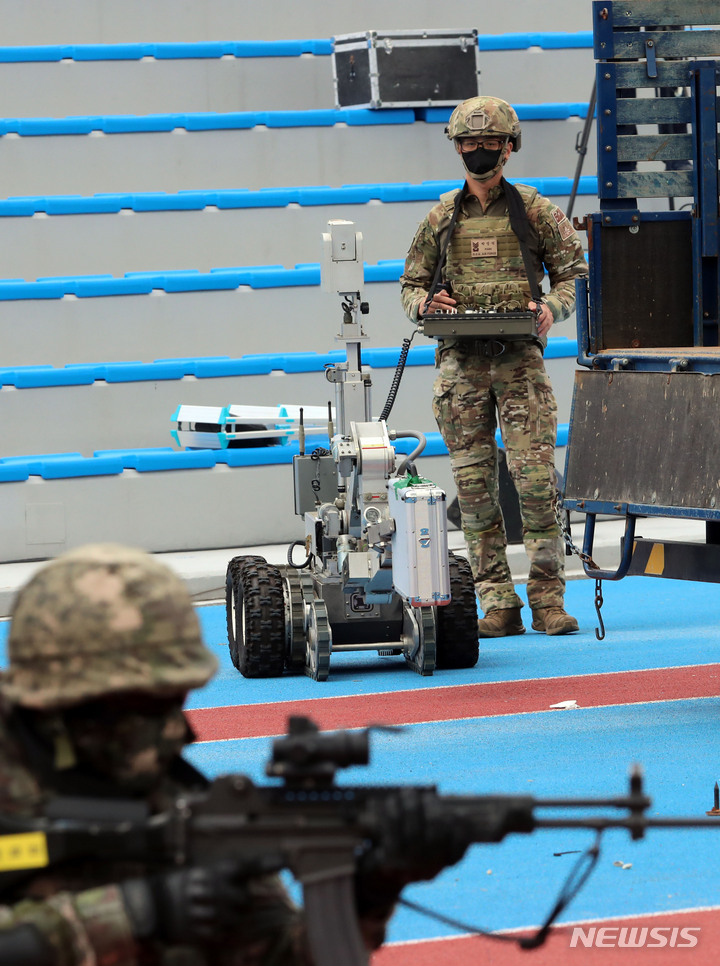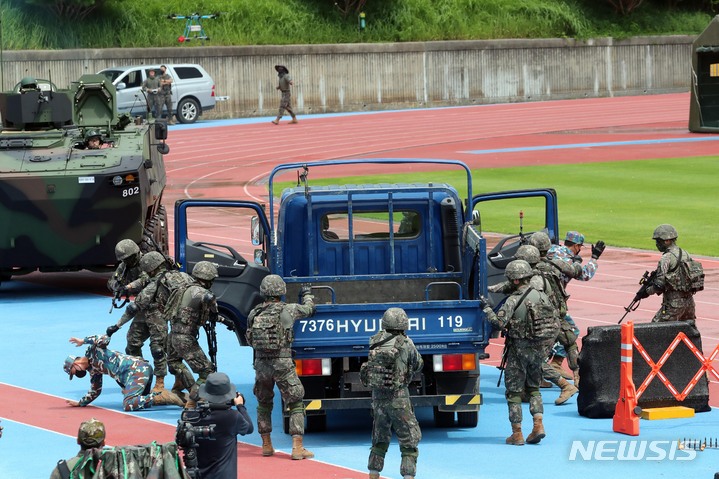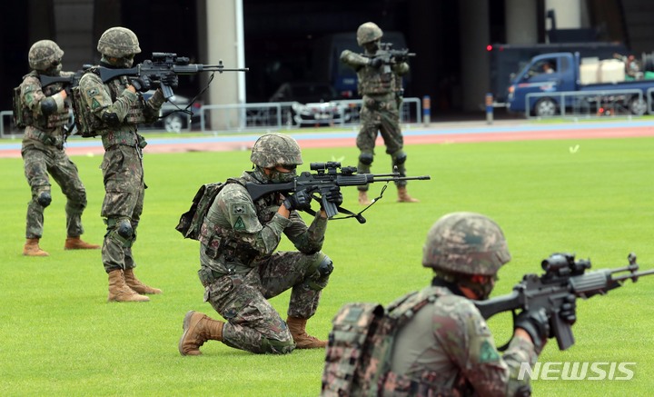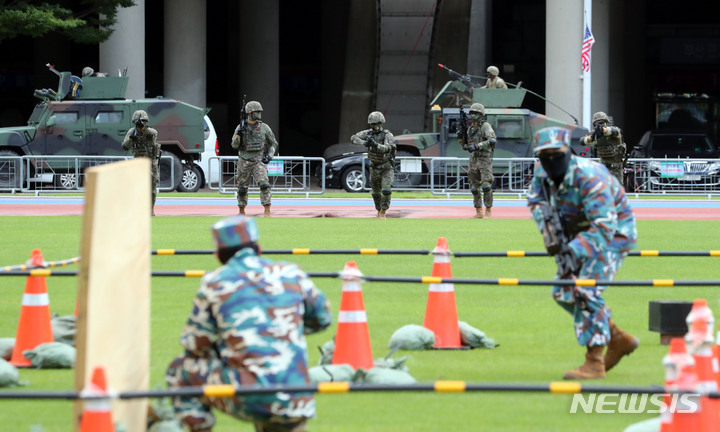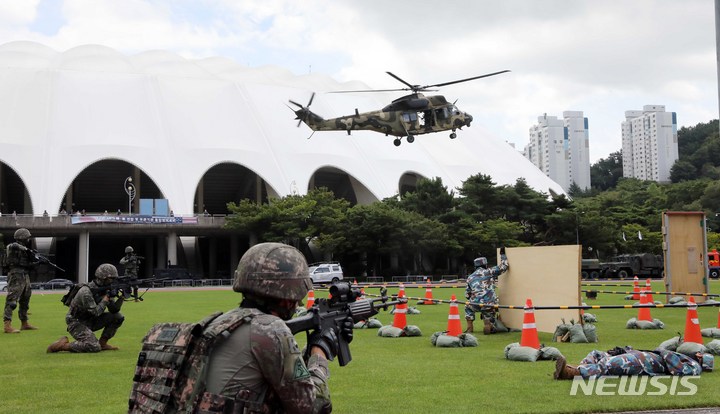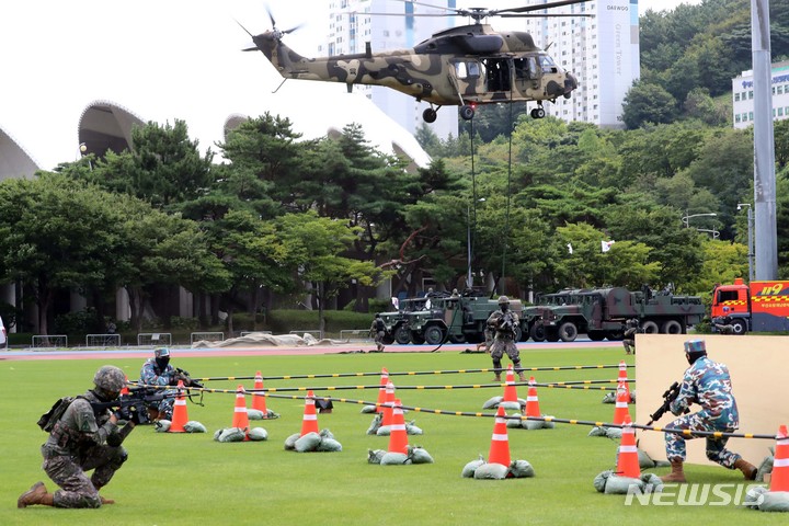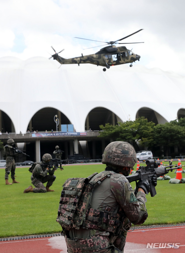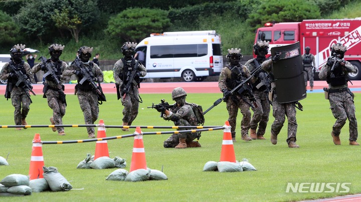 韓米民・官・軍・警・消防連合統合防衛訓練が開かれた29日、釜山市蓮堤区のアジアード補助スタジアムで、韓米両軍の将兵が都心テロを想定した実動訓練を行っているところ。