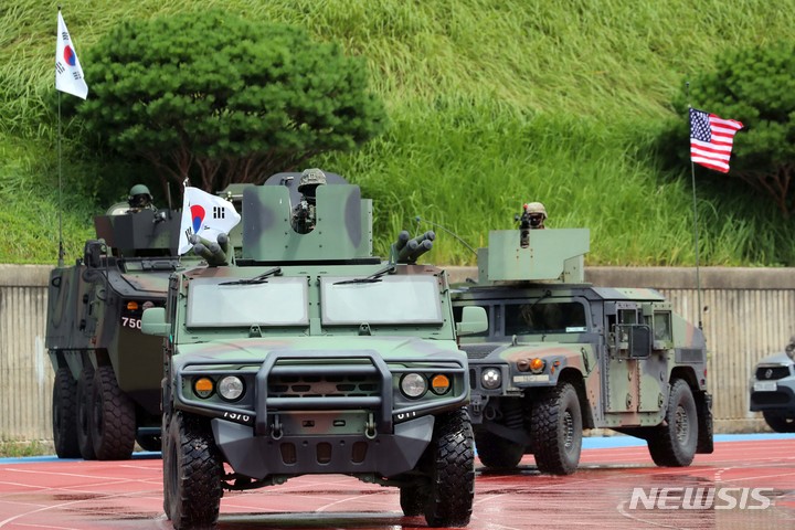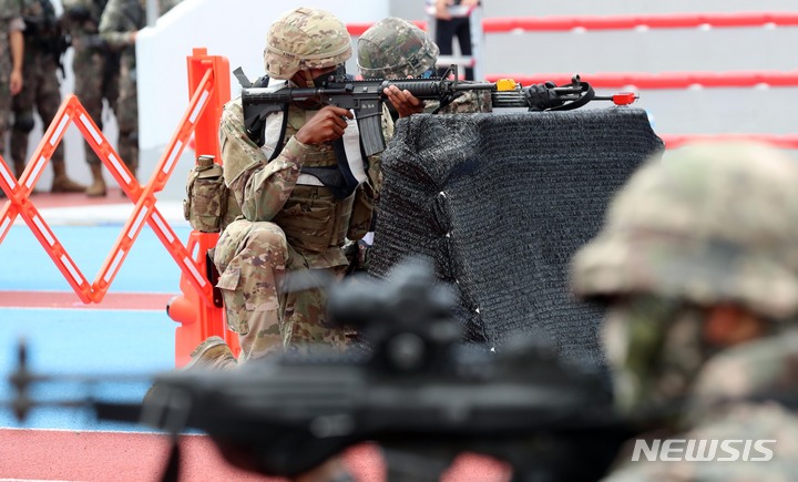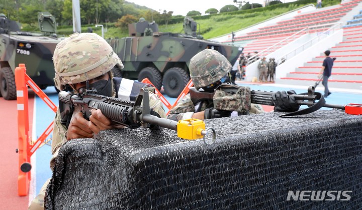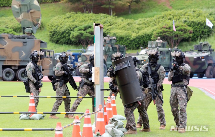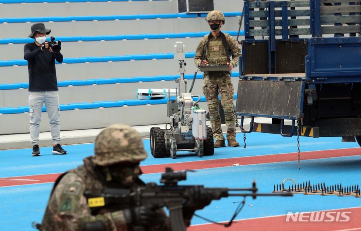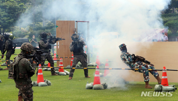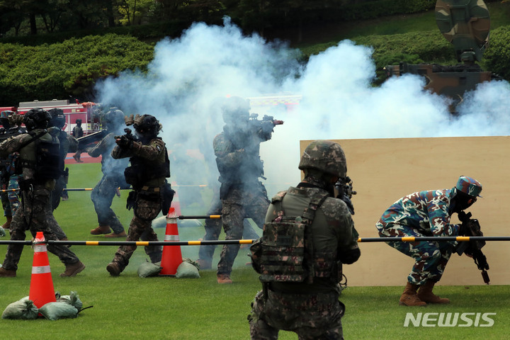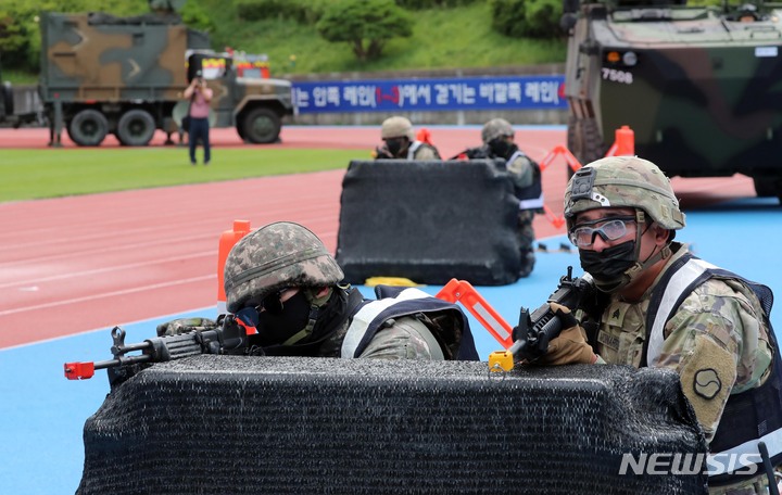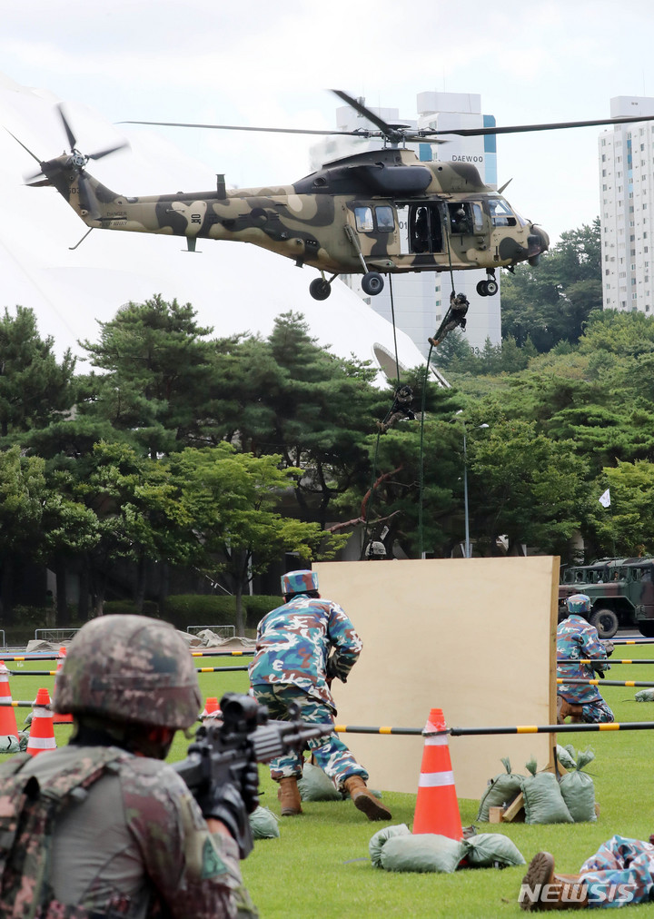 韓米民・官・軍・警・消防連合統合防衛訓練が開かれた29日、釜山市蓮堤区のアジアード補助スタジアムで、韓米両軍の将兵が都心テロを想定した実動訓練を行っているところ。