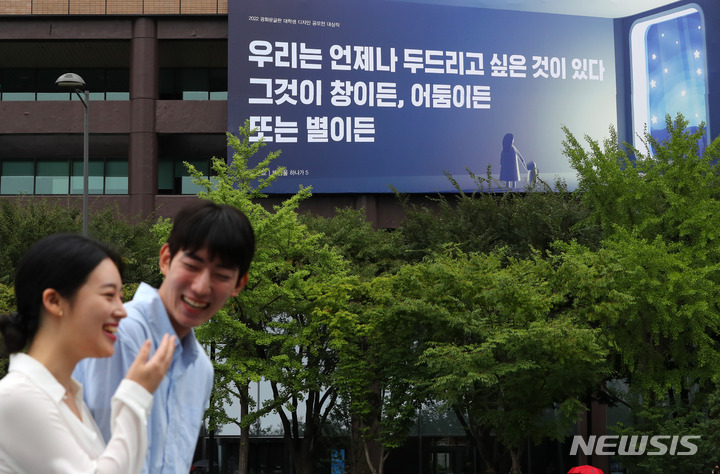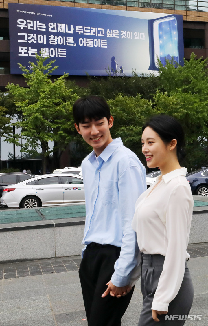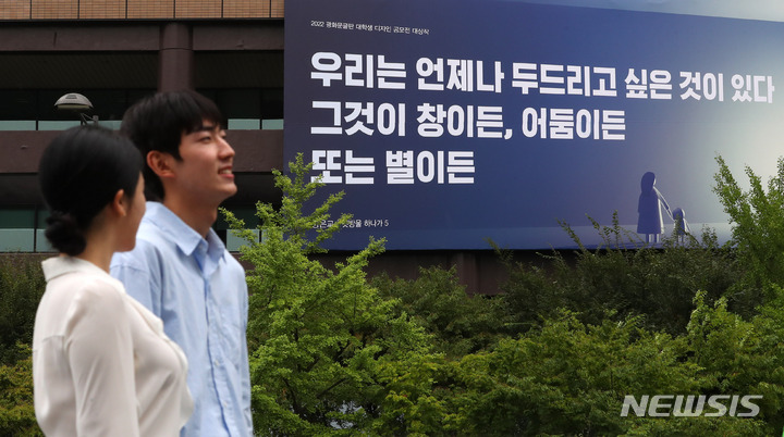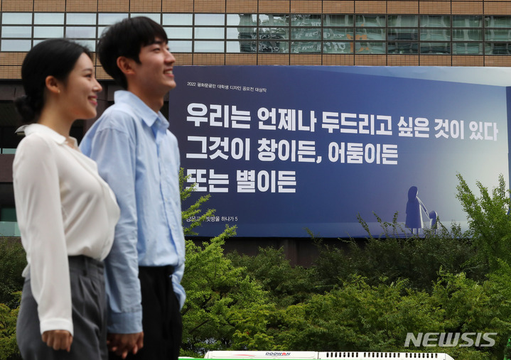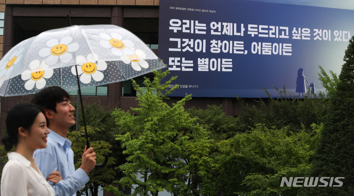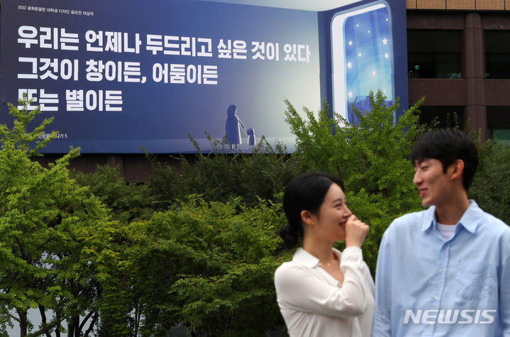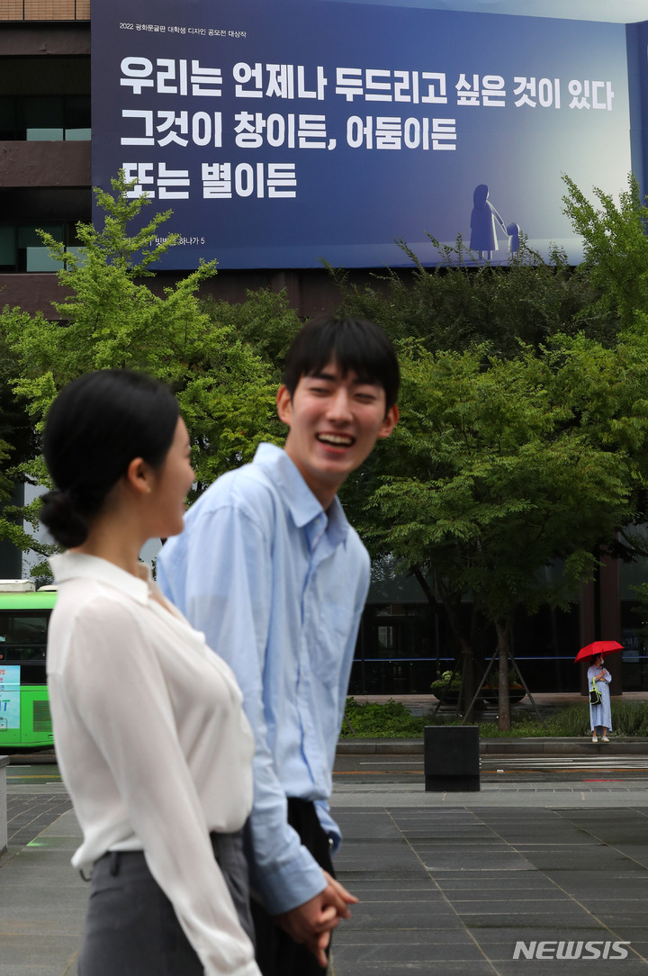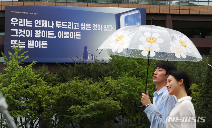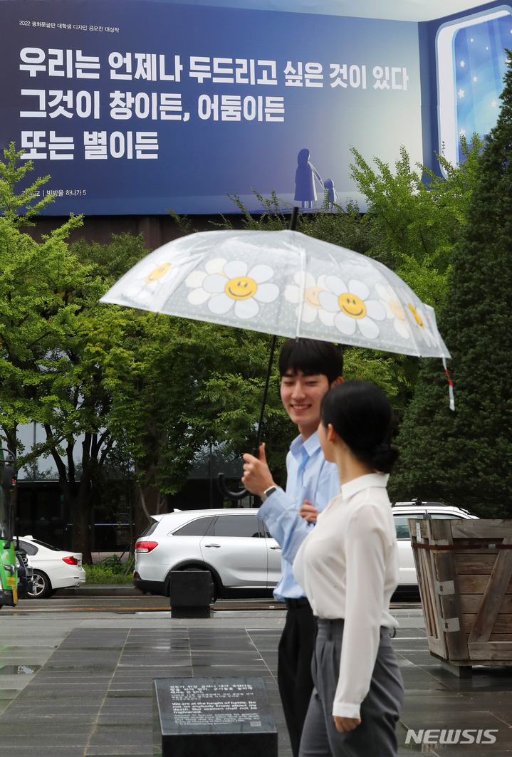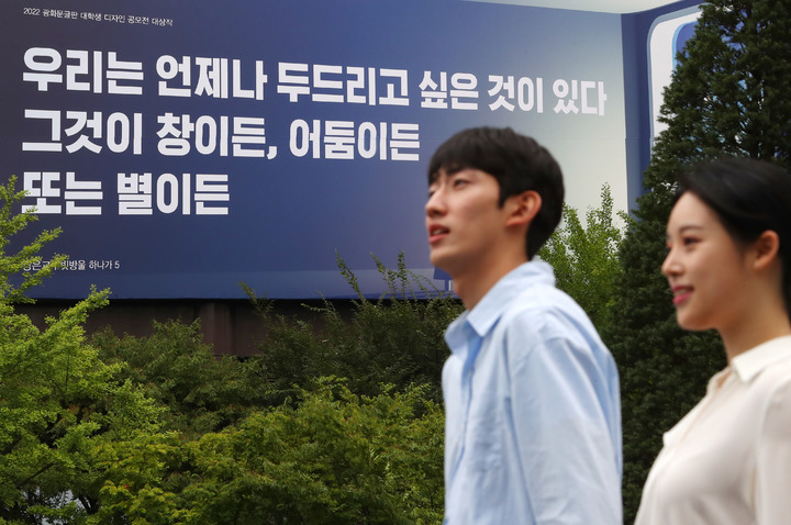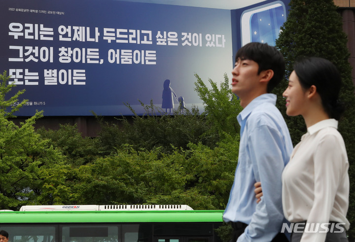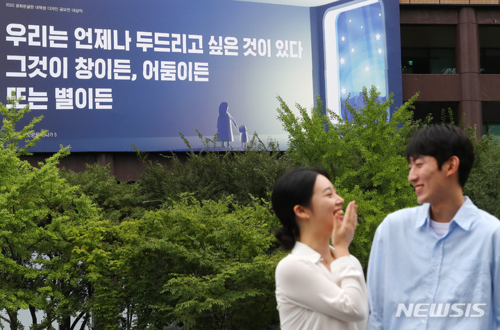 29日午前、ソウル市鍾路区の教保生命ビル外壁の「光化門メッセージボード」秋編に、詩人カン・ウンギョの「雨粒一滴が 5」の一文が刻まれた