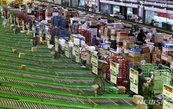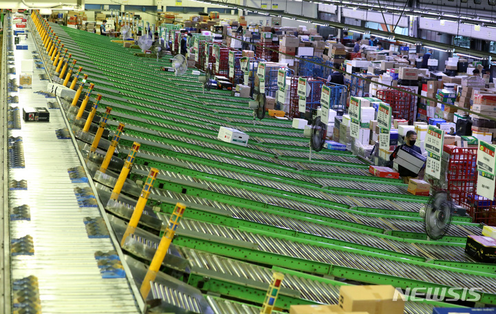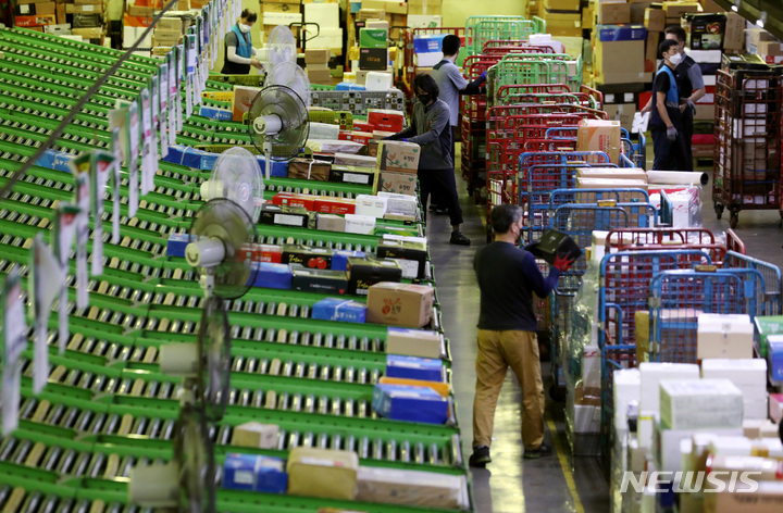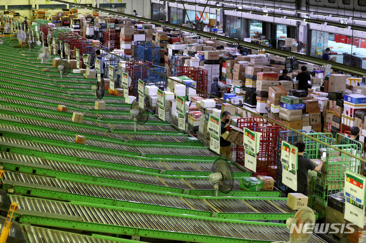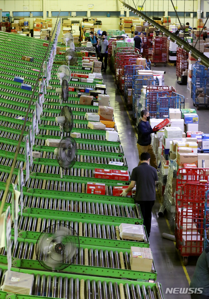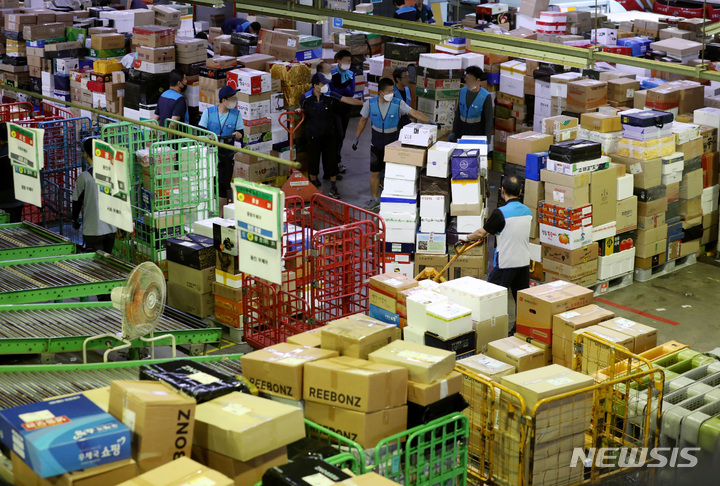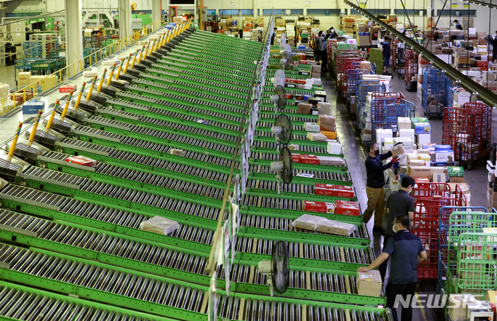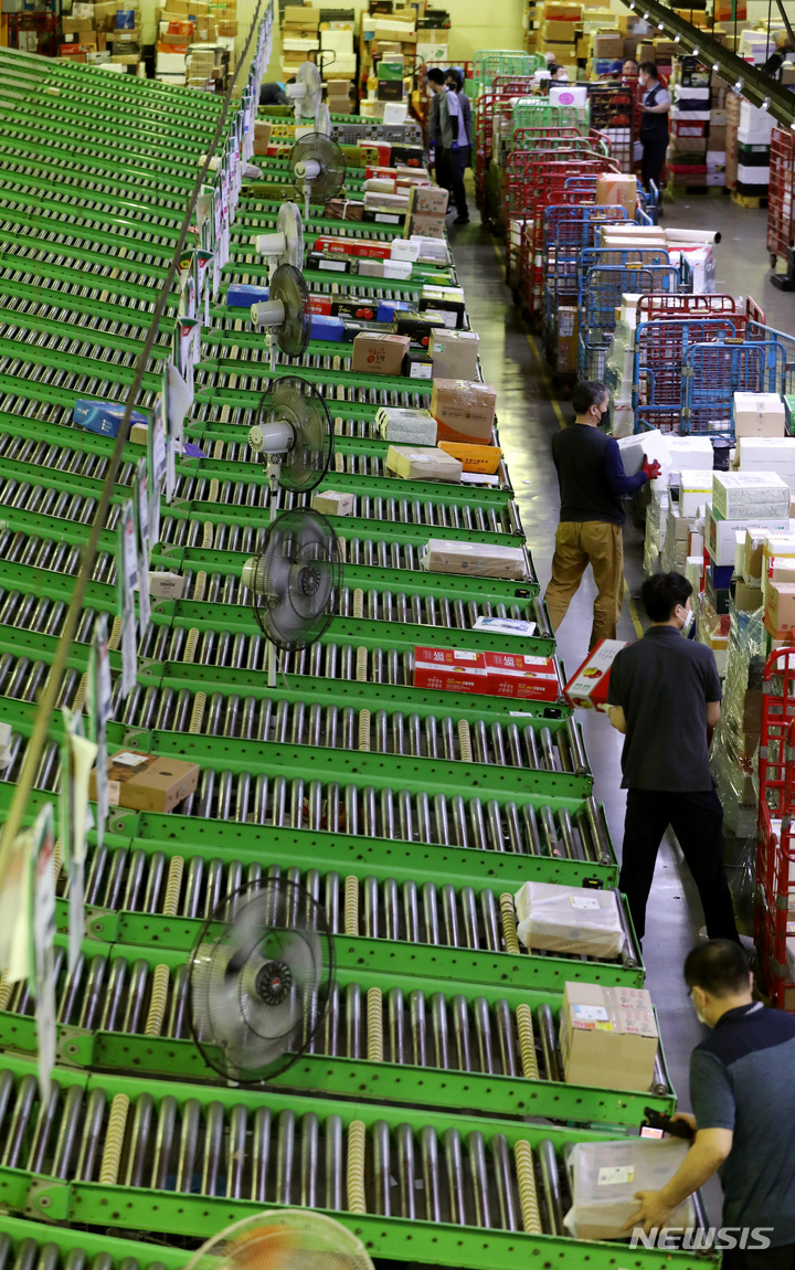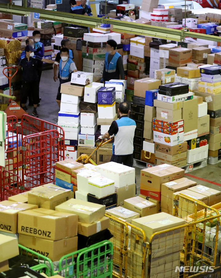 ソウル市広津区の東ソウル郵便物流センターで1日午前、秋夕(中秋節。今年は9月10日)の名節を前に、宅配物の分類を行っている職員の様子。今年の秋夕名節の小包郵便物は、およそ1917万個に達すると予想されている。