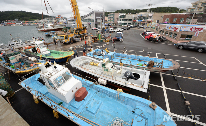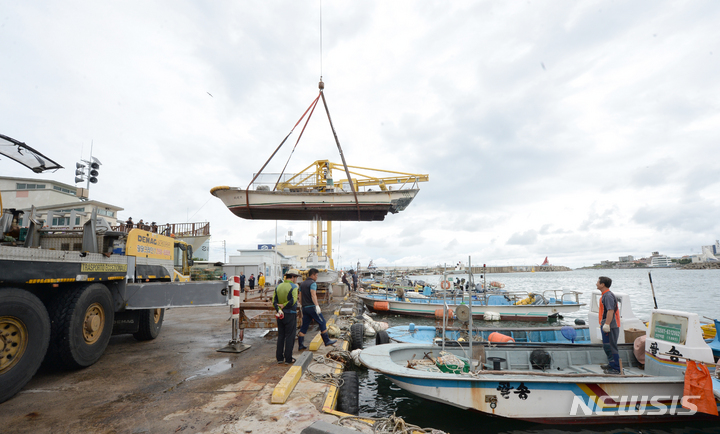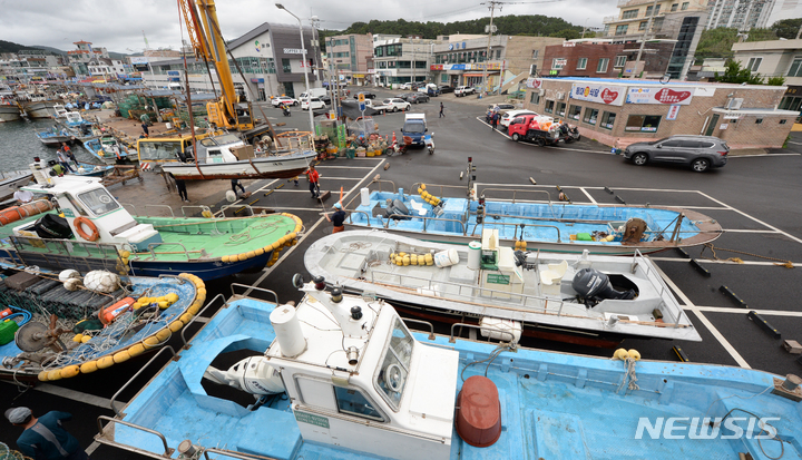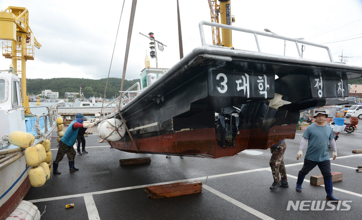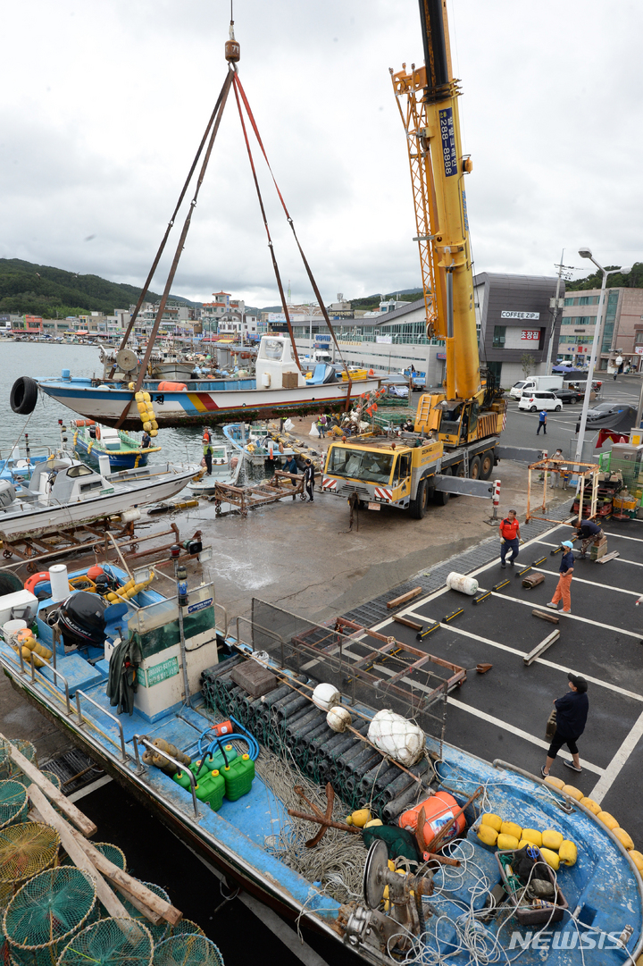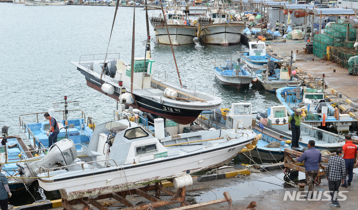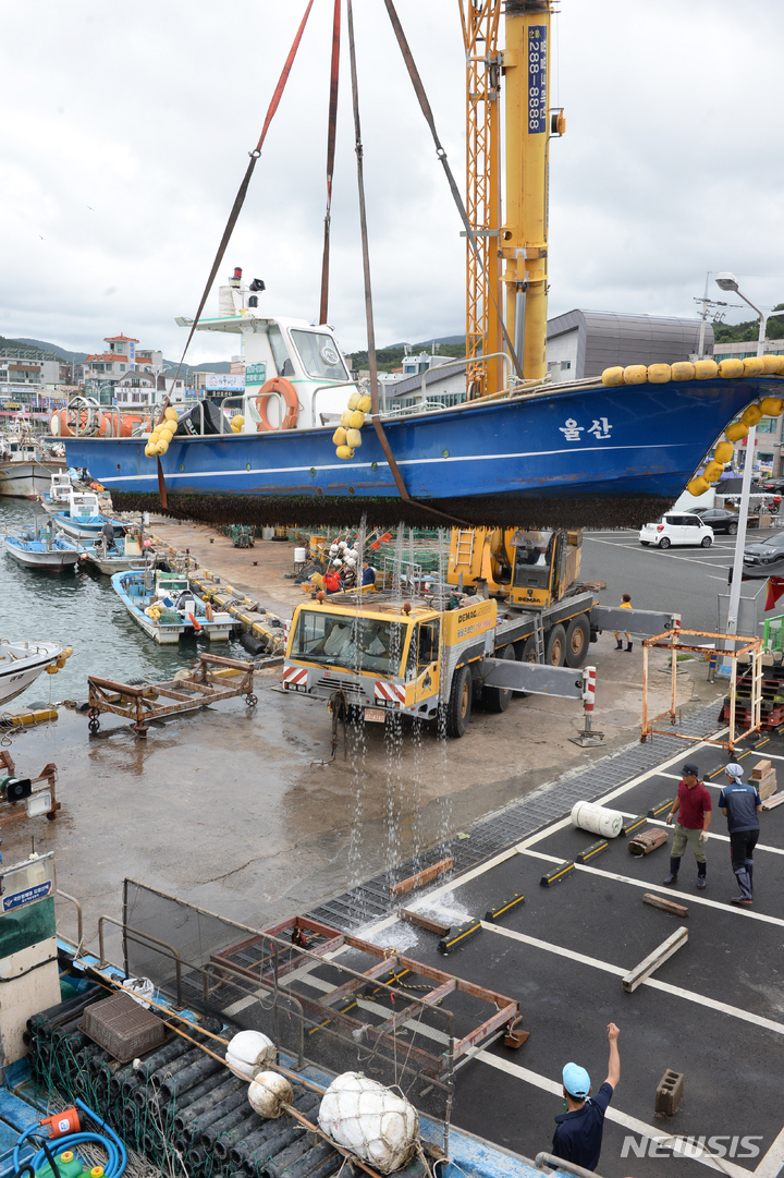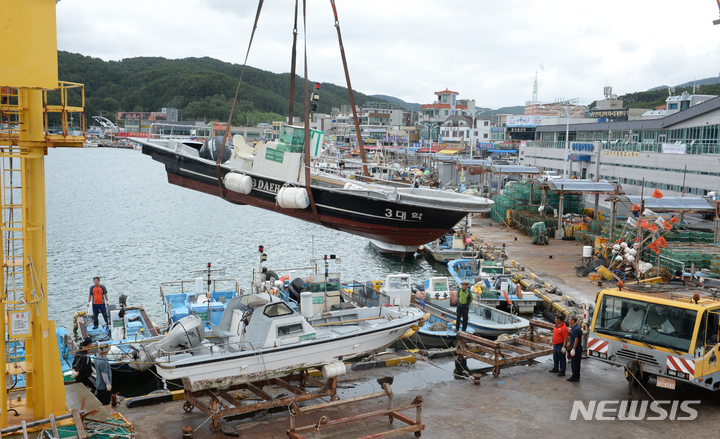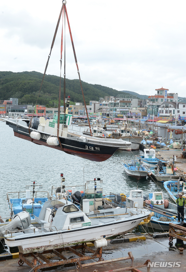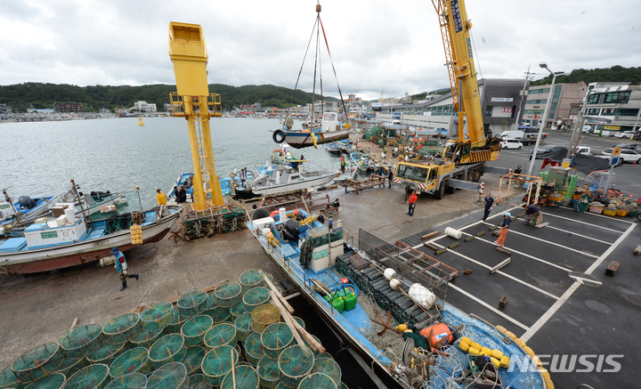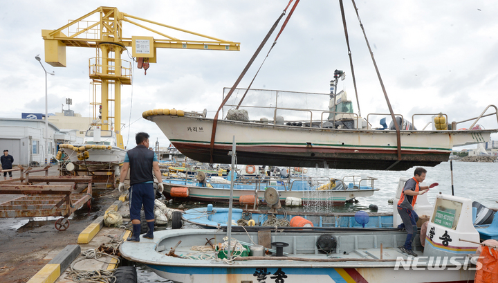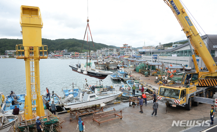 台風11号(アジア名:ヒンナムノー)が北上しつつある2日午前、蔚山市北区の亭子港では、漁業関係者が小型漁船を陸地に移していた。