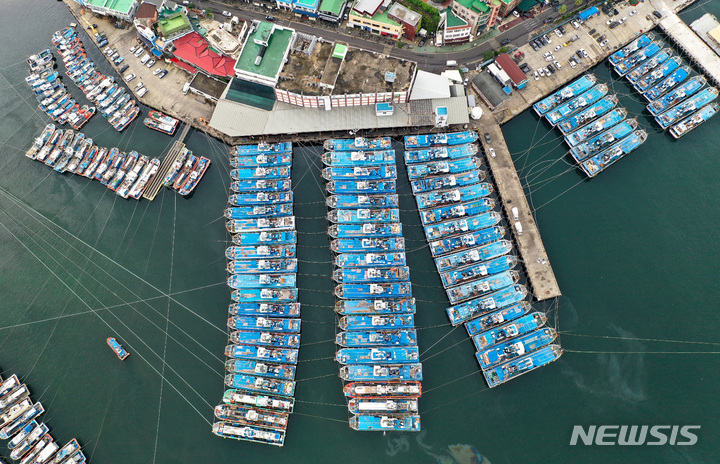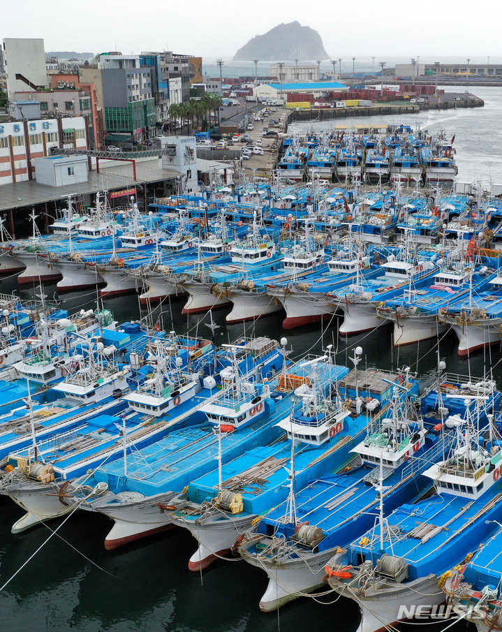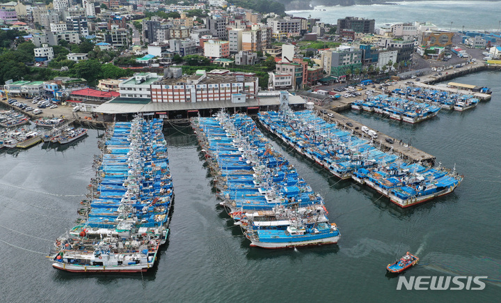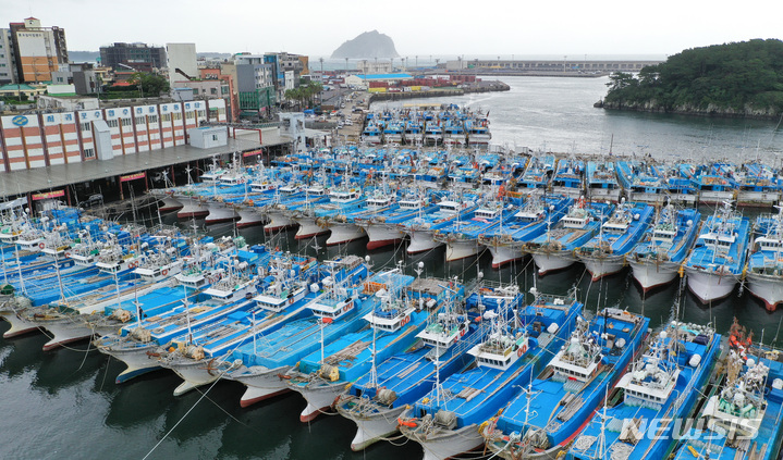【NEWSIS】台風11号(アジア名:ヒンナムノー)が北上中の4日午前、済州特別自治道西帰浦市の西帰浦港に避難した漁船。気象庁によると、台風11号は6日午前、済州島を通過して南海岸に上陸するものと予想されるとのことだ。