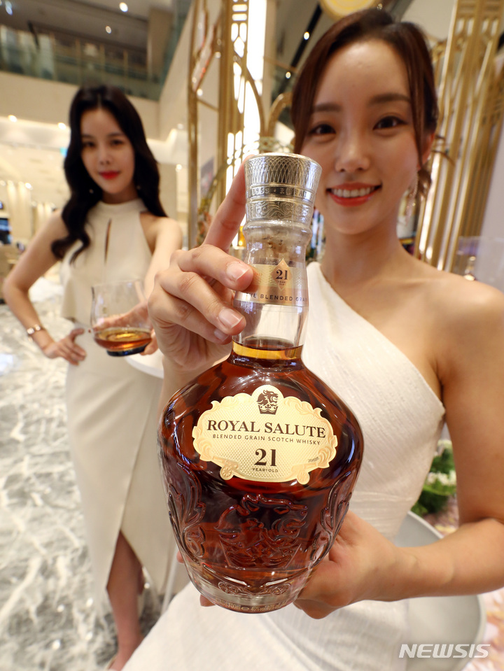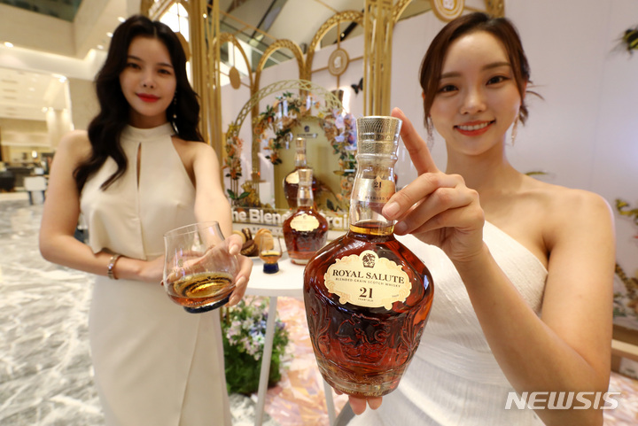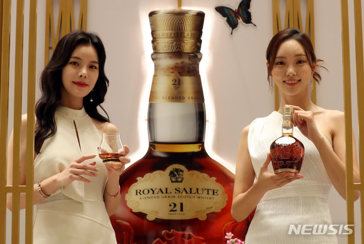 【NEWSIS】5日午前、ソウル市中区の新世界デパート本店1階「ロイヤルサルート・ポップアップストア」で、ペルノ・リカール・コリアが正規ラインナップで初めて発売するスコッチウイスキー「ローヤルサルート21年 ブレンデッドグレーン」のPRが行われた。ポップアップストアは9日までオープン。