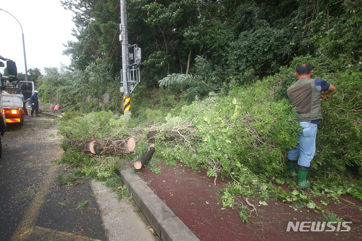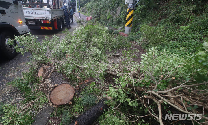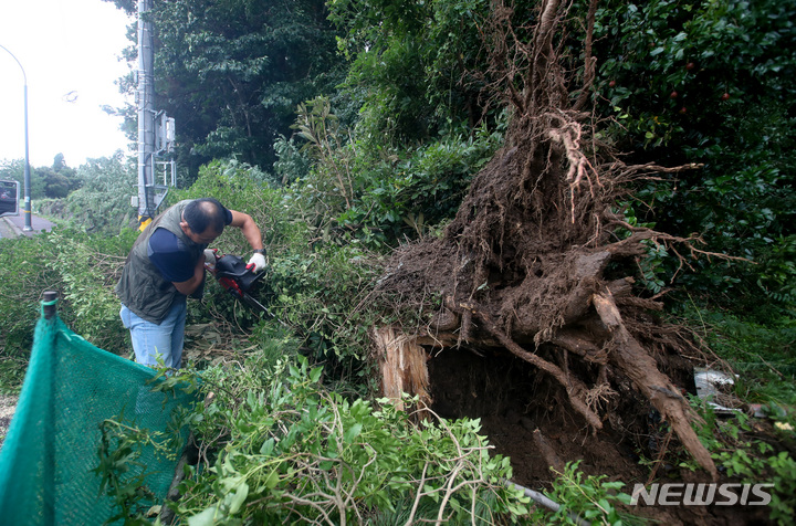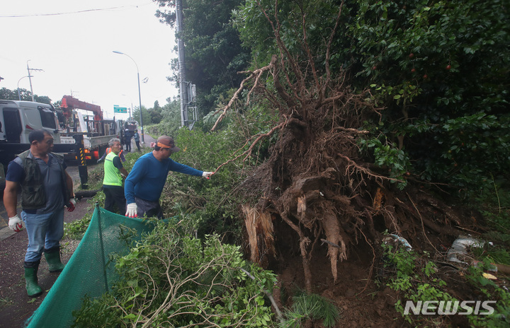 【NEWSIS】台風11号(アジア名:ヒンナムノー)が韓国を通過した6日午前、済州特別自治道済州市内では、道路横に立っていた木が強風で根元から倒れていた。
