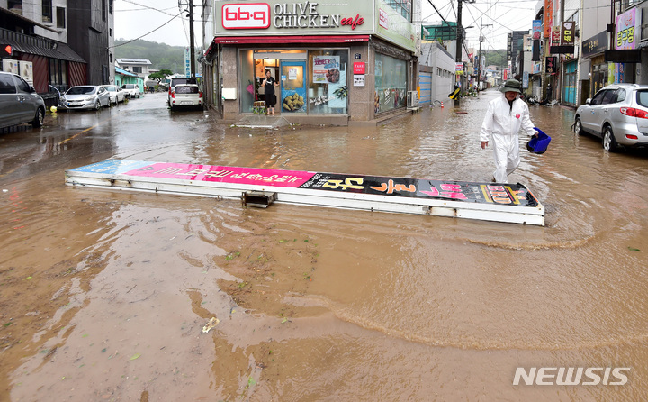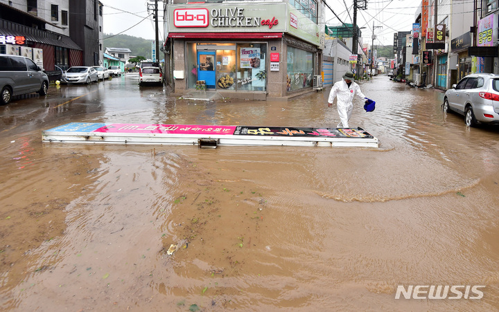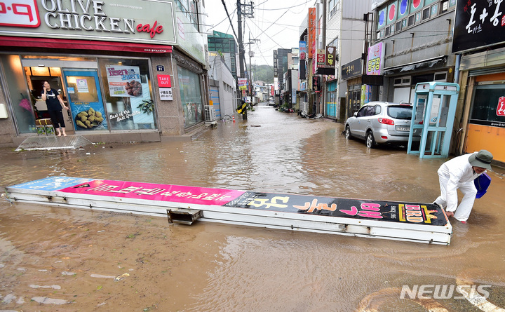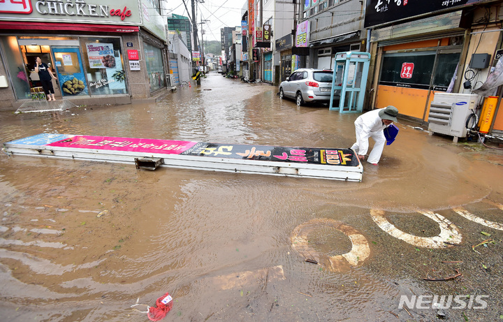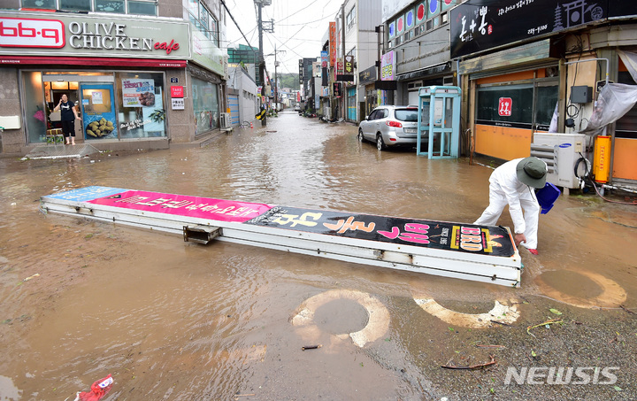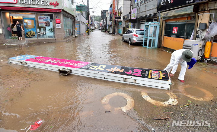 【NEWSIS】台風11号(アジア名:ヒンナムノー)が慶尚北道浦項市内を襲った6日午前、強風により落ちた看板の片付け作業が行われていた。