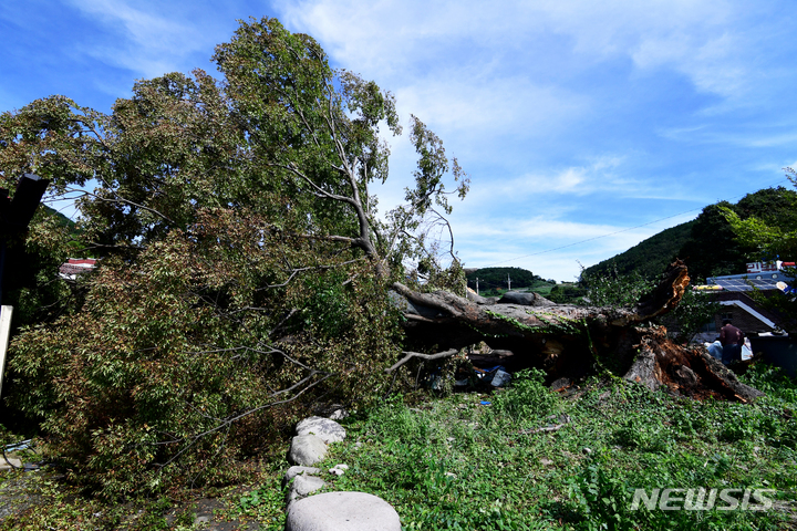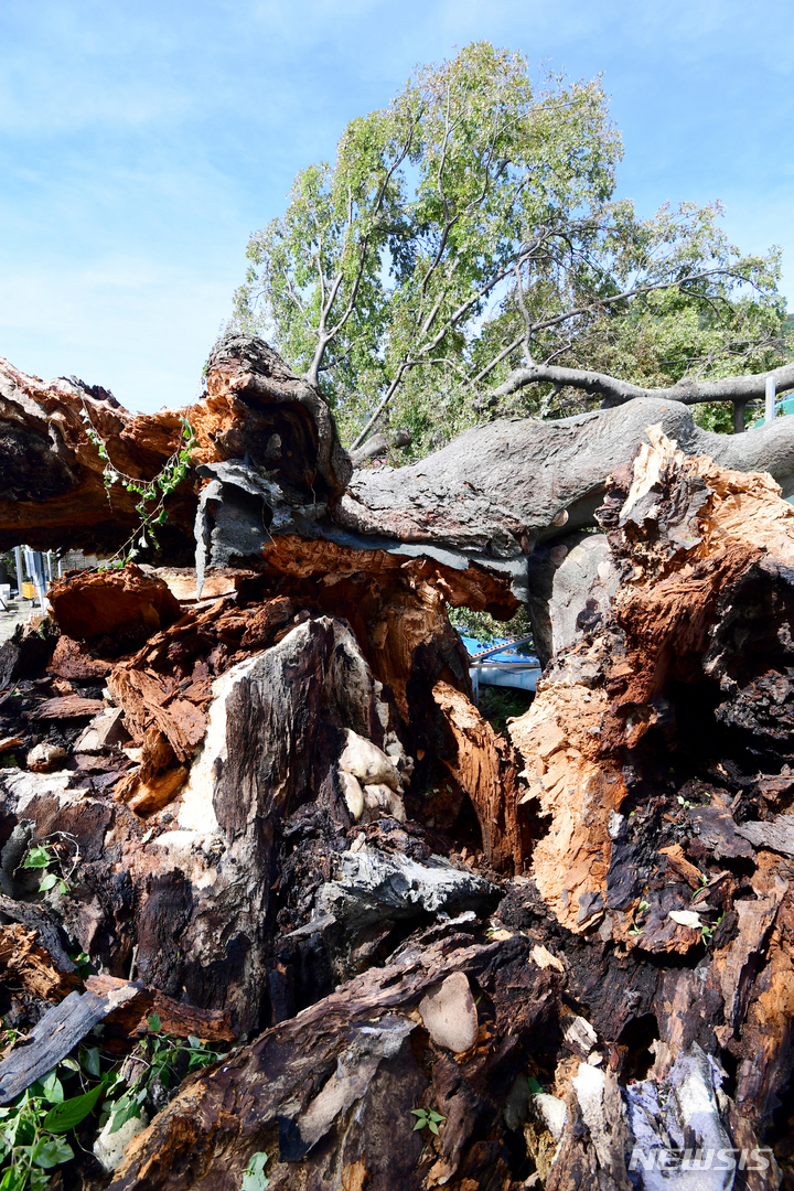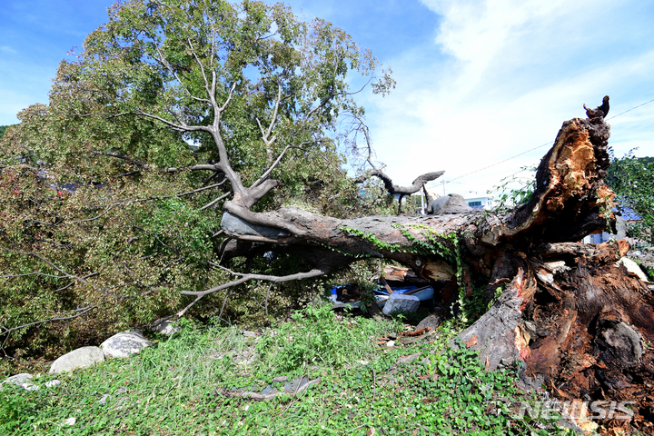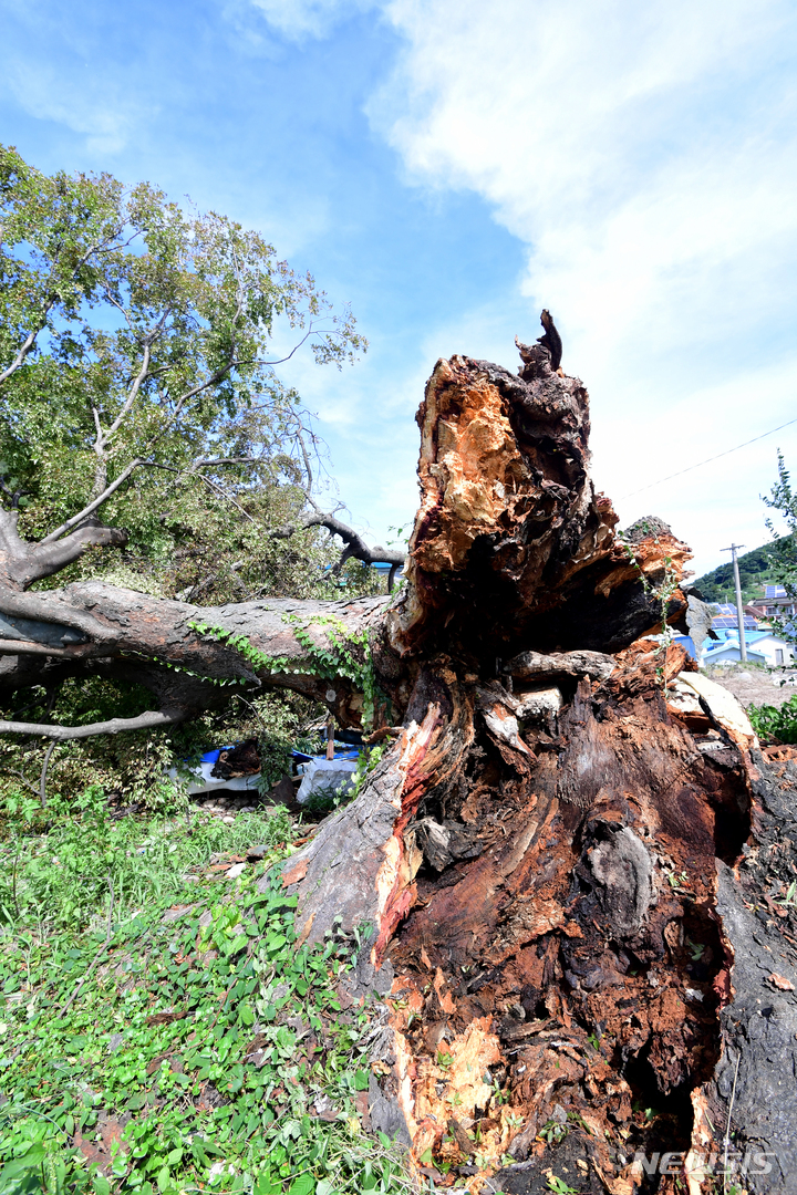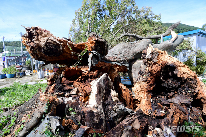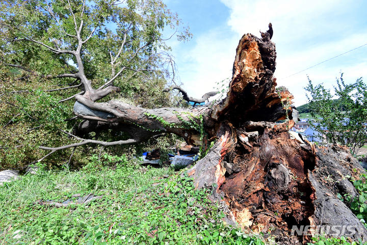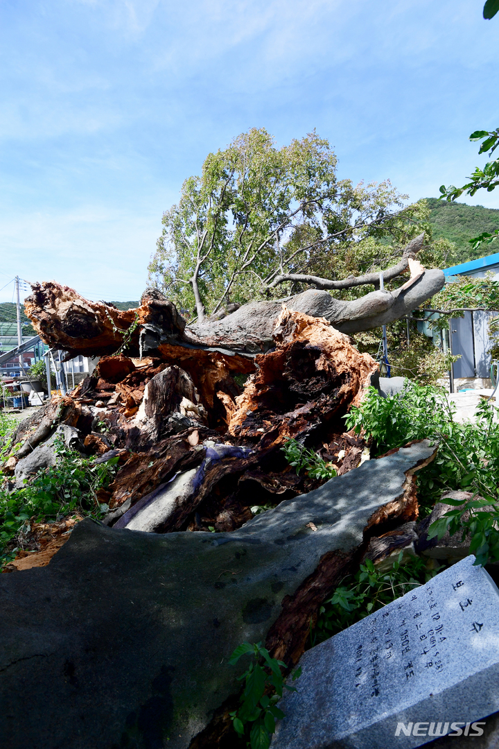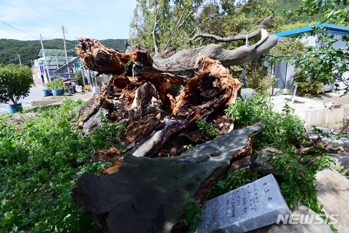 慶尚南道南海郡三東面ウンジョム村で6日午前、樹齢およそ350年の保護樹(ケヤキ)が、台風11号(アジア名:ヒンナムノー)の強風に耐えられず、折れてしまっている様子。