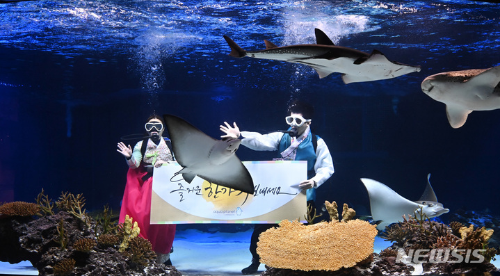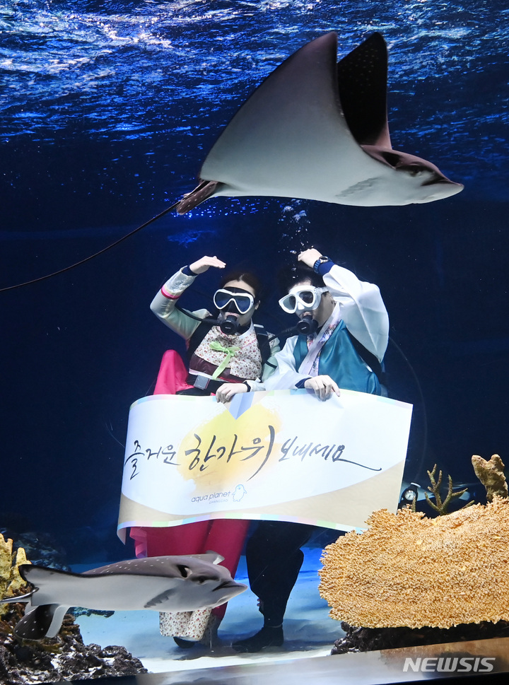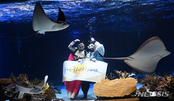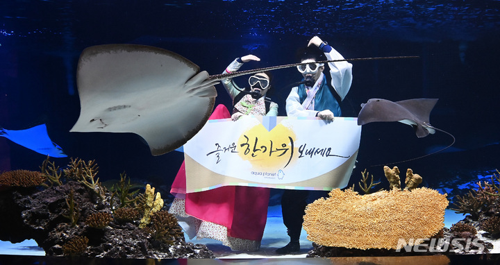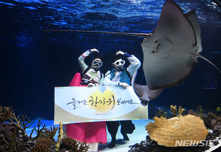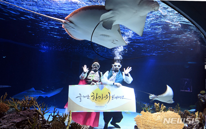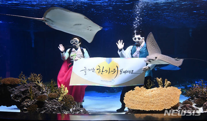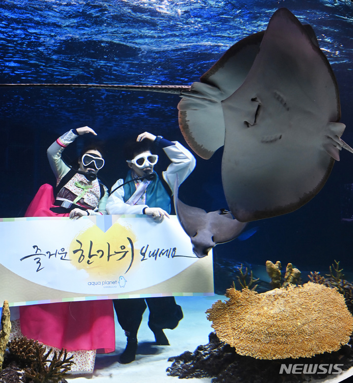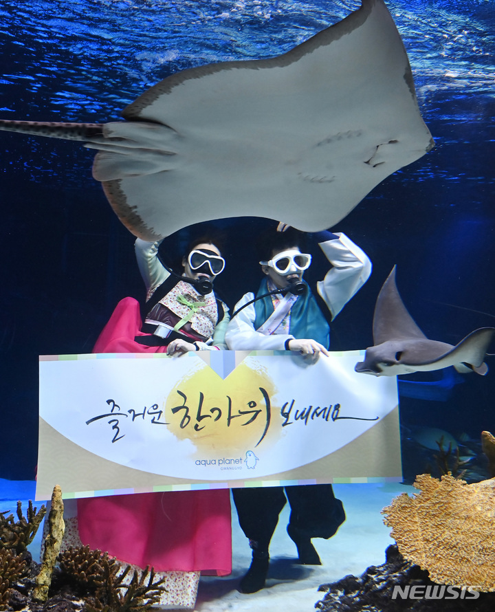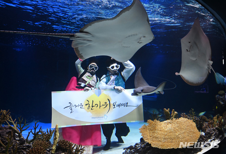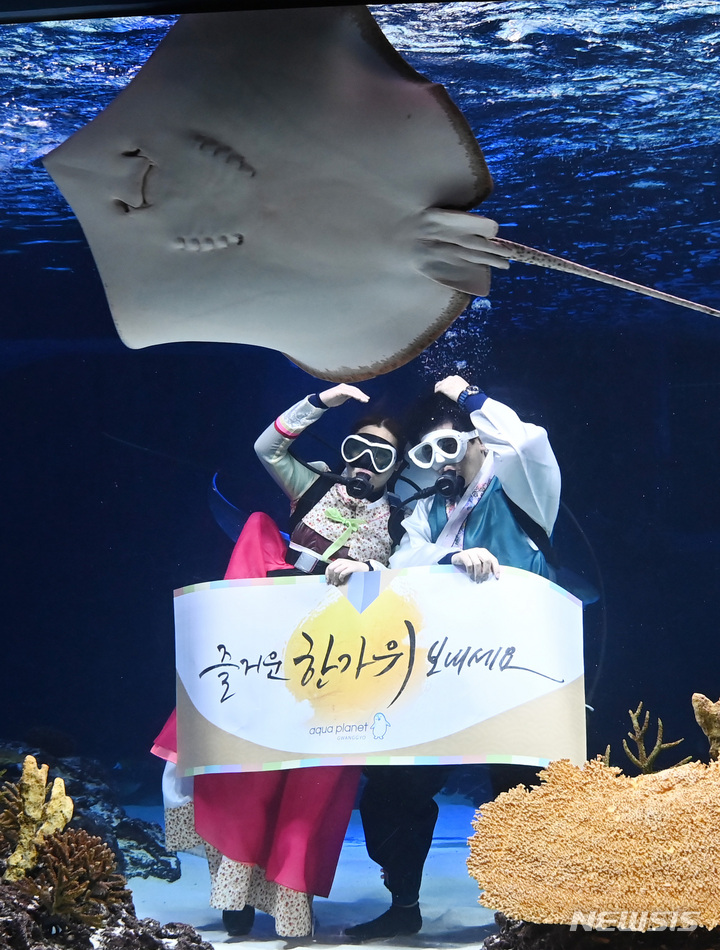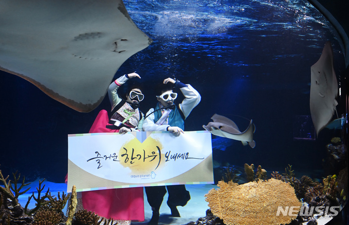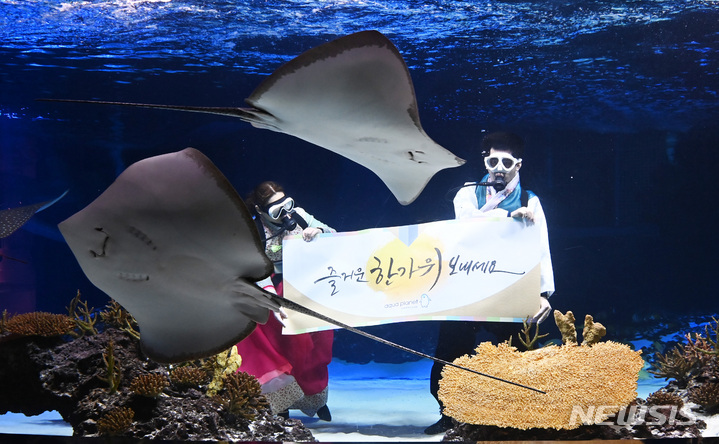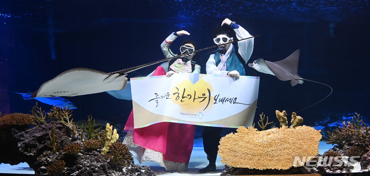 秋夕(中秋節。今年は9月10日)の連休まであと二日と迫った7日午前、京畿道水原市霊通区のアクアプラネット光教の水槽で、韓服服を着たアクアリストが水中パフォーマンスを行っている様子。