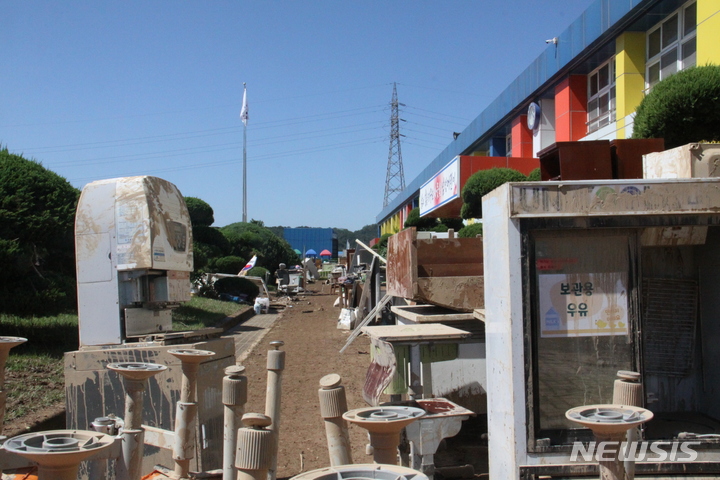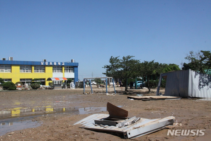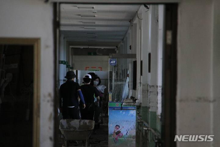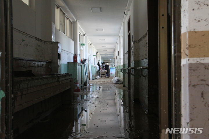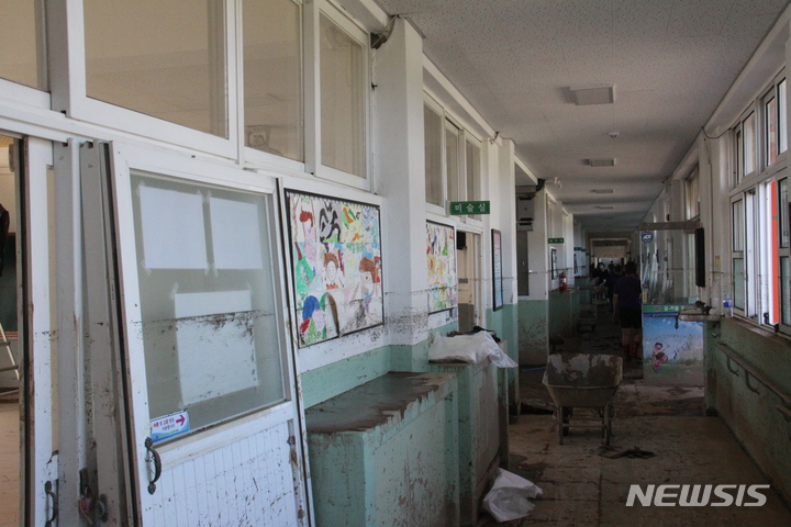 台風11号(アジア名:ヒンナムノー)の影響で浸水した慶尚北道浦項の南城小学校の様子。7日午前の時点で、建物の内部には前夜の浸水の痕跡がそのまま残っている。