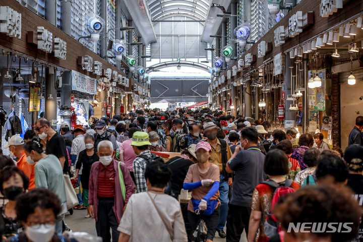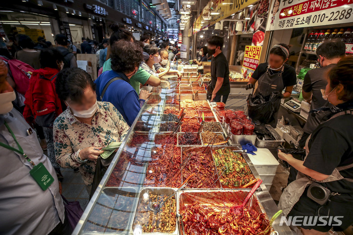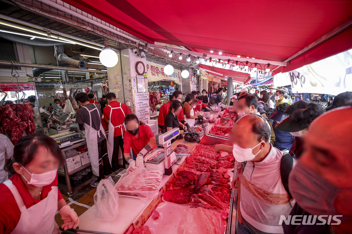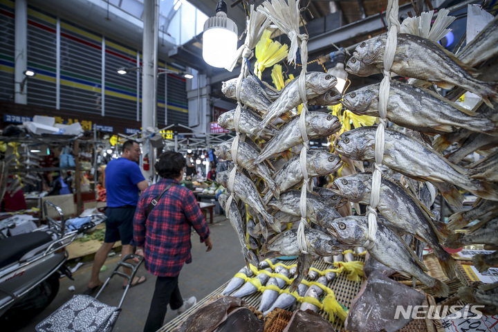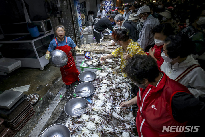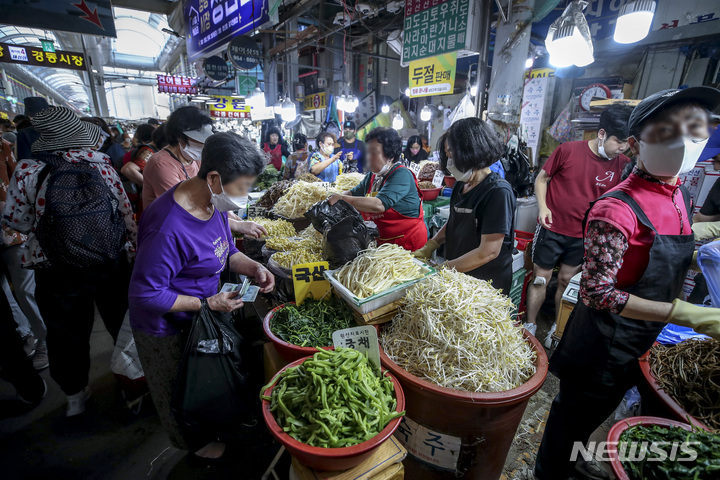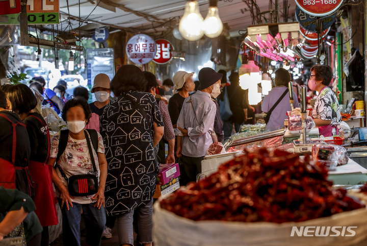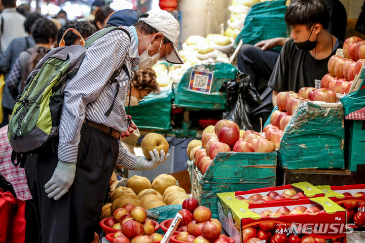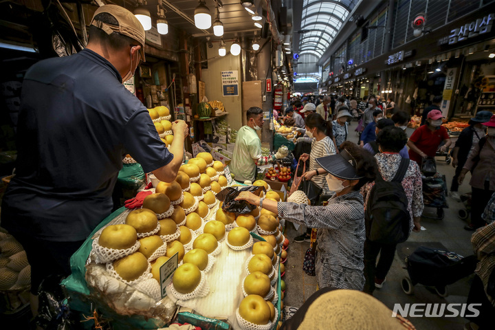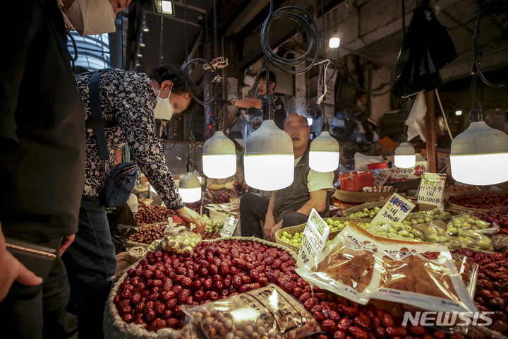 秋夕(中秋節。今年は9月10日)まであと三日と迫った7日、ソウル市東大門区の清凉里総合市場を訪れた市民が、祭祀に用いる品を買い求めている様子。
