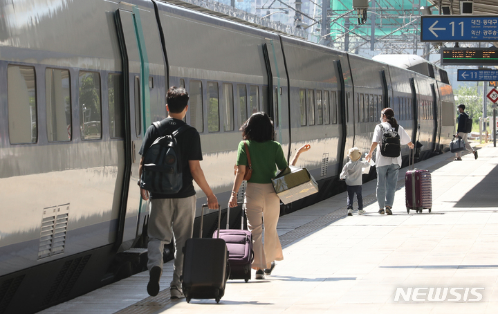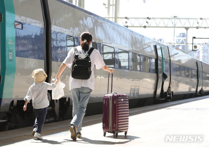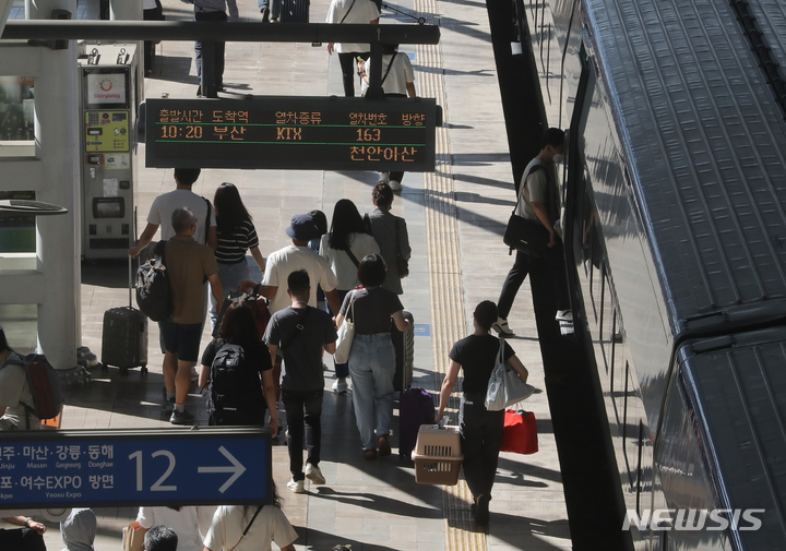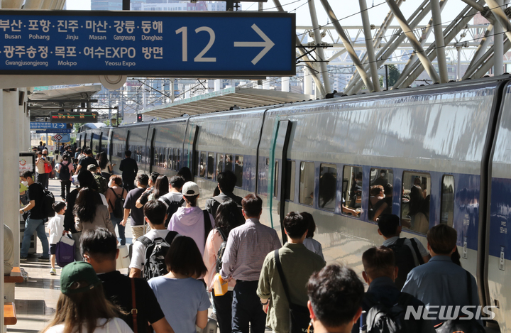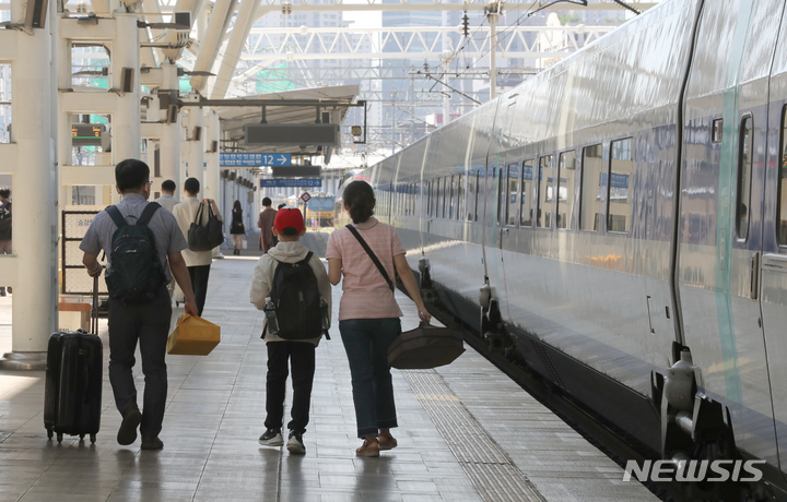 秋夕(中秋節。今年は9月10日)の連休まであと一日と迫った8日午前、ソウル市中区に位置するソウル駅のホームで帰省の途に就く市民の様子。