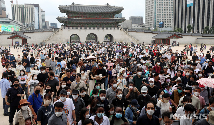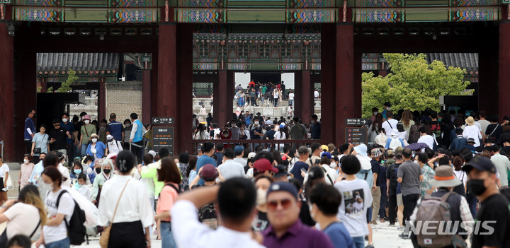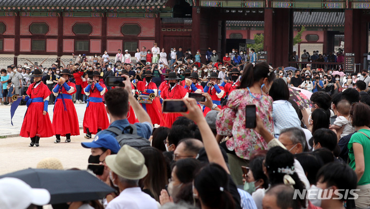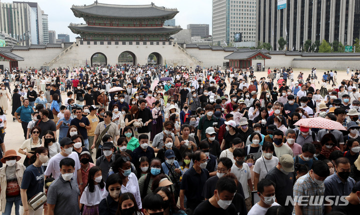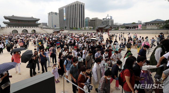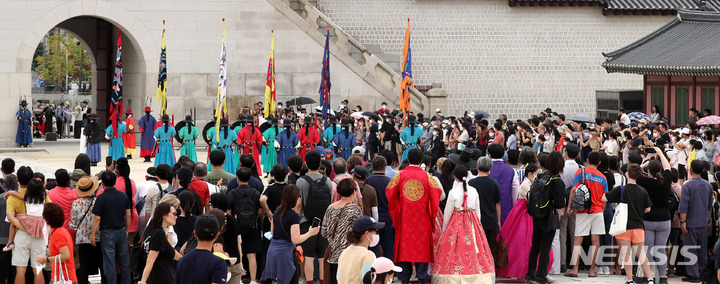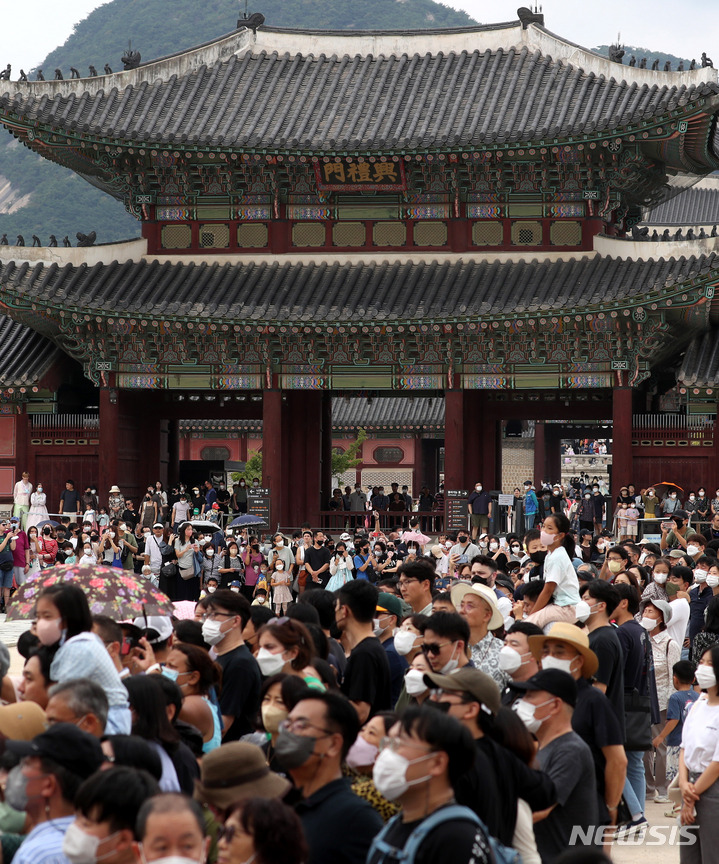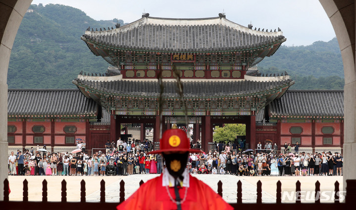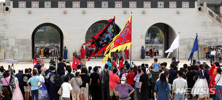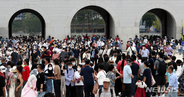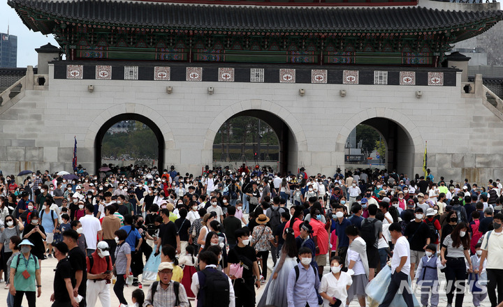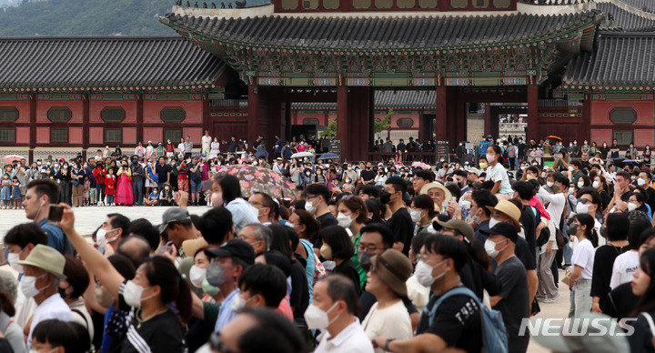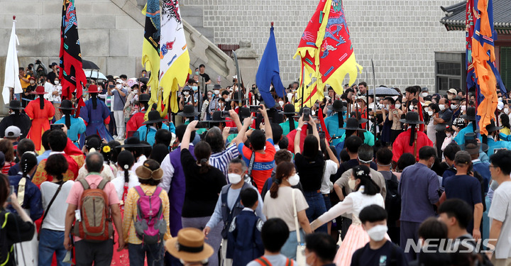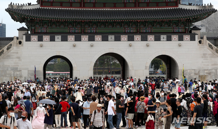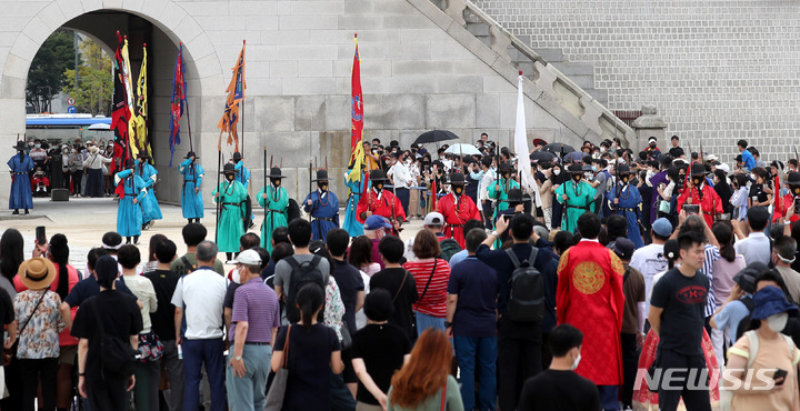 秋夕(中秋節。今年は9月10日)の連休最終日に当たる12日午後、景福宮(ソウル市鍾路区)で守門将交代の儀式を鑑賞した多数の市民や外国人観光客が移動している様子。