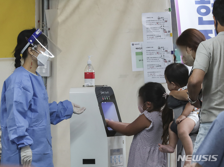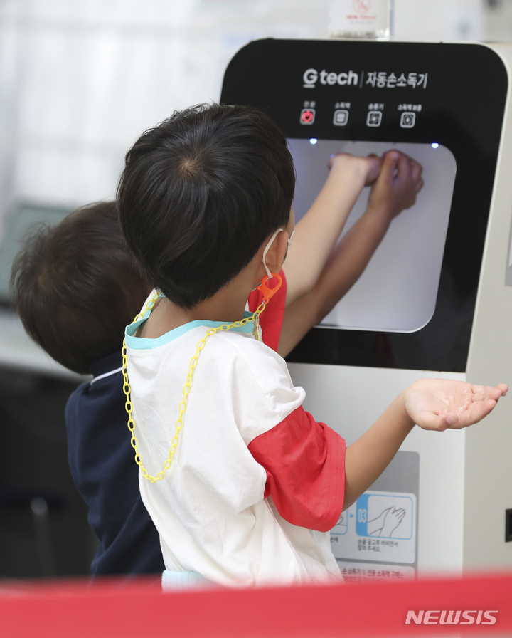 【NEWSIS】韓国の新型コロナウイルス一日新規感染者数が9万3981人と発表された14日午前、ソウル市の江南区保健所選別診療所(コロナ検査所)で検査前に手を消毒する子どもたち。