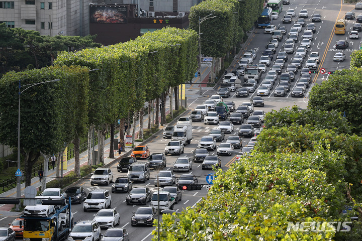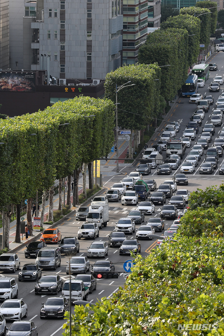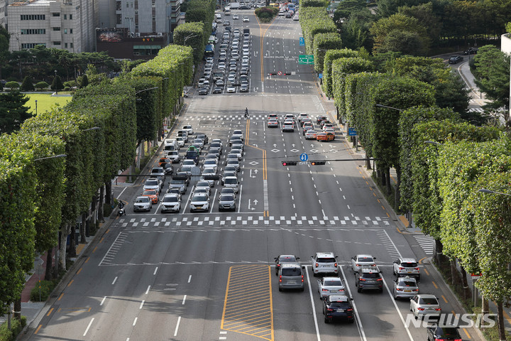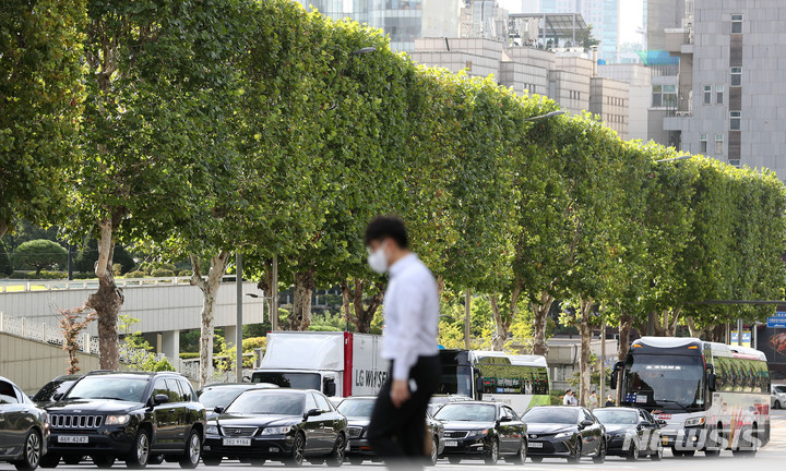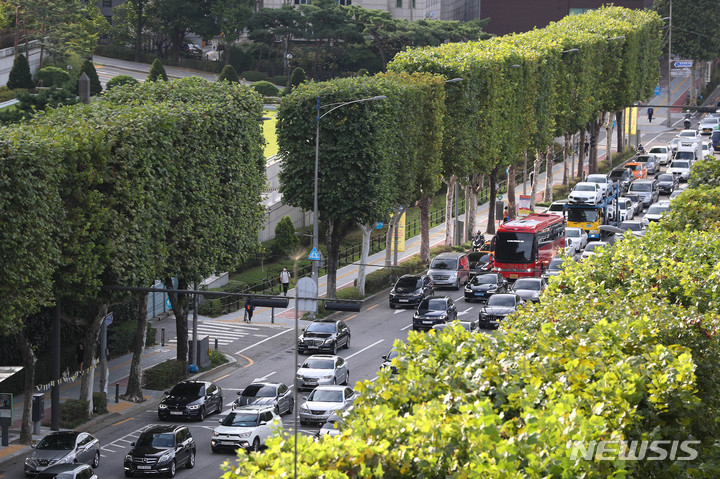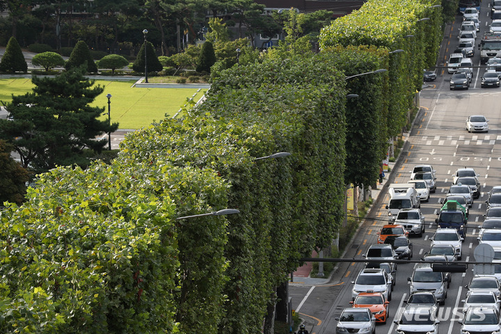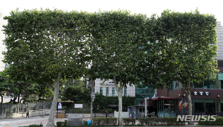 15日午前、四角形の街路樹が姿を現したソウル市瑞草区の盤浦大路一帯の様子。瑞草区によると、盤浦大路など総延長6.8キロの街路樹724本を四角形に剪定する作業を14日に完了したという。