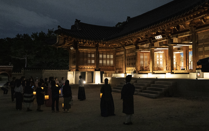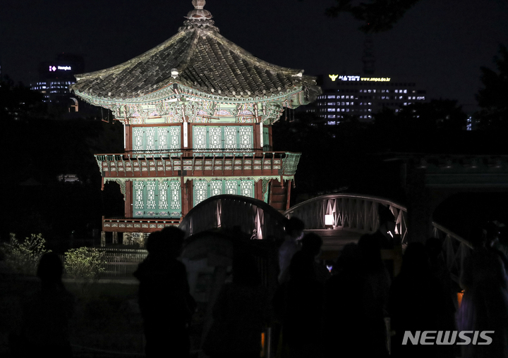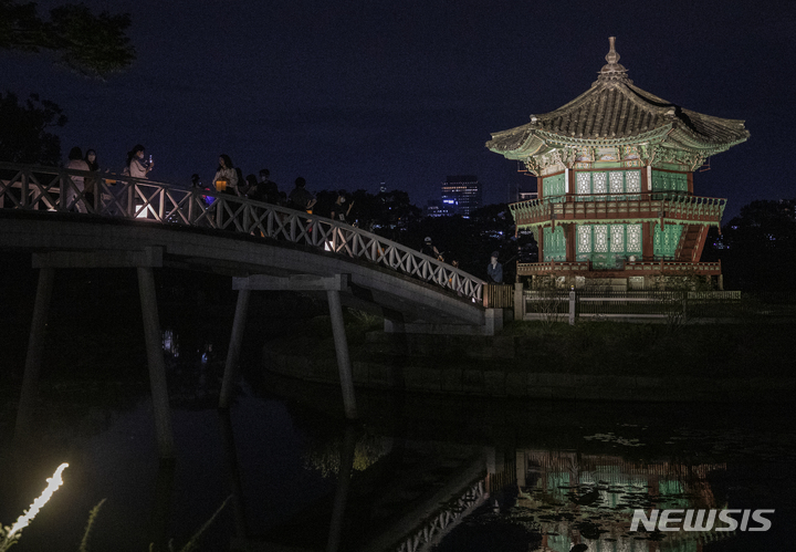 【NEWSIS】15日午後、ソウル市鍾路区の景福宮一帯で行われた「星光夜行」で、ライトアップされた夜の景福宮を楽しむ人々。