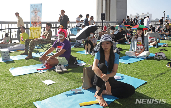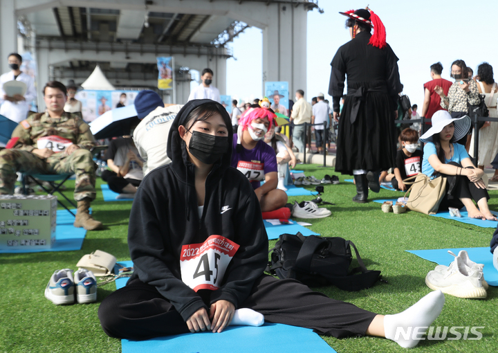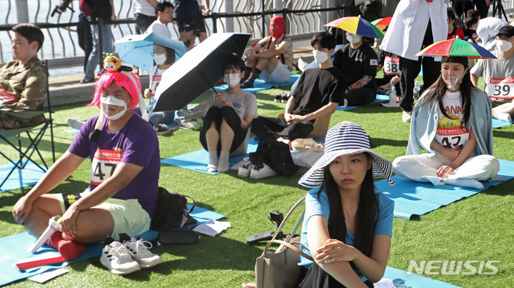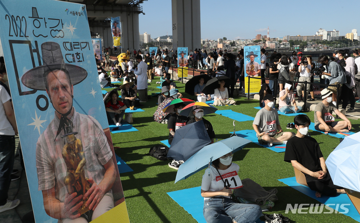 【NEWSIS】18日午後、ソウル市瑞草区の漢江潜水橋で行われた「2022漢江ぼーっとする大会」に参加した人々。この日の大会には女優オム・ヒョンギョンさんも参加して注目を集めた。