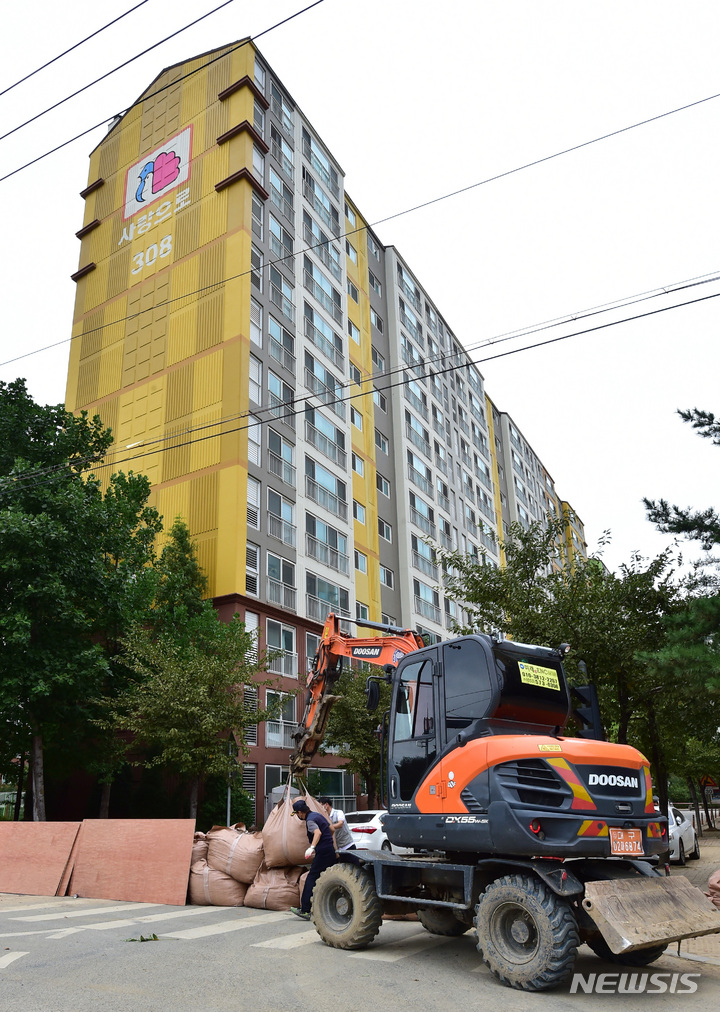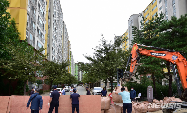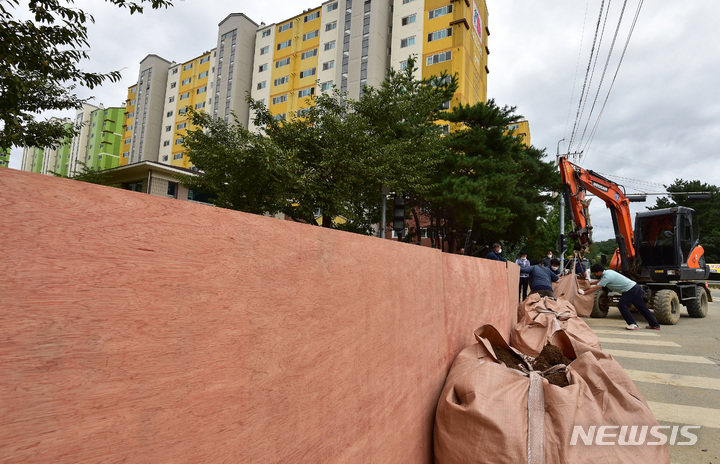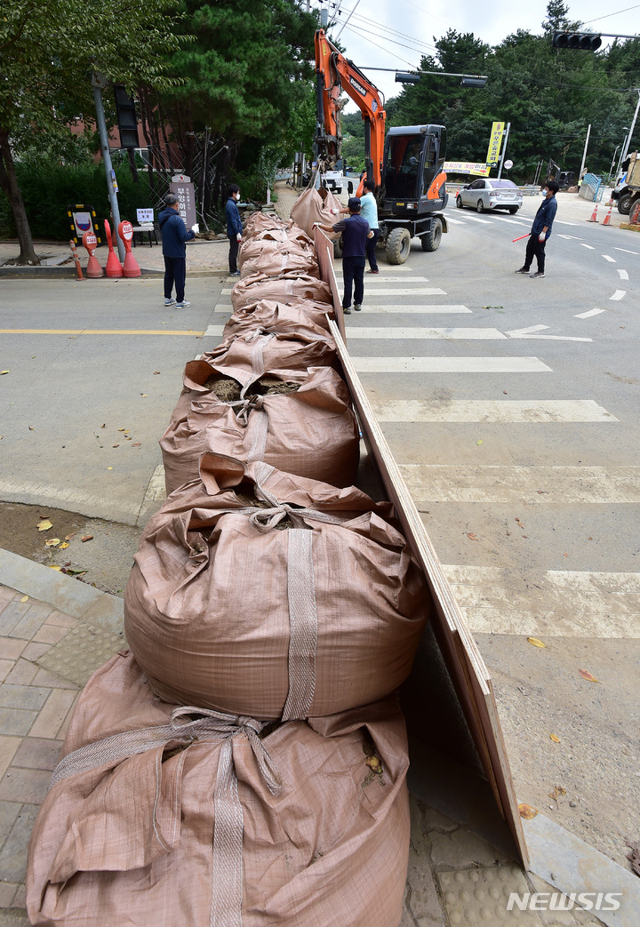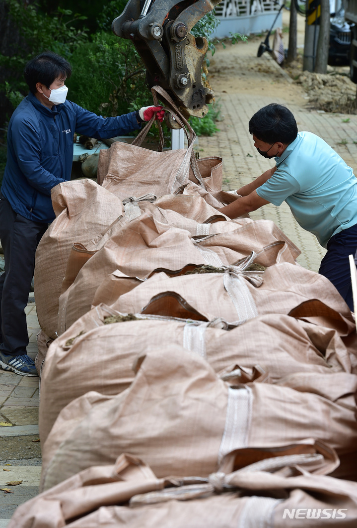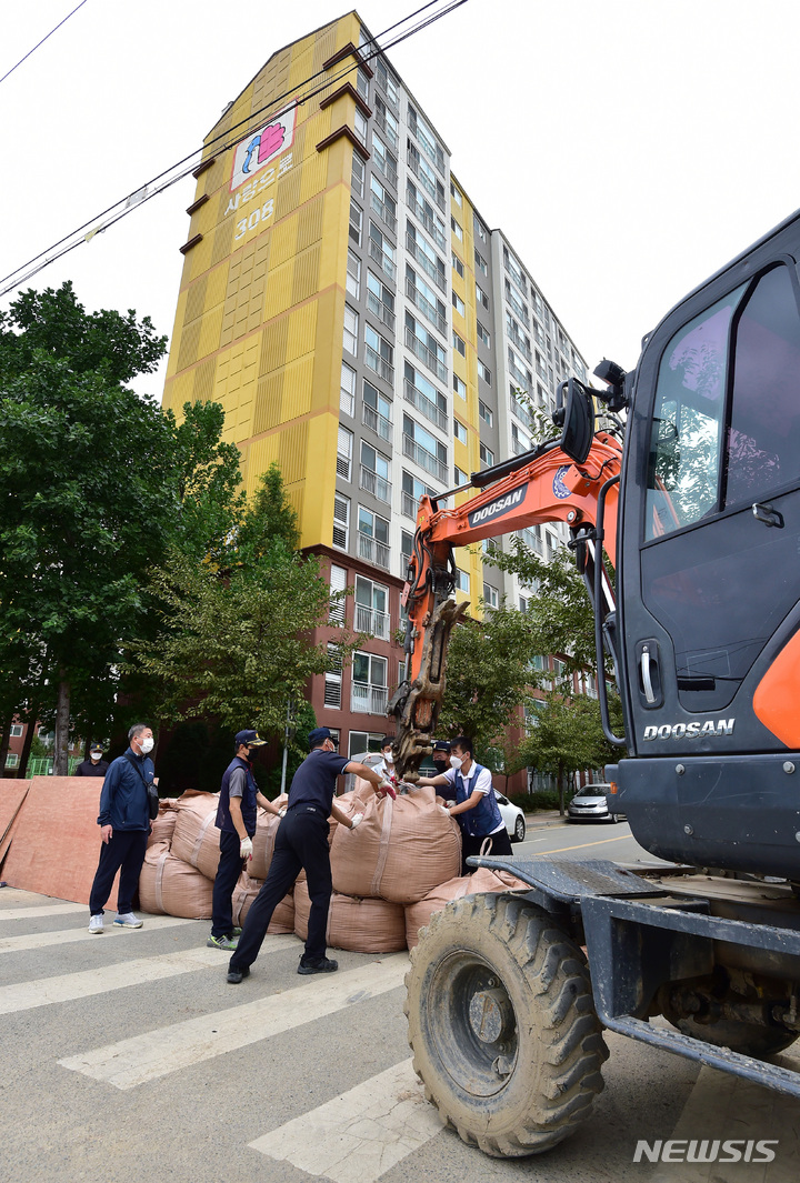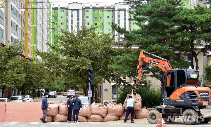 【NEWSIS】台風14号(アジア名:ナンマドル)が北上中の18日午後、慶尚北道浦項市南区のマンション裏門で、浸水を防ぐため土のうを積む市の関係者。