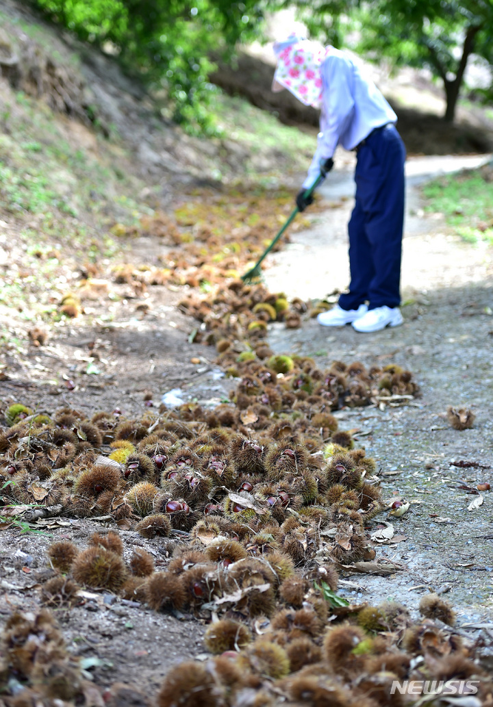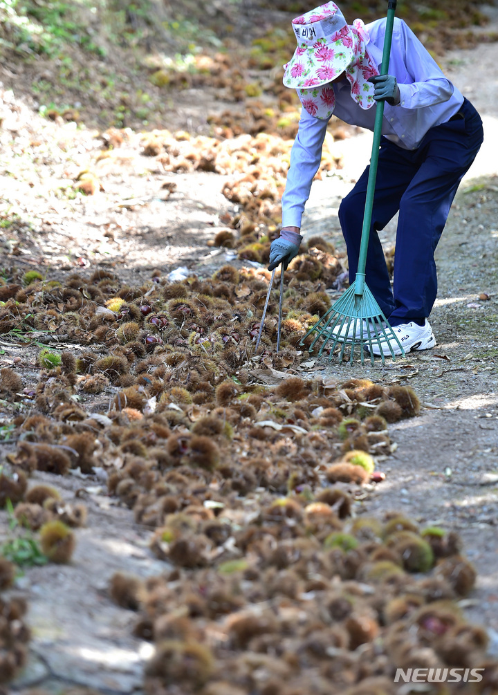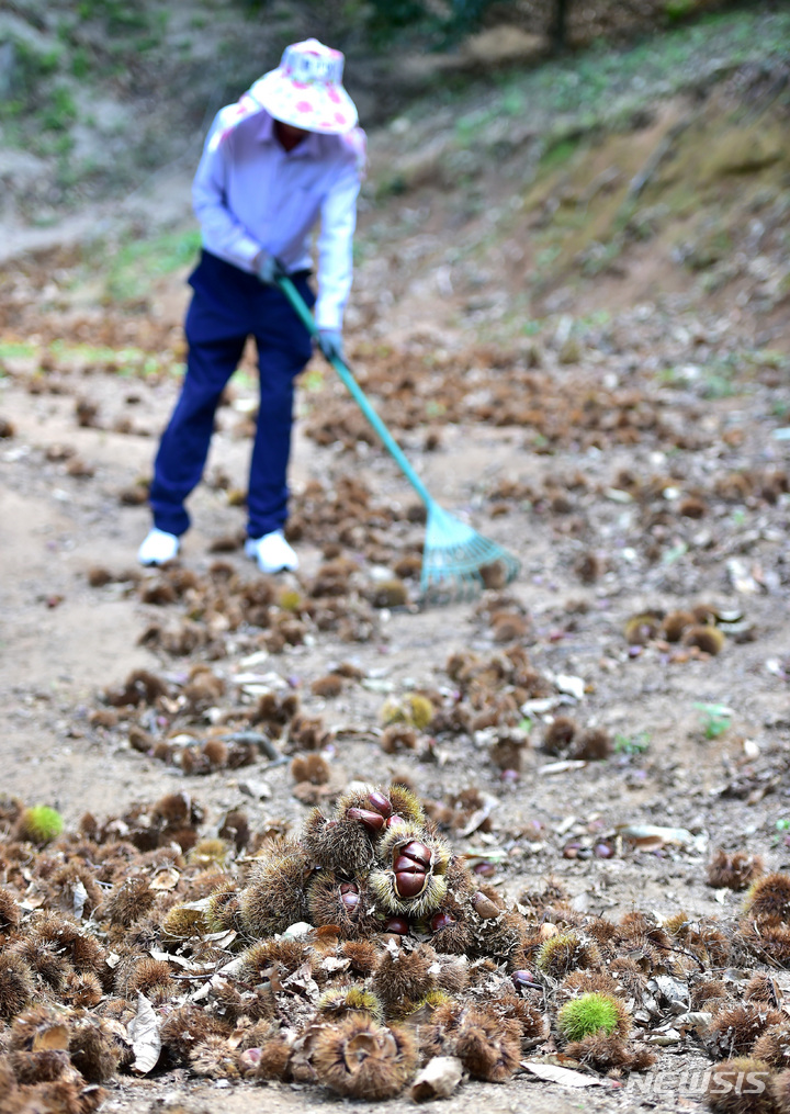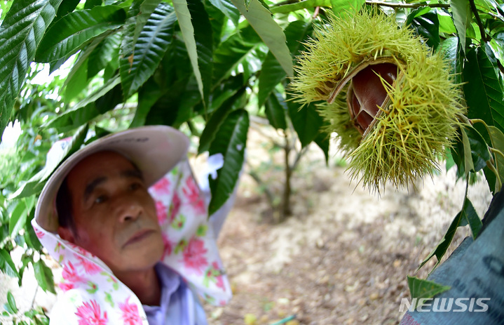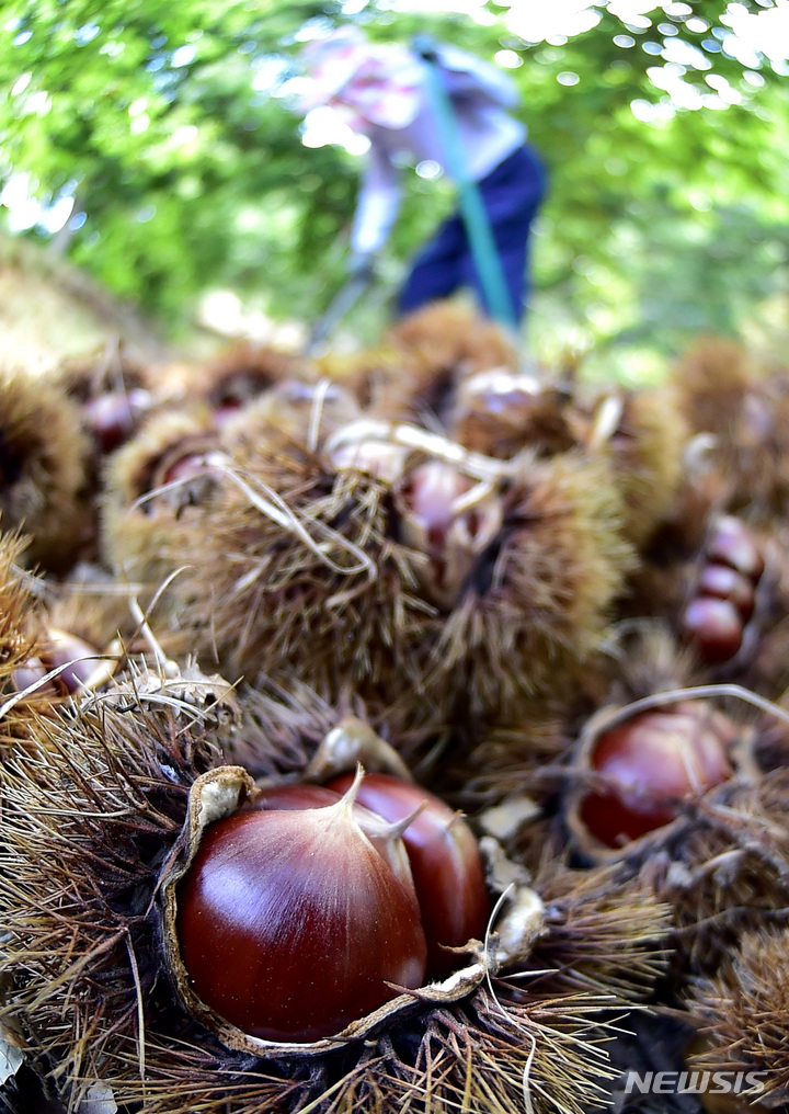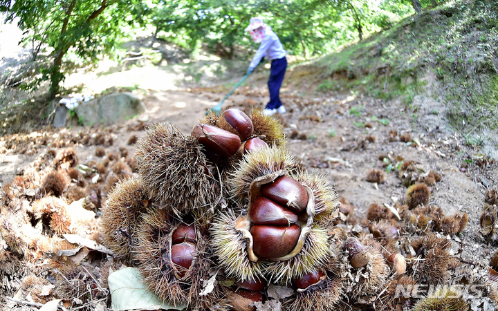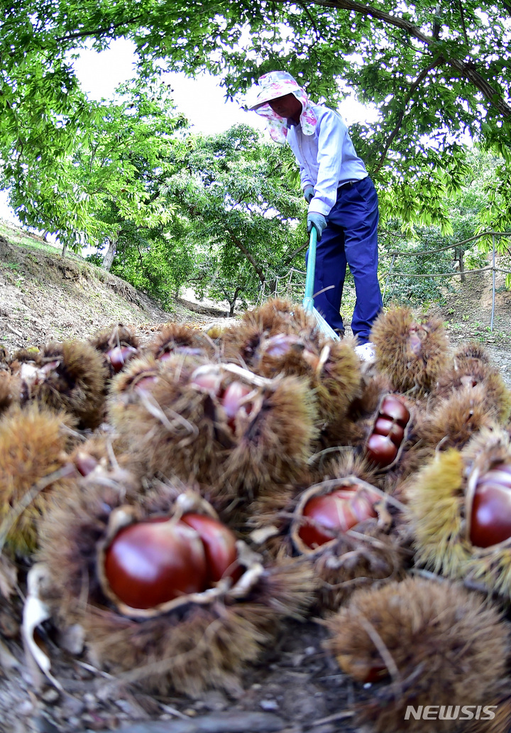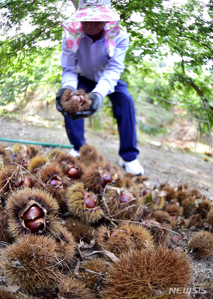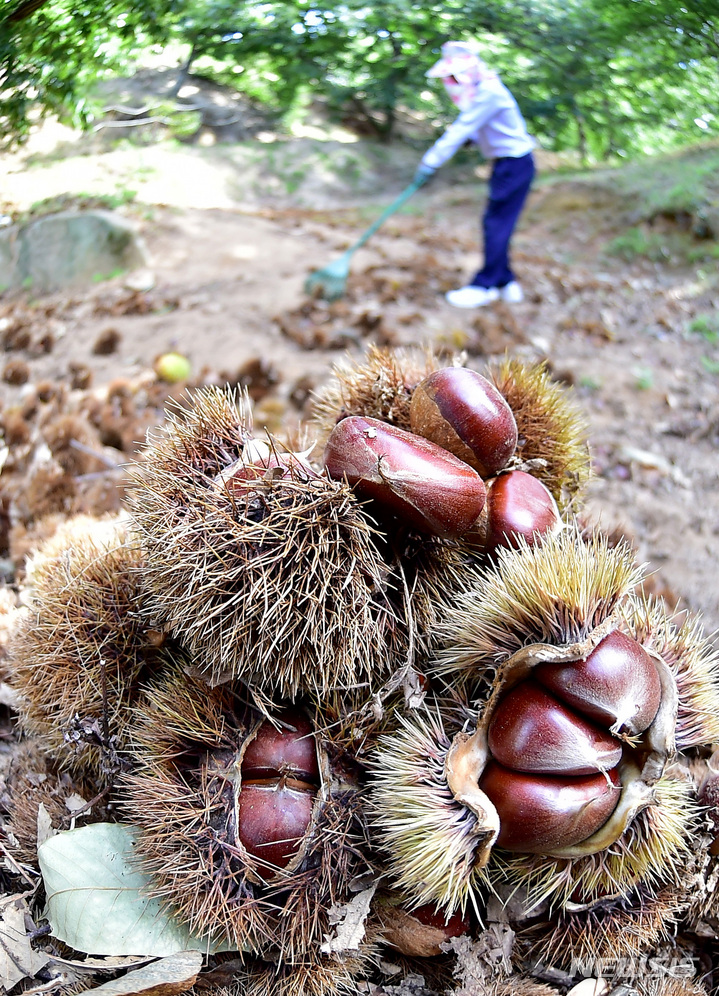 秋分の日まであと一日と迫った22日午後、大邱市東区美岱洞のクリ農場では、関係者が今年の初物クリの収穫作業を進めていた。