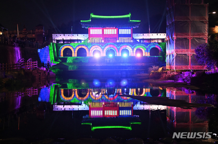 写真は21日、水原市八達区の華虹門で行われたメディアアートショーのリハーサルの様子。