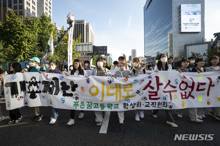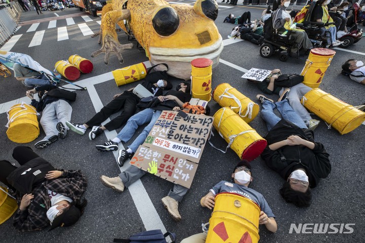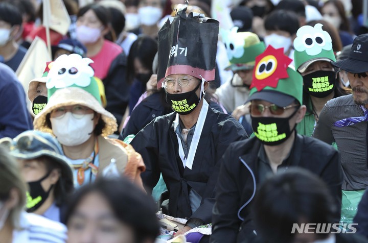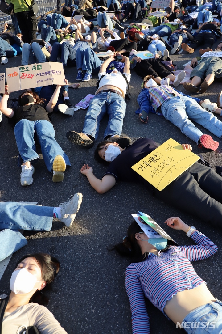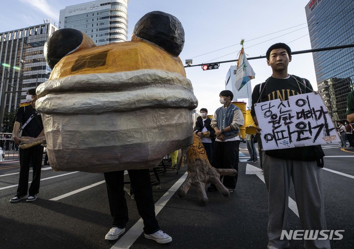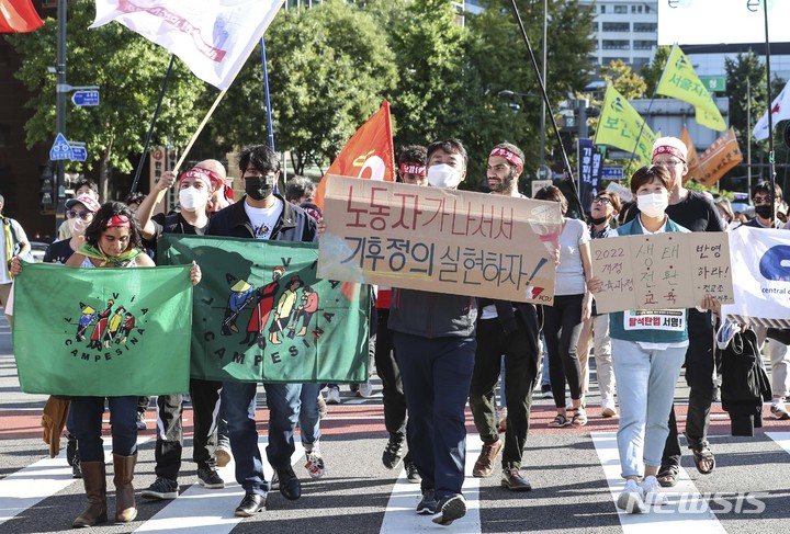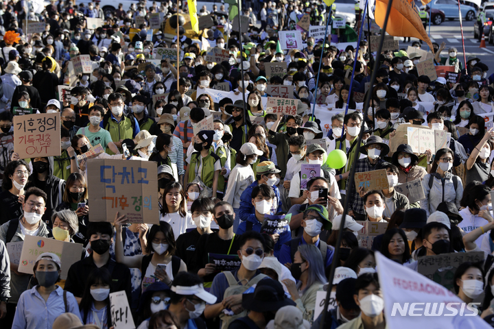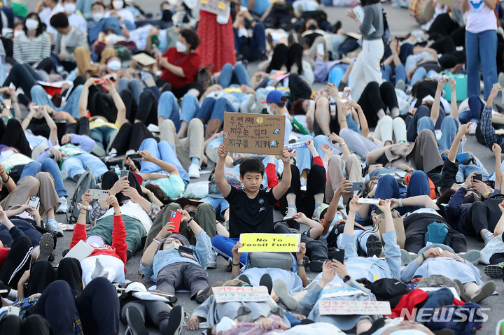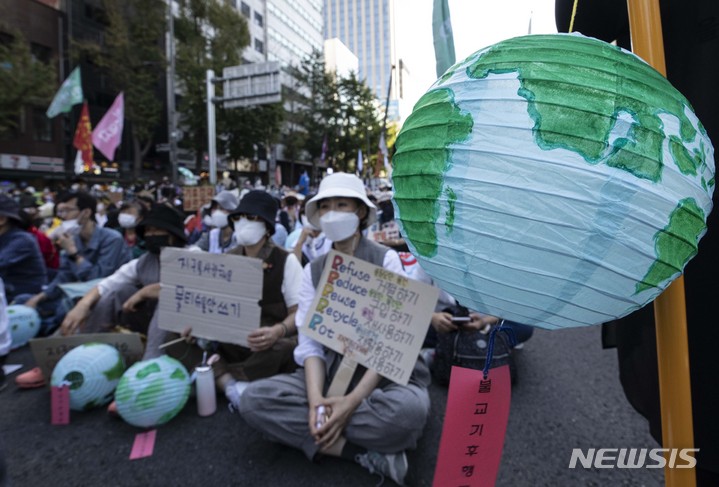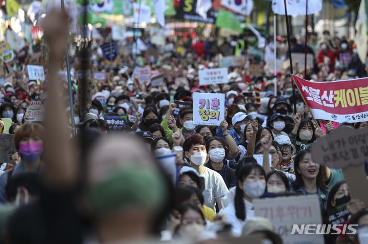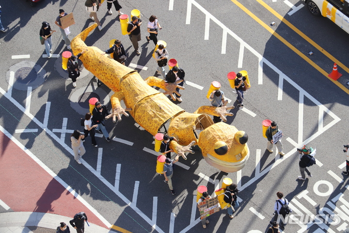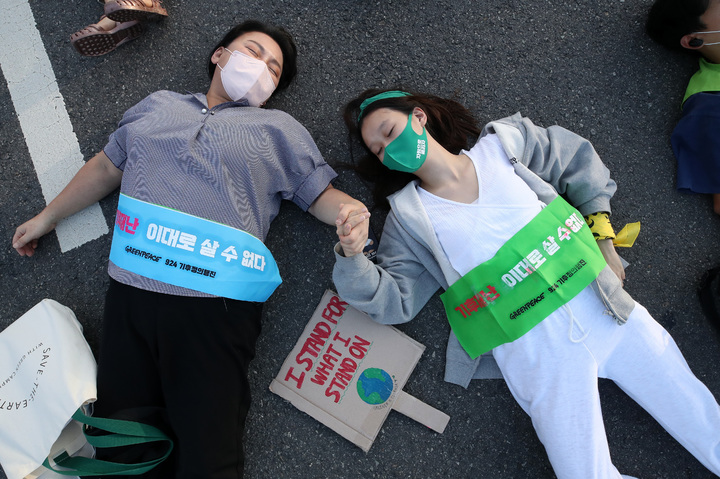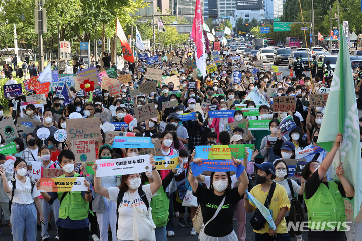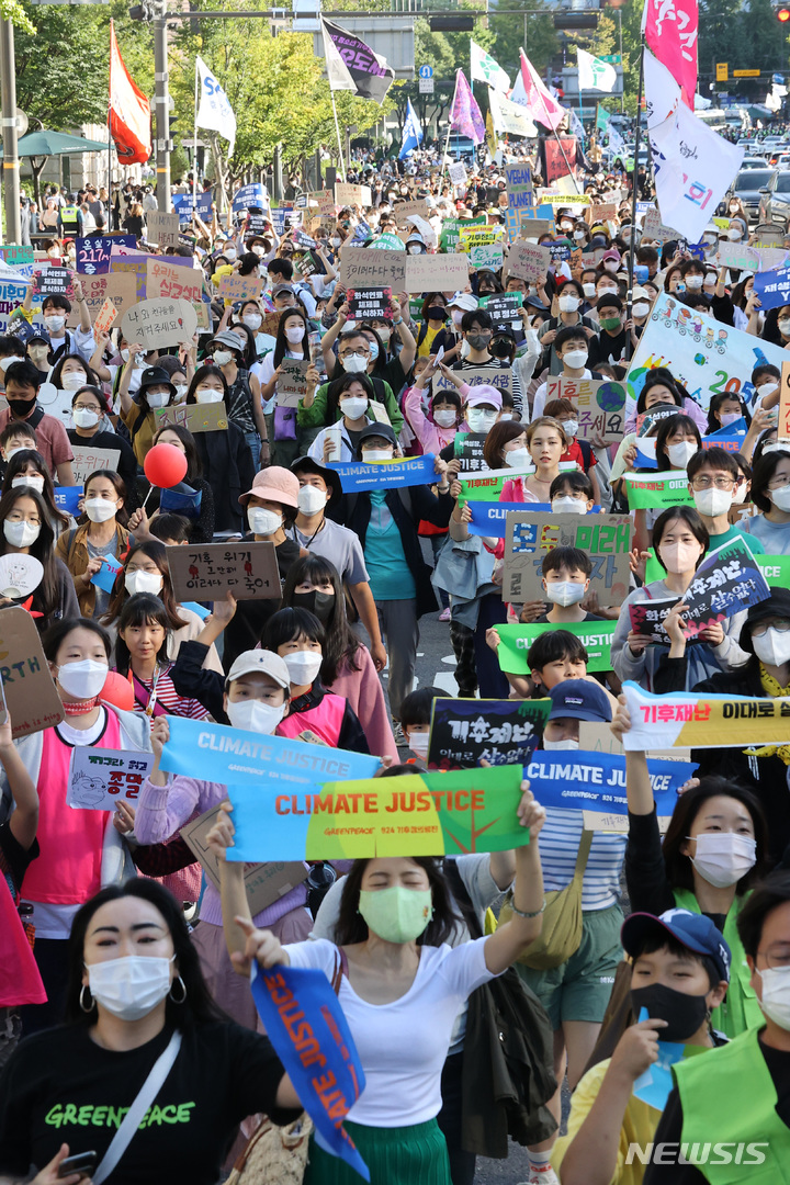 ソウル市庁付近の世宗大路で24日、「9・24気候正義行進」の参加者らが、化石燃料と生命破壊体制の終息を求めて行進している様子。