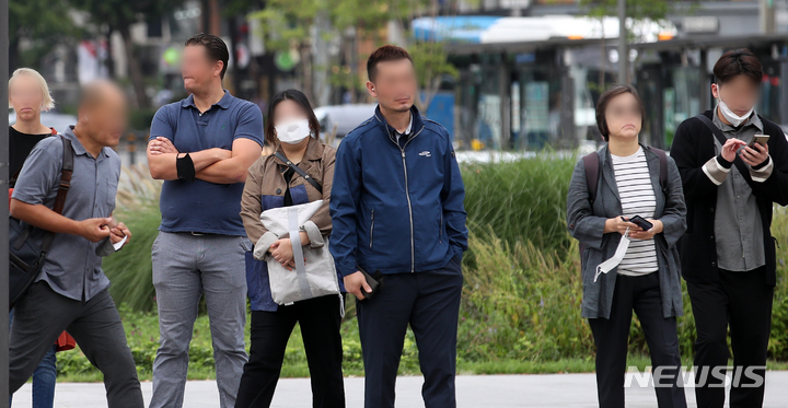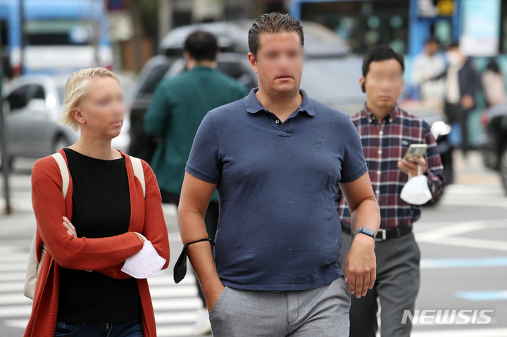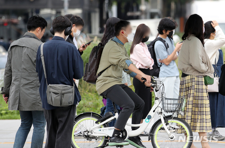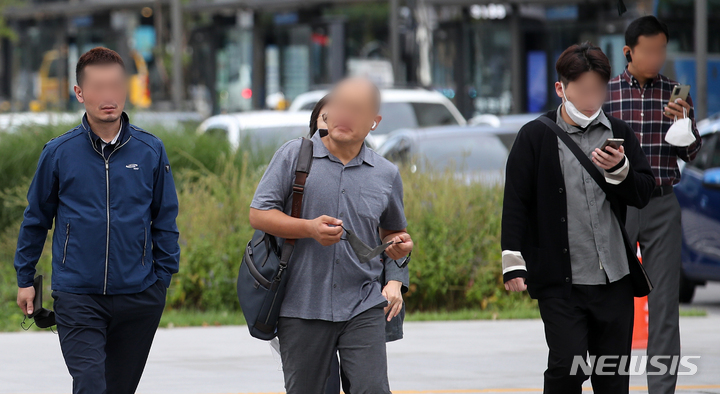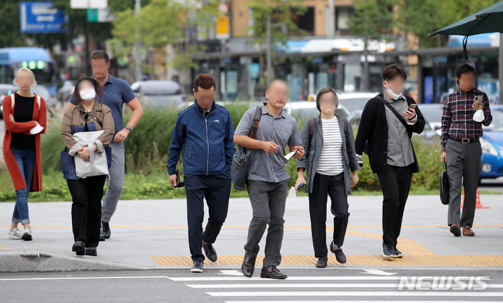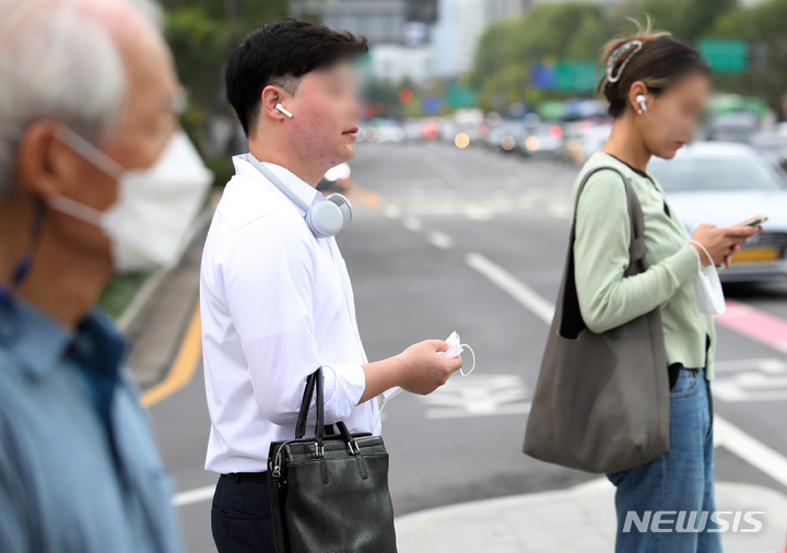【NEWSIS】屋外でのマスク着用義務が全面解除された26日午前、ソウル市鍾路区の世宗大路近くで、マスクを外して出勤する人々。