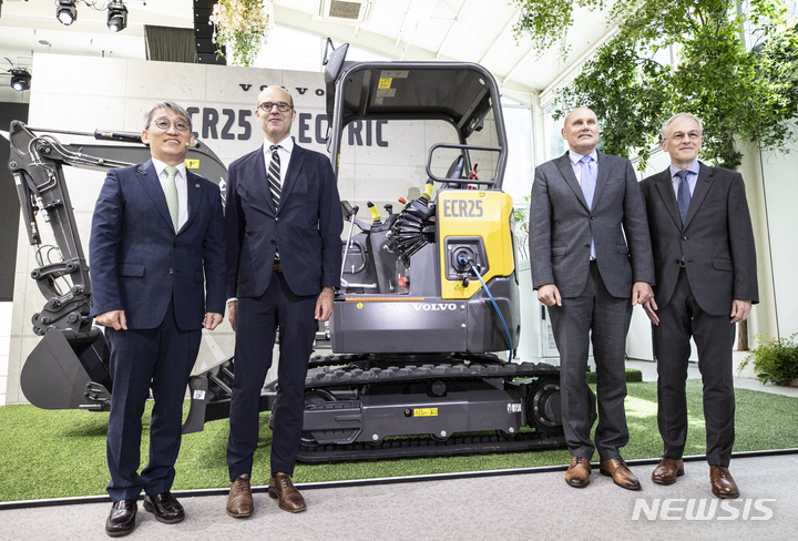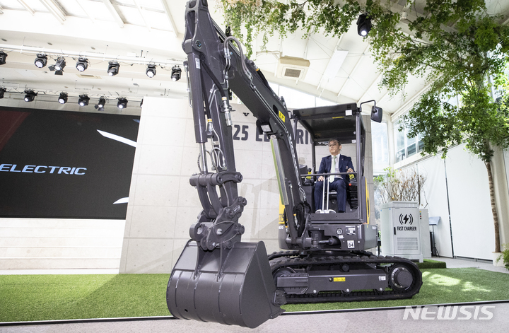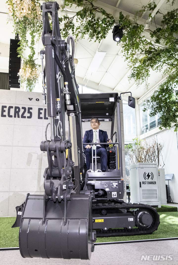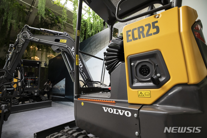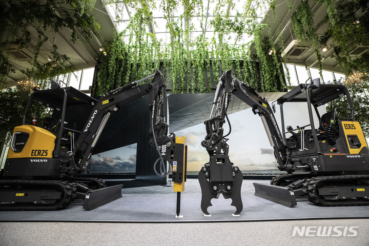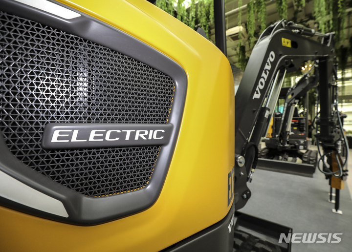 ボルボ建設機械コリアが純粋電気ショベルカー「ECR25」の発売メディアイベントを開催した28日午前、ソウル市中区のCREST72でお披露目されたECR25の様子。