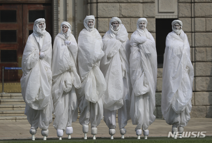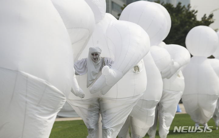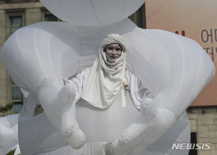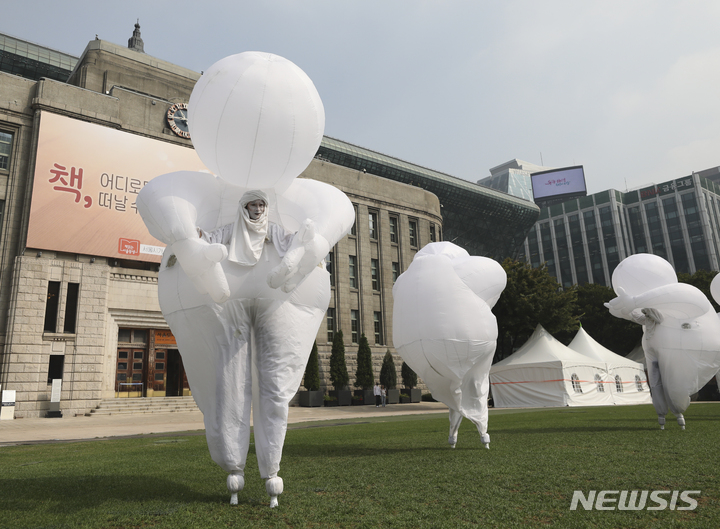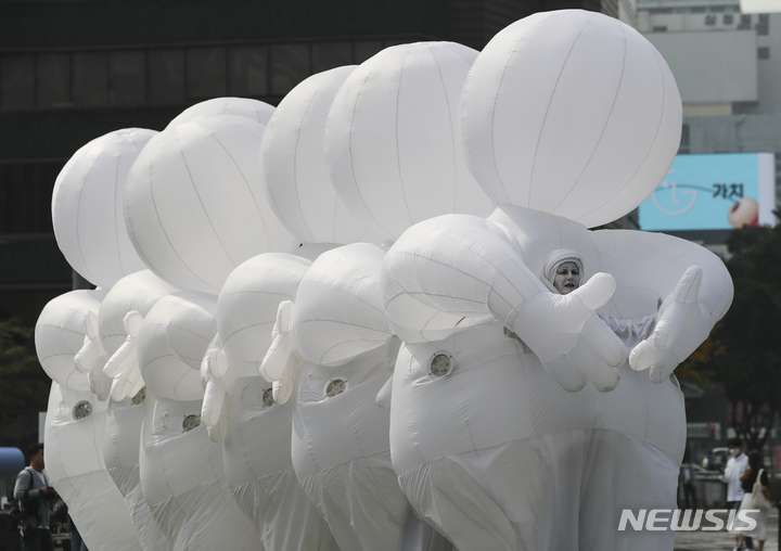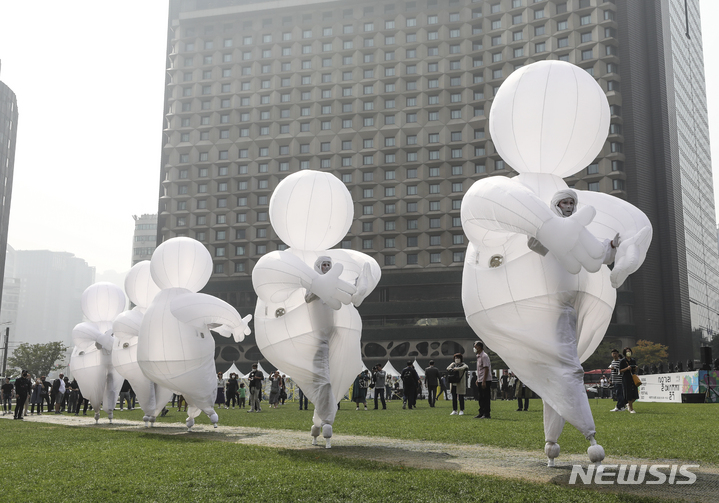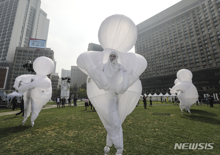 ソウル・ストリート・アート・フェスティバル(SSAF2022)開催まであと一日となった29日午前、ソウル市庁前でカンパニー・デ・キダム(Compagnie des Quidams)のメンバーが「ハーバートの夢(Reve d'Herbert)」のパフォーマンスを披露している。