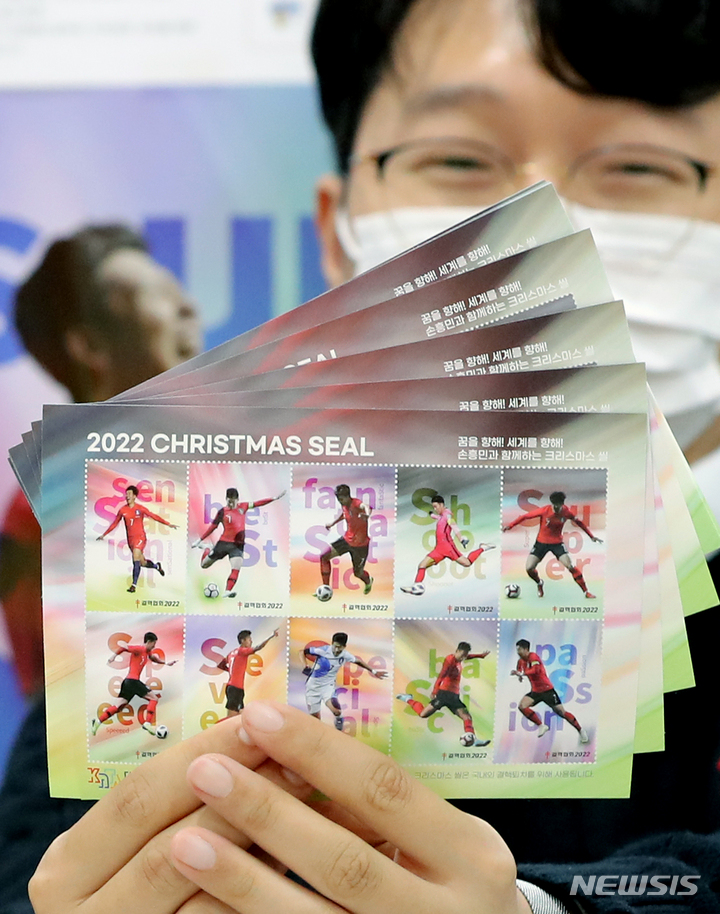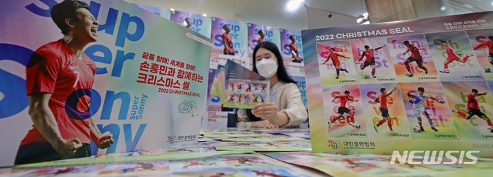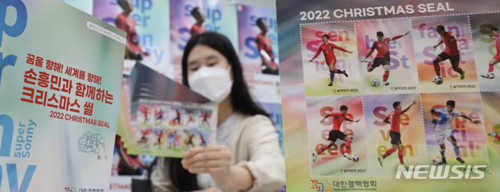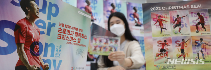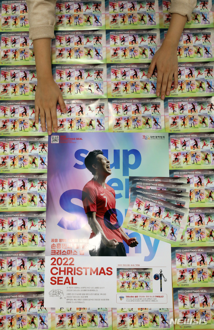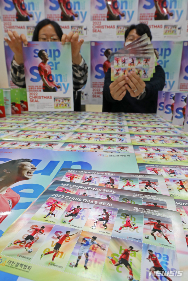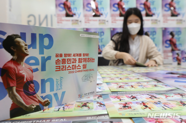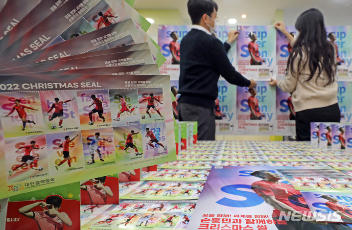 ソウル市瑞草区の大韓結核協会で4日午前、職員が「ソン・フンミンと共にある2022クリスマスシール」を整理しているところ。大韓結核協会は、ソン・フンミン選手の躍動的な姿を収めた今年のクリスマスシールを発行し、今月1日から結核退治基金整備のための本格的な募金キャンペーンを行っている。シール募金は同協会の寄付ストア、韓国各地の郵便局窓口、コンビニチェーンGS25をはじめ各学校・職場の切手募金を通して参加できる。