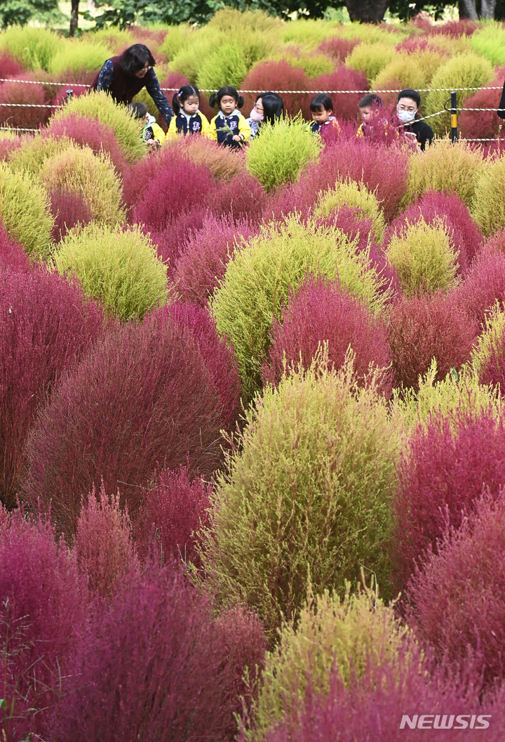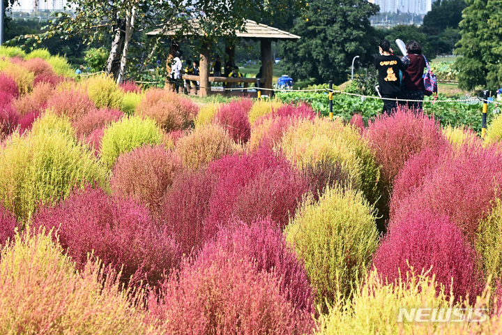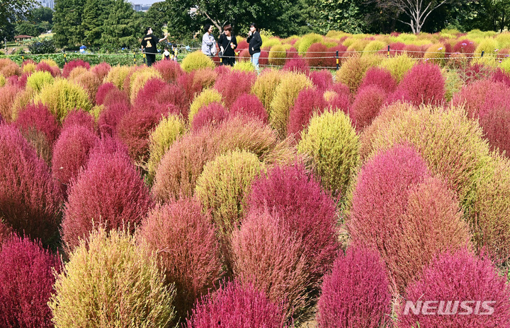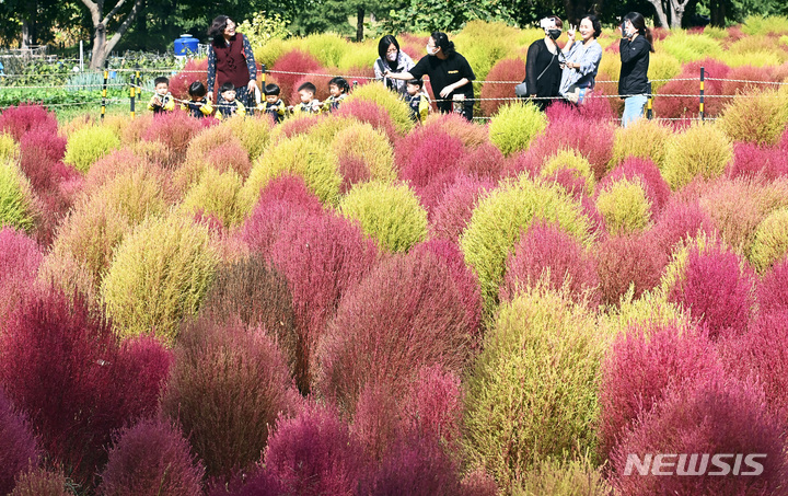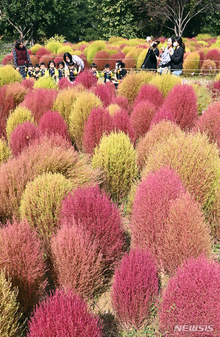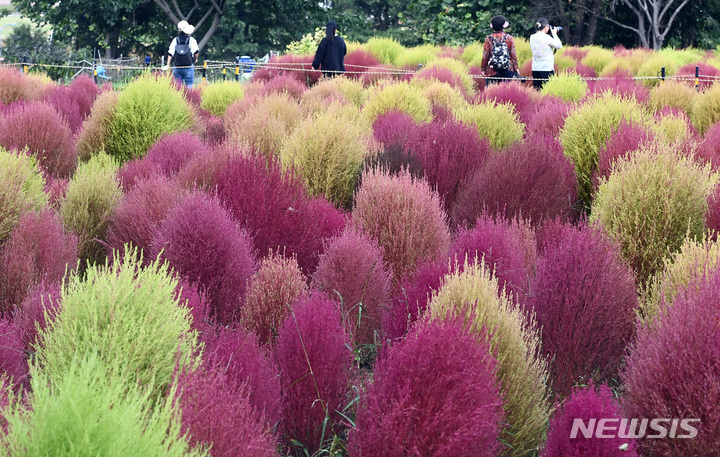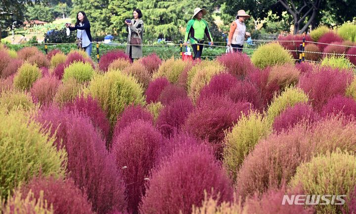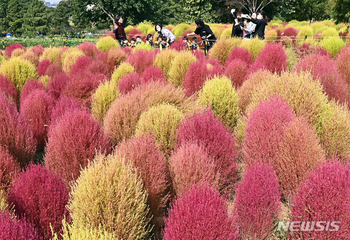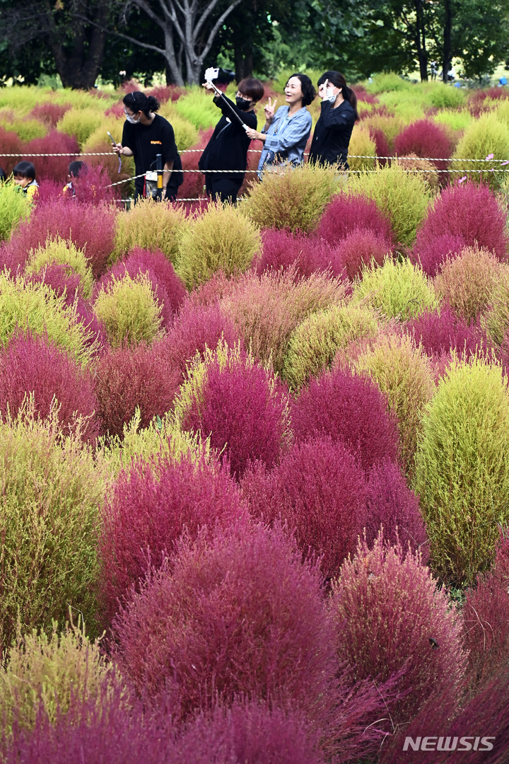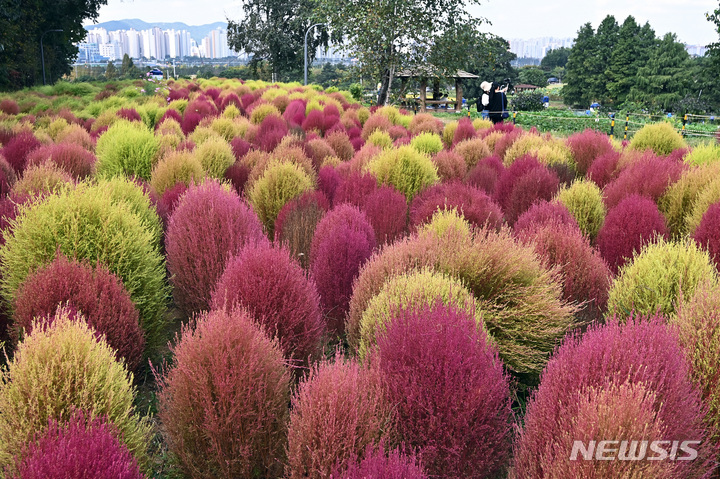 5日、京畿道水原市勧善区の塔洞市民農場では、訪れた人々が赤く染まりつつあるコキア(ほうき草)を眺めつつ秋の趣を満喫していた。
