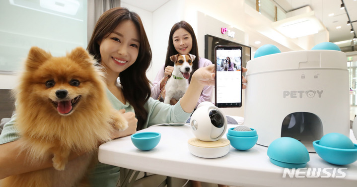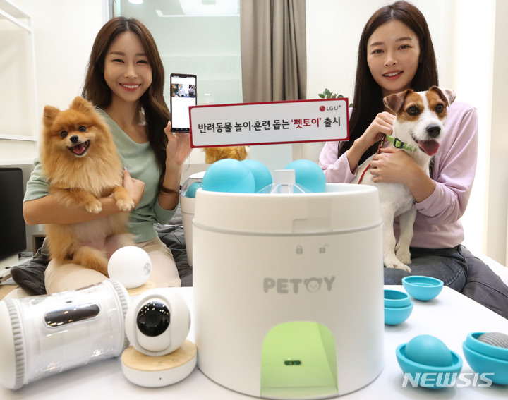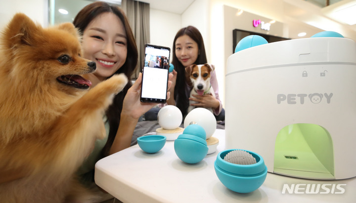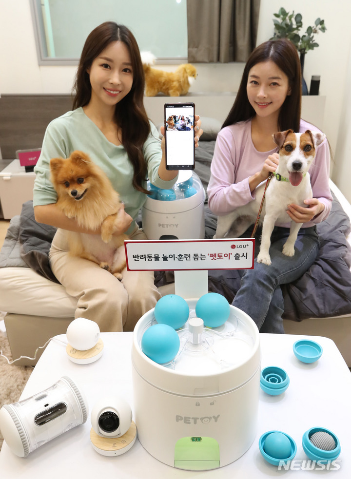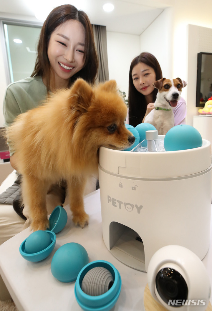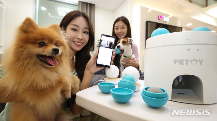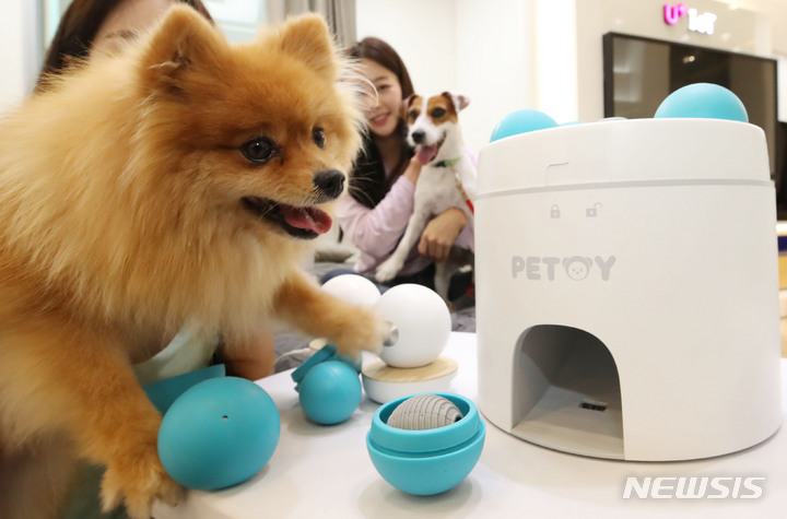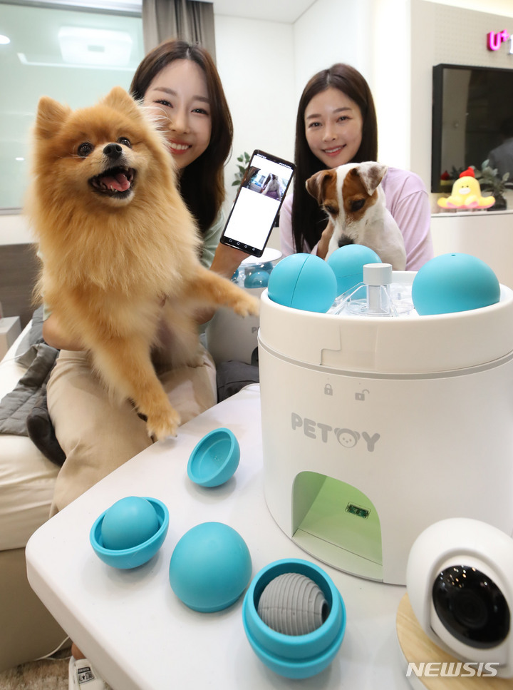 ソウル市竜山区のLG U+本社ホームメディア体験館で5日午前、コンパニオンが子犬と共に、同社のペット専用ホームIoT機器「ペットトイ」を紹介している。ペットトイは、おやつが入っているボールをリアルタイム・遠隔で送り出し、愛犬がボールの中に隠されたおやつを見つけ出せるようにする機器だ。