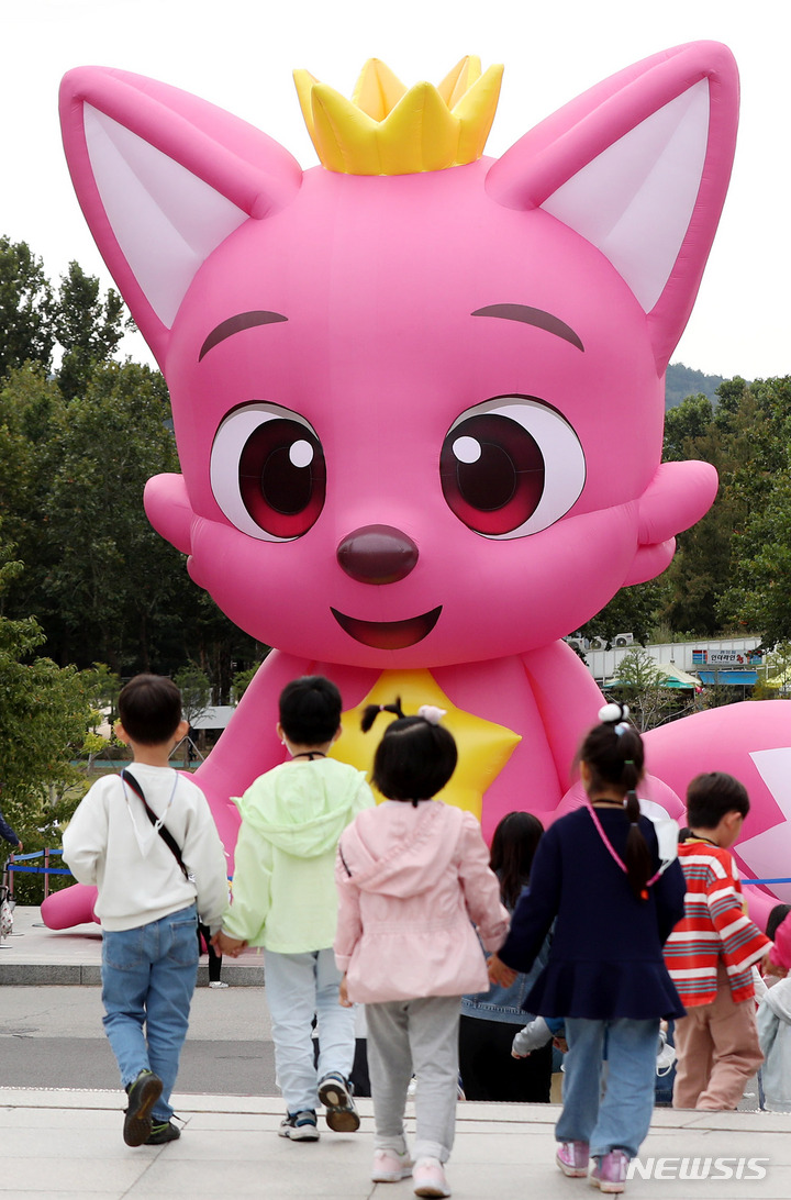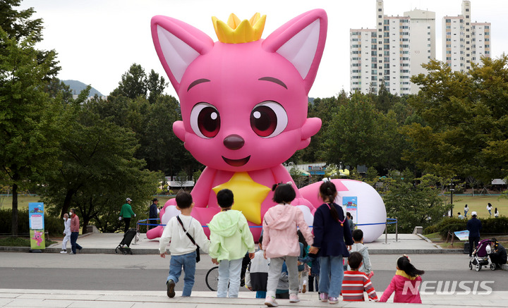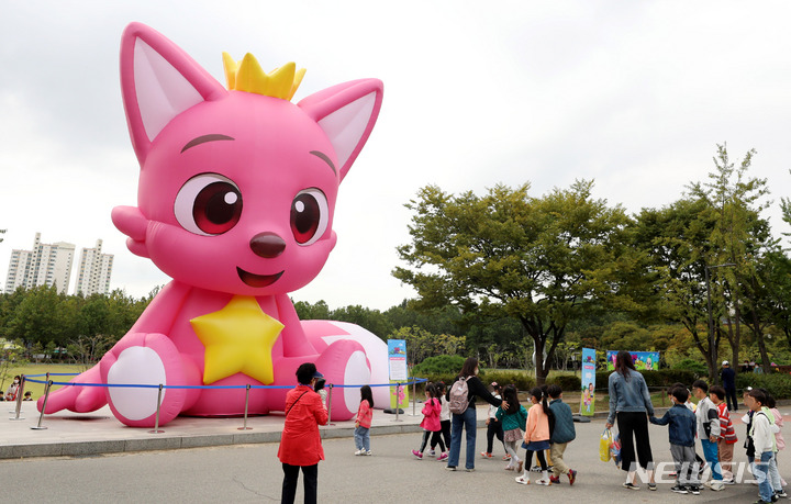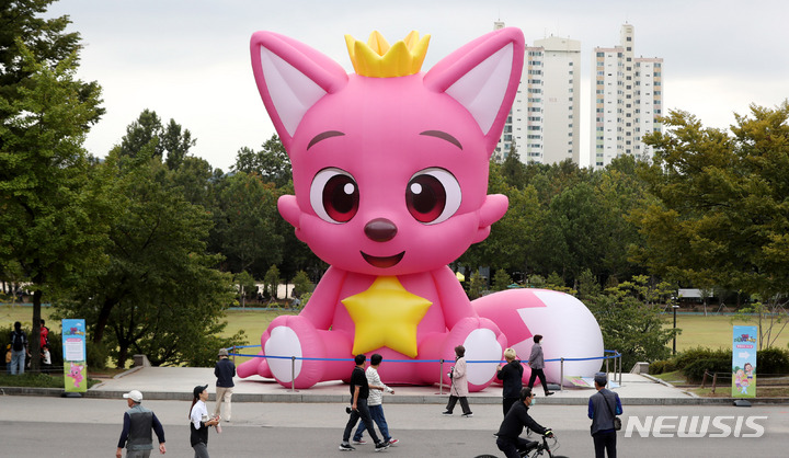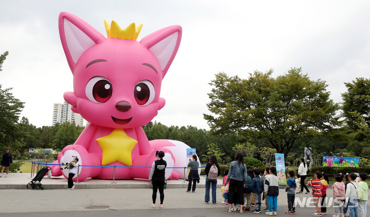 ソウル市銅雀区にあるポラメ公園で6日午前、市民たちが「ピンクフォン」のキャラクターの大型バルーンを眺めていた。このオブジェはポラメ公園を皮切りに、北ソウル夢の森、ソウル菖蒲園などで巡回展示される。