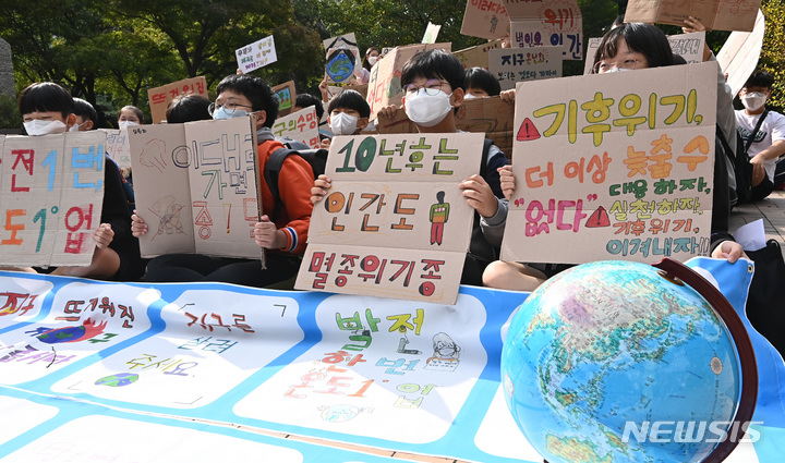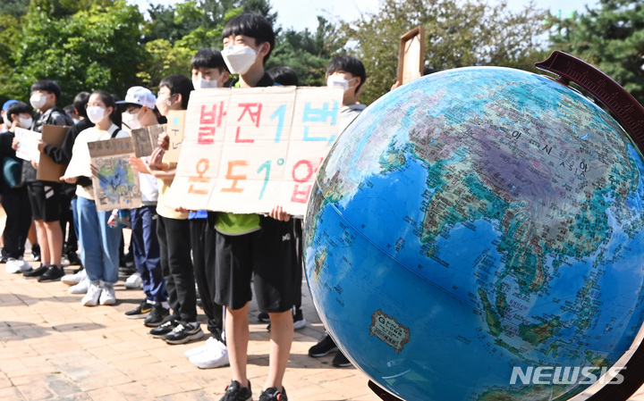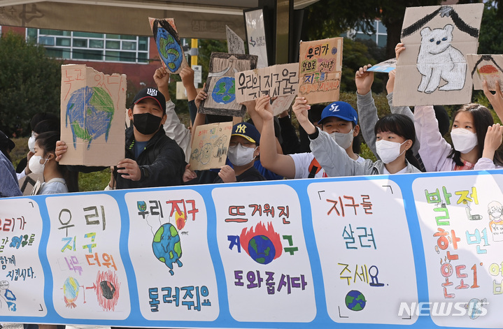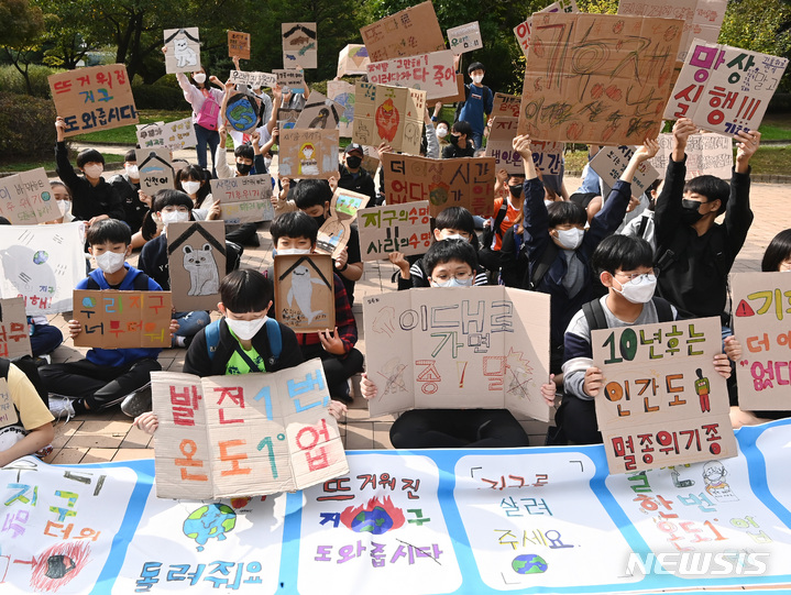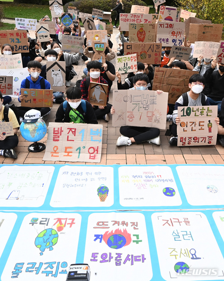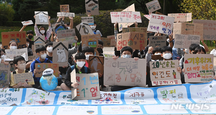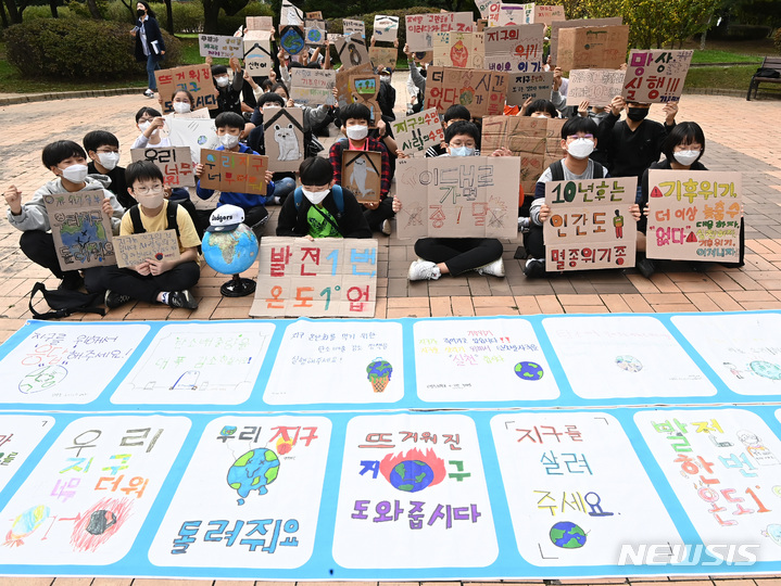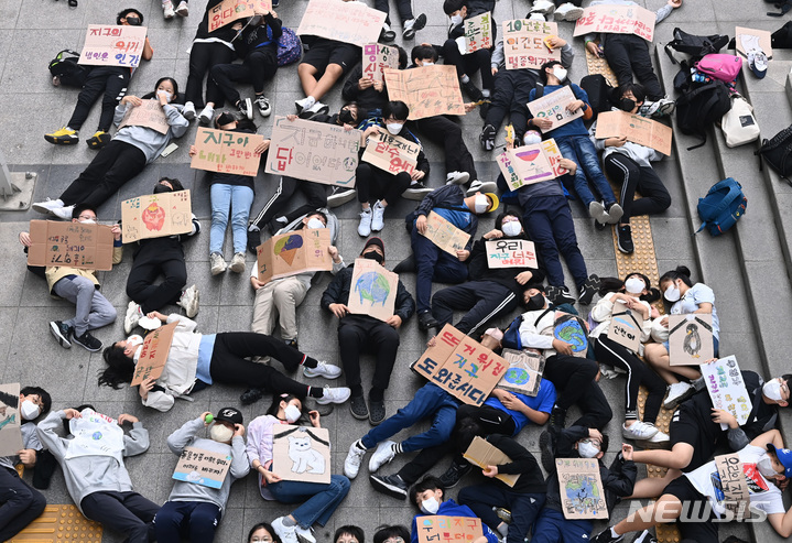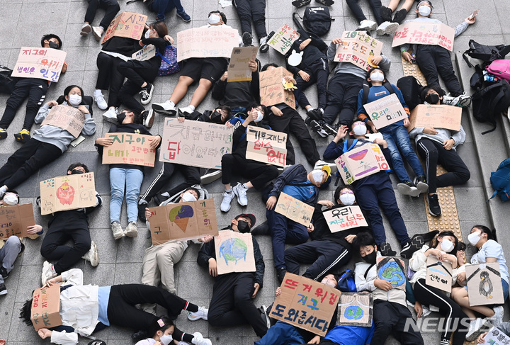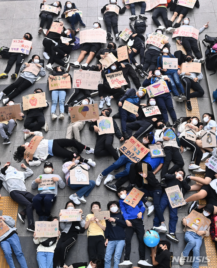 京畿道水原市八達区のオリンピック公園で6日、シンヨン小学校の児童たちをはじめ、水原環境運動連合、茶山人権センターなどの関係者たちが、気候変動による災難が人類の生存を脅かし、地球の生命の多様性を破壊するという意味を込めた「die-inパフォーマンス」を繰り広げた。