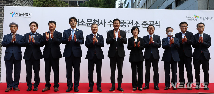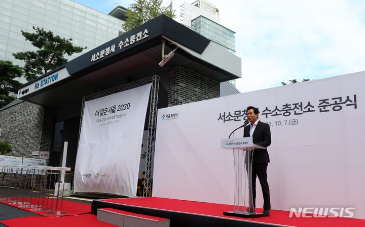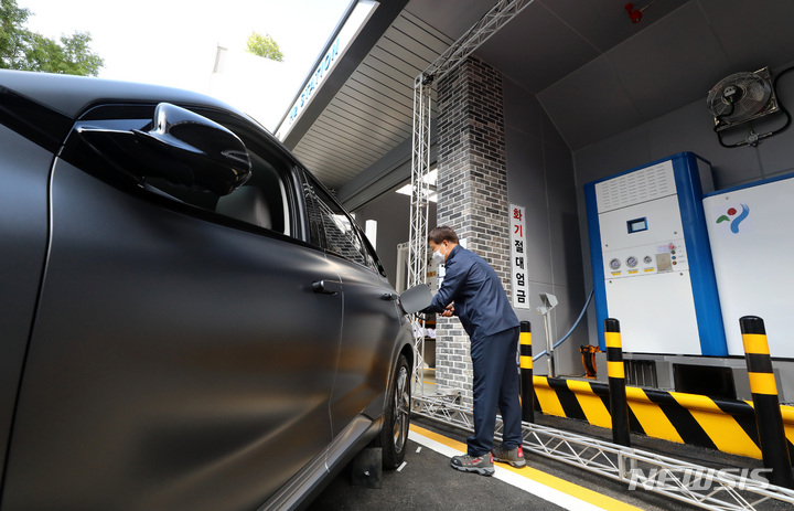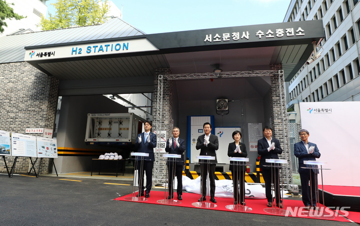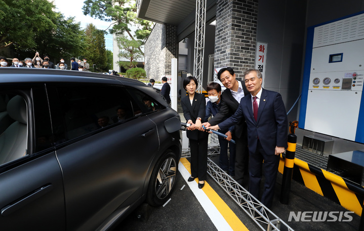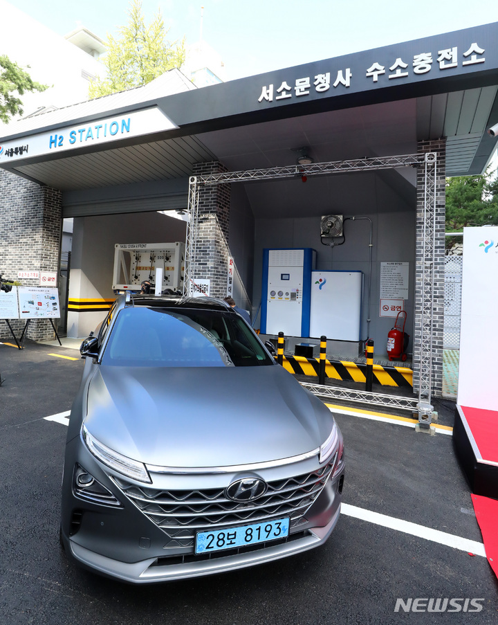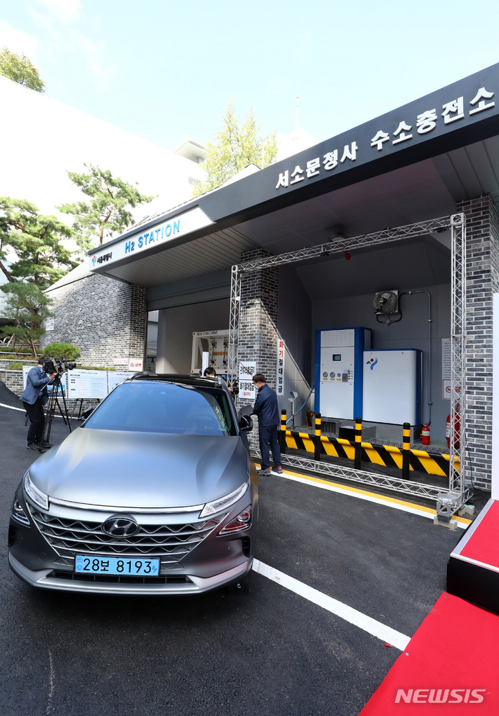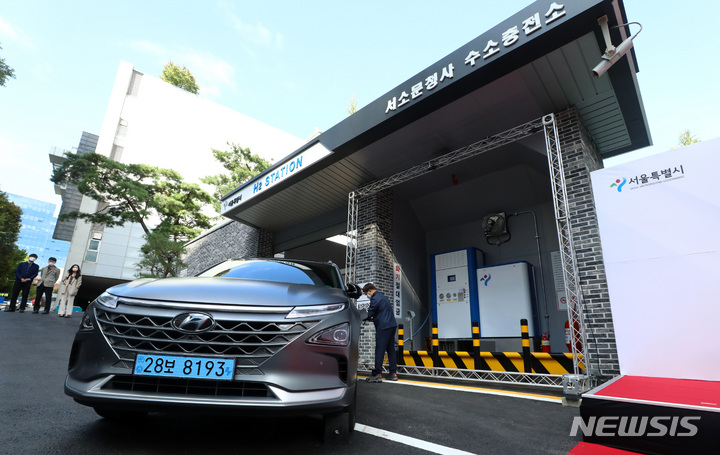 ソウル市中区のソウル市庁西小門庁舎第5棟前水素ステーションで7日午前、関係者らが燃料補充のデモンストレーションを行っている様子。