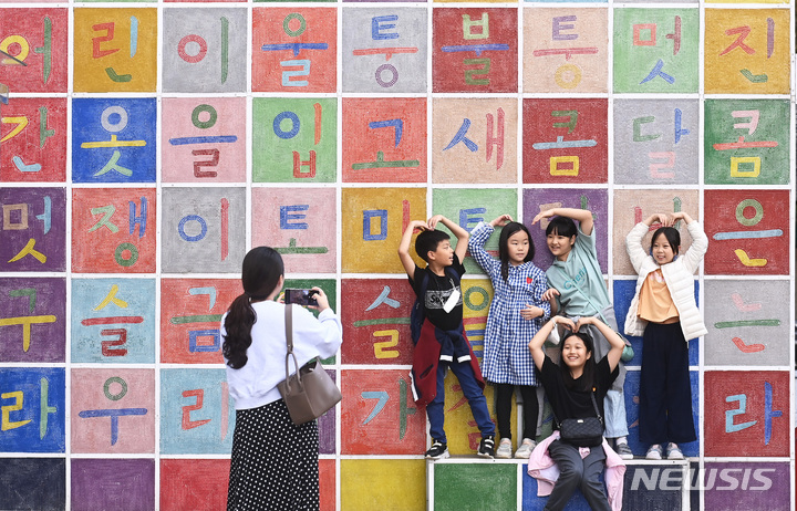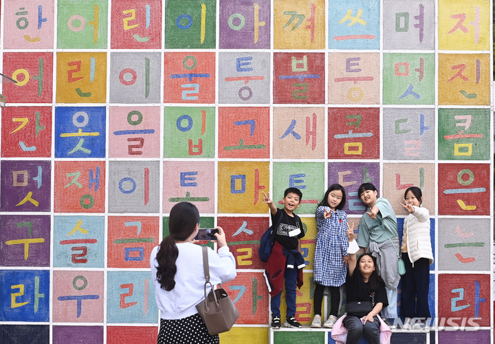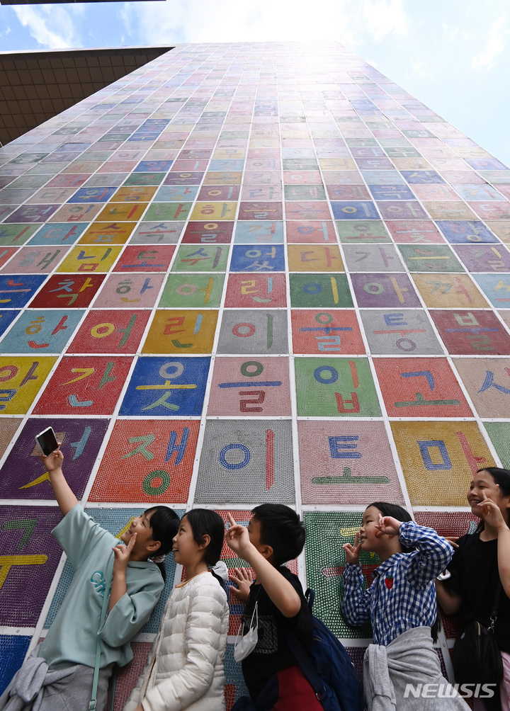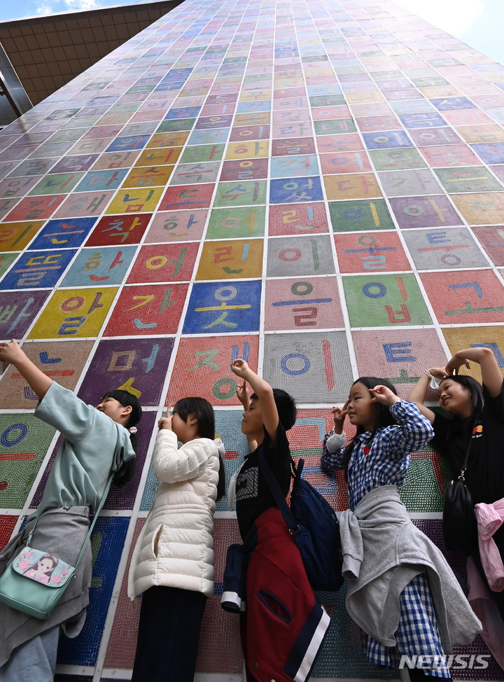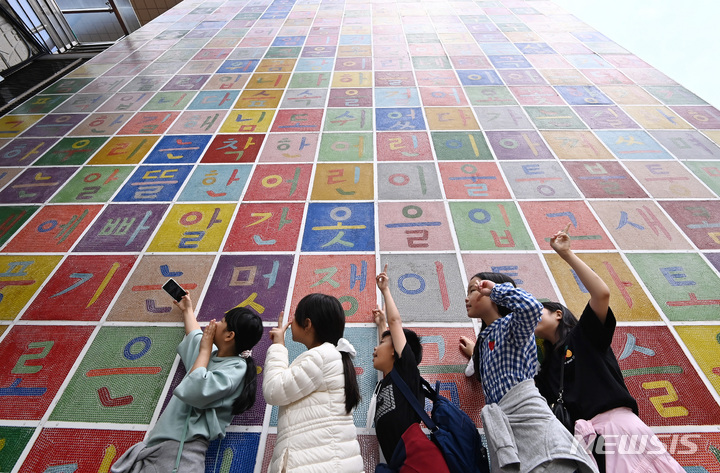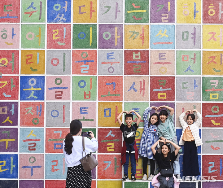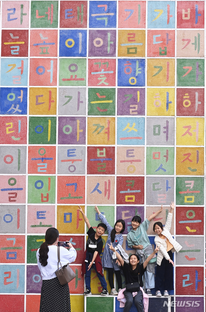 ハングルの日まであと二日となった7日午後、京畿道竜仁市器興区の京畿道子ども博物館を訪れた子どもたちが、カラフルなガラスタイルで作られたハングル壁画を背景に記念撮影をしているところ。