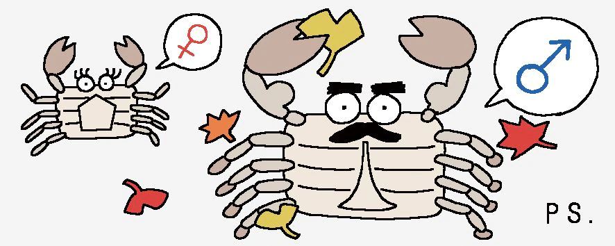 秋は腹側の甲羅がとがった形のオスガニの方が肉が詰まっていておいしい。手に持った時、ずっしりとしていて腹側が硬いカニを選ぶといい。