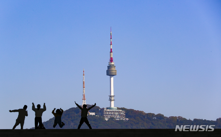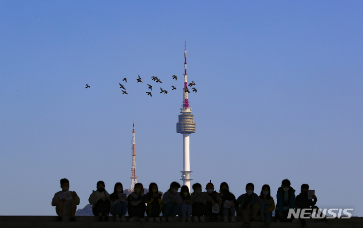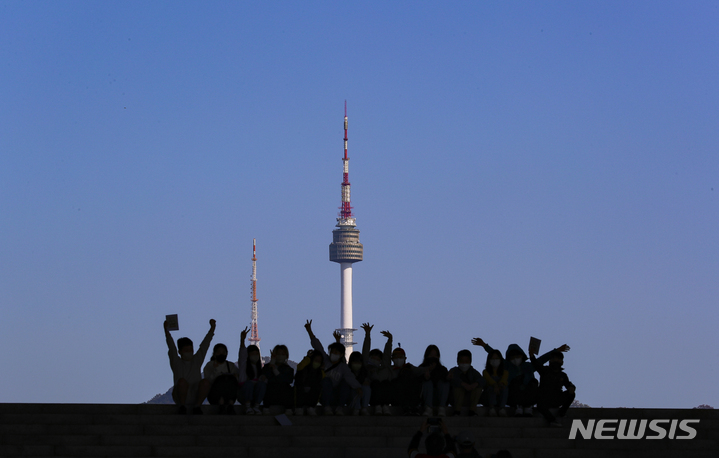 青空が広がった12日午前、ソウル市竜山区の国立中央博物館にやって来て楽しいひとときを過ごしている子どもたち。